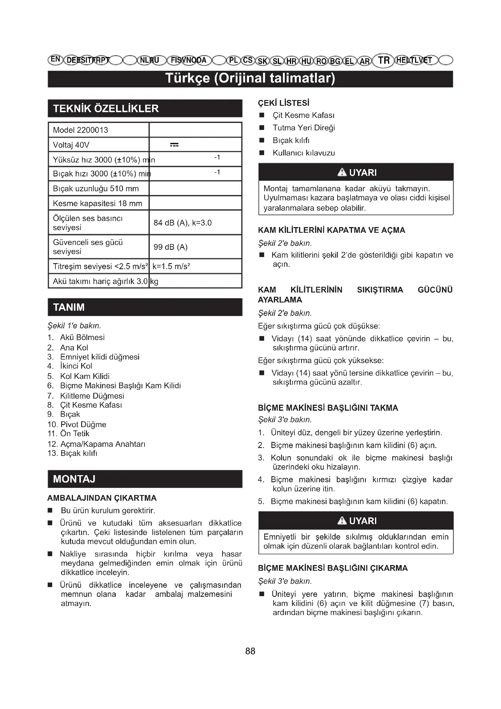 Çit Kesme Kafası Tutma Yeri Direği Bıçak kılıfı Kullanıcı kılavuzu UYARI Montaj tamamlanana kadar aküyü takmayın. Uyulmaması kazara başlatmaya ve olası ciddi kişisel yaralanmalara sebep olabilir. KAM KİLİTLERİNİ KAPATMA VE AÇMA Şekil 2'e bakın. Kam kilitlerini şekil 2’de gösterildiği gibi kapatın ve açın. KAM KİLİTLERİNİN SIKIŞTIRMA GÜCÜNÜ AYARLAMA Şekil 2'e bakın. Eğer sıkıştırma gücü çok düşükse: Vidayı (14) saat yönünde dikkatlice çevirin – bu, sıkıştırma gücünü artırır. Eğer sıkıştırma gücü çok yüksekse: Vidayı (14) saat yönü tersine dikkatlice çevirin – bu, sıkıştırma gücünü azaltır. BİÇME MAKİNESİ BAŞLIĞINI TAKMA Şekil 3'e bakın.