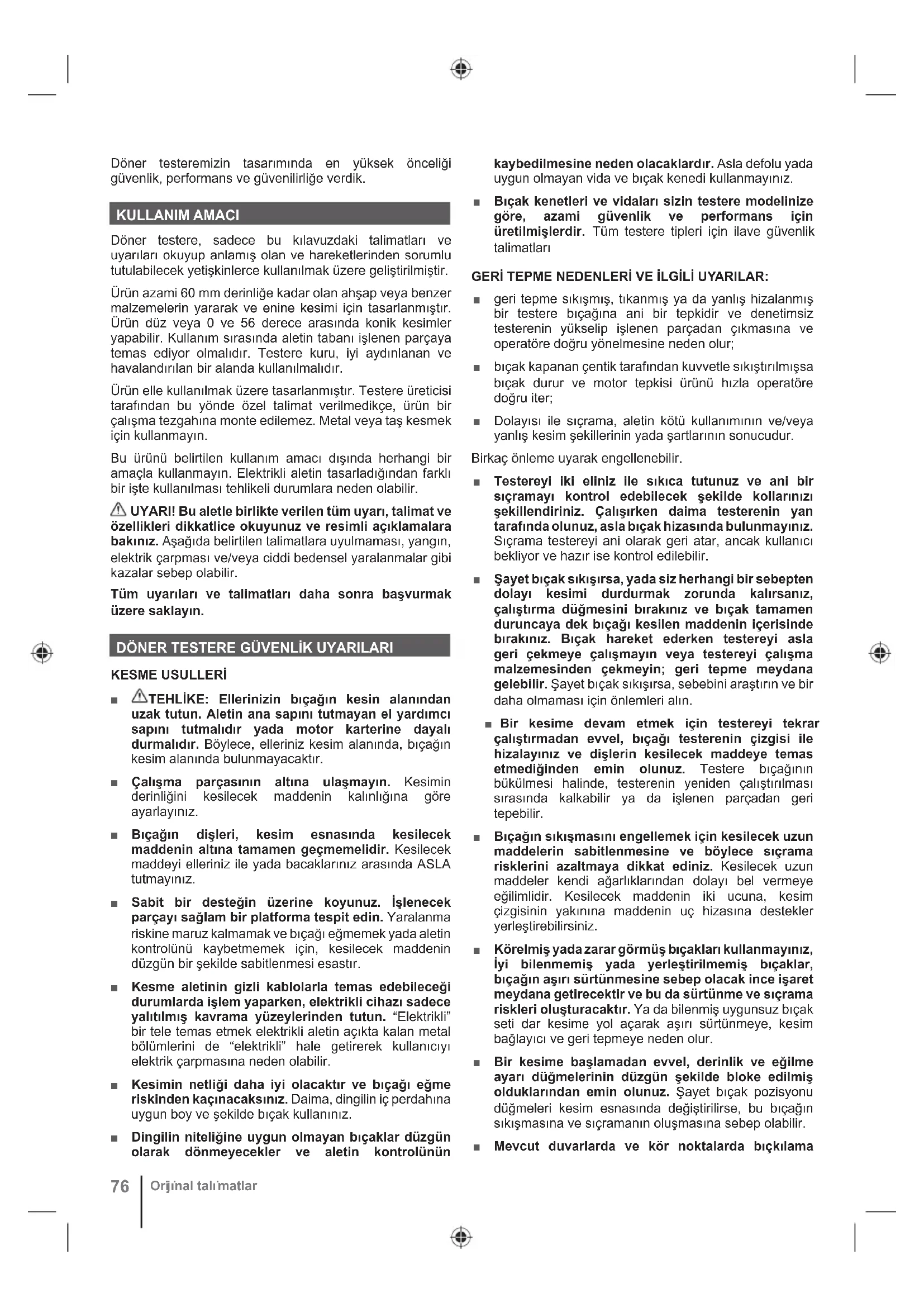 ELDöner testeremizin tasarımında en yüksek önceliği güvenlik, performans ve güvenilirliğe verdik. KULLANIM AMACI Döner testere, sadece bu kılavuzdaki talimatları ve uyarıları okuyup anlamış olan ve hareketlerinden sorumlu tutulabilecek yetişkinlerce kullanılmak üzere geliştirilmiştir. Ürün azami 60 mm derinliğe kadar olan ahşap veya benzer malzemelerin yararak ve enine kesimi için tasarlanmıştır. Ürün düz veya 0 ve 56 derece arasında konik kesimler yapabilir. Kullanım sırasında aletin tabanı işlenen parçaya temas ediyor olmalıdır. Testere kuru, iyi aydınlanan ve havalandırılan bir alanda kullanılmalıdır. Ürün elle kullanılmak üzere tasarlanmıştır. Testere üreticisi tarafından bu yönde özel talimat verilmedikçe, ürün bir çalışma tezgahına monte edilemez. Metal veya taş kesmek için kullanmayın. Bu ürünü belirtilen kullanım amacı dışında herhangi bir amaçla kullanmayın. Elektrikli aletin tasarladığ ından farklı bir işte kullanılması tehlikeli durumlara neden olabilir. UYARI! Bu aletle birlikte verilen tüm uyarı, talimat ve özellikleri dikkatlice okuyunuz ve resimli açıklamalara bakınız. Aşağıda belirtilen talimatlara uyulmaması, yangın, elektrik çarpması ve/veya ciddi bedensel yaralanmalar gibi kazalar sebep olabilir. Tüm uyarıları ve talimatları daha sonra başvurmak üzere saklayın. DÖNER TESTERE GÜVENLİK UYARILARI KESME USULLERİ ■ TEHLİKE: Ellerinizin bıçağın kesin alanından uzak tutun. Aletin ana sapını tutmayan el yardımcı sapını tutmalıdır yada motor karterine dayalı durmalıdır. Böylece, elleriniz kesim alanında, bıçağın kesim alanında bulunmayacaktır. ■ Çalışma parçasının altına ulaşmayın. Kesimin derinliğini kesilecek maddenin kalınlığına göre ayarlayınız. ■ Bıçağın dişleri, kesim esnasında kesilecek maddenin altına tamamen geçmemelidir. Kesilecek maddeyi elleriniz ile yada bacaklarınız arasında ASLA tutmayınız. ■ Sabit bir desteğin üzerine koyunuz. İşlenecek parçayı sağlam bir platforma tespit edin. Yaralanma riskine maruz kalmamak ve bıçağı eğmemek yada aletin kontrolünü kaybetmemek için, kesilecek maddenin düzgün bir şekilde sabitlenmesi esastır. ■ Kesme aletinin gizli kablolarla temas edebileceği durumlarda işlem yaparken, elektrikli cihazı sadece yalıtılmış kavrama yüzeylerinden tutun. “Elektrikli” bir tele temas etmek elektrikli aletin açıkta kalan metal bölümlerini de “elektrikli” hale getirerek kullanıcıyı elektrik çarpmasına neden olabilir. ■ Kesimin netliği daha iyi olacaktır ve bıçağı eğme riskinden kaçınacaksınız. Daima, dingilin iç perdahına uygun boy ve şekilde bıçak kullanınız. ■ Dingilin niteliğine uygun olmayan bıçaklar düzgün olarak dönmeyecekler ve aletin kontrolünün kaybedilmesine neden olacaklardır. Asla defolu yada uygun olmayan vida ve bıçak kenedi kullanmayınız. ■ Bıçak kenetleri ve vidaları sizin testere modelinize göre, azami güvenlik ve performans için üretilmişlerdir. Tüm testere tipleri için ilave güvenlik talimatları GERİ TEPME NEDENLERİ VE İLGİLİ UYARILAR: ■ geri tepme sıkışmış, tıkanmış ya da yanlış hizalanmış bir testere bıçağına ani bir tepkidir ve denetimsiz testerenin yükselip işlenen parçadan çıkmasına ve operatöre doğru yönelmesine neden olur; ■ bıçak kapanan çentik tarafından kuvvetle sıkıştırılmışsa bıçak durur ve motor tepkisi ürünü hızla operatöre doğru iter; ■ Dolayısı ile sıçrama, aletin kötü kullanımının ve/veya yanlış kesim şekillerinin yada şartlarının sonucudur. Birkaç önleme uyarak engellenebilir. ■ Testereyi iki eliniz ile sıkıca tutunuz ve ani bir sıçramayı kontrol edebilecek şekilde kollarınızı şekillendiriniz. Çalışırken daima testerenin yan tarafında olunuz, asla bıçak hizasında bulunmayınız. Sıçrama testereyi ani olarak geri atar, ancak kullanıcı bekliyor ve hazır ise kontrol edilebilir. ■ Şayet bıçak sıkışırsa, yada siz herhangi bir sebepten dolayı kesimi durdurmak zorunda kalırsanız, çalıştırma düğmesini bırakınız ve bıçak tamamen duruncaya dek bıçağı kesilen maddenin içerisinde bırakınız. Bıçak hareket ederken testereyi asla geri çekmeye çalışmayın veya testereyi çalışma malzemesinden çekmeyin; geri tepme meydana gelebilir. Şayet bıçak sıkışırsa, sebebini araştırın ve bir daha olmaması için önlemleri alın. ■ Bir kesime devam etmek için testereyi tekrar çalıştırmadan evvel, bıçağı testerenin çizgisi ile hizalayınız ve dişlerin kesilecek maddeye temas etmediğinden emin olunuz. Testere bıçağının bükülmesi halinde, testerenin yeniden çalıştırılması sırasında kalkabilir ya da işlenen parçadan geri tepebilir. ■ Bıçağın sıkışmasını engellemek için kesilecek uzun maddelerin sabitlenmesine ve böylece sıçrama risklerini azaltmaya dikkat ediniz. Kesilecek uzun maddeler kendi ağarlıklarından dolayı bel vermeye eğilimlidir. Kesilecek maddenin iki ucuna, kesim çizgisinin yakınına maddenin uç hizasına destekler yerleştirebilirsiniz. ■ Körelmiş yada zarar görmüş bıçakları kullanmayınız, İyi bilenmemiş yada yerleştirilmemiş bıçaklar, bıçağın aşırı sürtünmesine sebep olacak ince işaret meydana getirecektir ve bu da sürtünme ve sıçrama riskleri oluşturacaktır. Ya da bilenmiş uygunsuz bıçak seti dar kesime yol açarak aşırı sürtünmeye, kesim bağlayıcı ve geri tepmeye neden olur. ■ Bir kesime başlamadan evvel, derinlik ve eğilme ayarı düğmelerinin düzgün şekilde bloke edilmiş olduklarından emin olunuz. Şayet bıçak pozisyonu düğmeleri kesim esnasında değiştirilirse, bu bıçağın sıkışmasına ve sıçramanın oluşmasına sebep olabilir. ■ Mevcut duvarlarda ve kör noktalarda bıçkılama