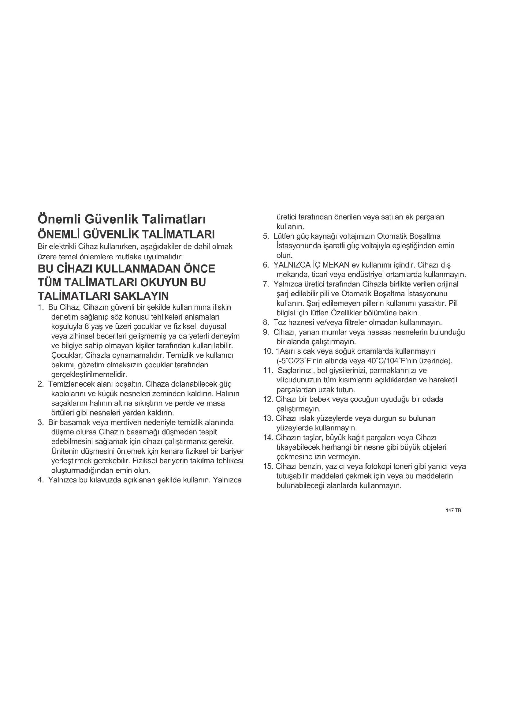 şarj edilebilir pili ve Otomatik Boşaltma İstasyonunu kullanın. Şarj edilemeyen pillerin kullanımı yasaktır. Pil bilgisi için lütfen Özellikler bölümüne bakın.