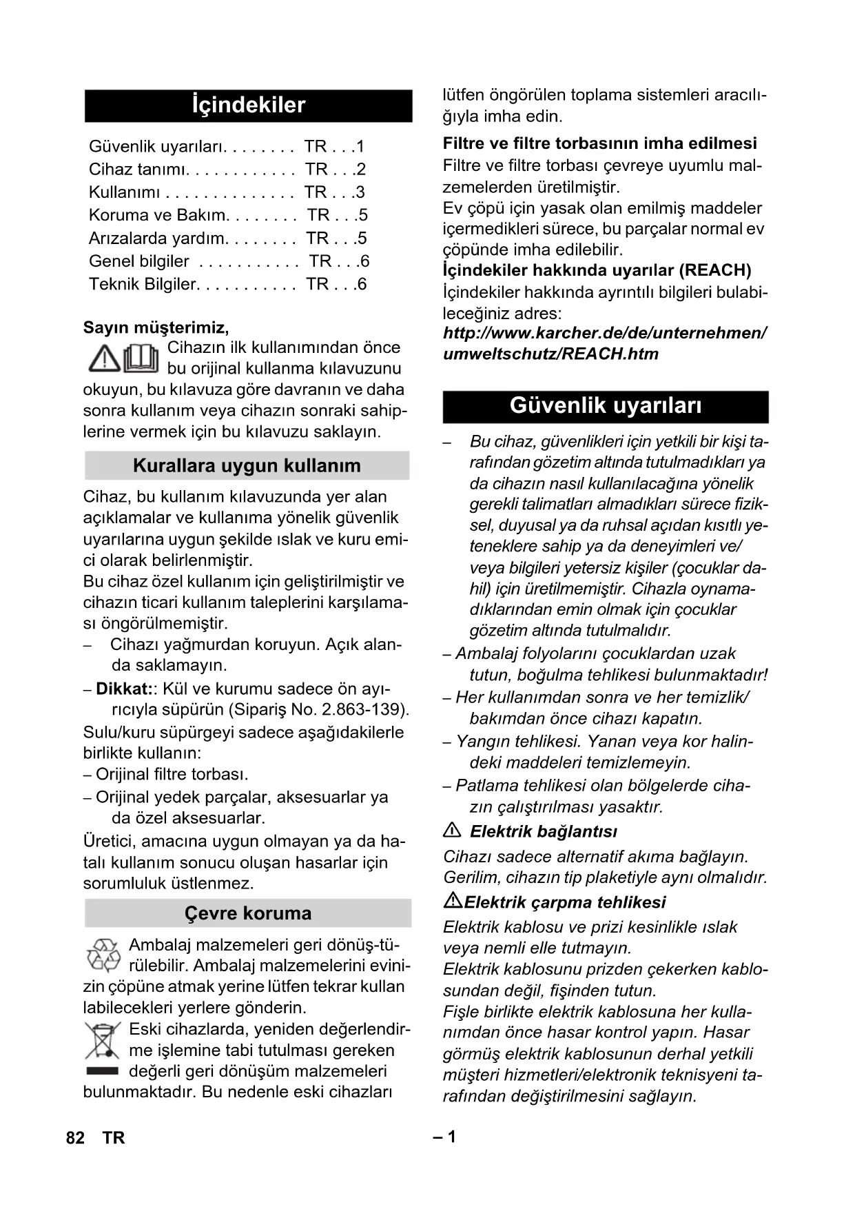 - Καλώδιο τροφοδοσίας Στάθμη ακουστικής πίεσης (EN 60704-2-1) Βάρος (χωρίς παρελκόμενα) 81EL– 1 Sayın müşterimiz, Cihazın ilk kullanımından önce bu orijinal kullanma kılavuzunu okuyun, bu kılavuza göre davranın ve daha sonra kullanım veya cihazın sonraki sahip- lerine vermek için bu kılavuzu saklayın. Cihaz, bu kullanım kılavuzunda yer alan açıklamalar ve kullanıma yönelik güvenlik uyarılarına uygun şekilde ıslak ve kuru emi- ci olarak belirlenmiştir. Bu cihaz özel kullanım için geliştirilmiştir ve cihazın ticari kullanım taleplerini karşılama- sı öngörülmemiştir. – Cihazı yağmurdan koruyun. Açık alan- da saklamayın. – Dikkat:: Kül ve kurumu sadece ön ayı- rıcıyla süpürün (Sipariş No. 2.863-139). Sulu/kuru süpürgeyi sadece aşağıdakilerle birlikte kullanın: – Orijinal filtre torbası. – Orijinal yedek parçalar, aksesuarlar ya da özel aksesuarlar. Üretici, amacına uygun olmayan ya da ha- talı kullanım sonucu oluşan hasarlar için sorumluluk üstlenmez. Ambalaj malzemeleri geri dönüş-tü- rülebilir. Ambalaj malzemelerini evini- zin çöpüne atmak yerine lütfen tekrar kullan labilecekleri yerlere gönderin. Eski cihazlarda, yeniden değerlendir- me işlemine tabi tutulması gereken değerli geri dönüşüm malzemeleri bulunmaktadır. Bu nedenle eski cihazları lütfen öngörülen toplama sistemleri aracılı- ğıyla imha edin. Filtre ve filtre torbası çevreye uyumlu mal- zemelerden üretilmiştir. Ev çöpü için yasak olan emilmiş maddeler içermedikleri sürece, bu parçalar normal ev çöpünde imha edilebilir. İçindekiler hakkında uyarılar (REACH) İçindekiler hakkında ayrıntılı bilgileri bulabi- leceğiniz adres: http://www.karcher.de/de/unternehmen/ umweltschutz/REACH.htm – Bu cihaz, güvenlikleri için yetkili bir kişi ta- rafından gözetim altında tutulmadıkları ya da cihazın nasıl kullanılacağına yönelik gerekli talimatları almadıkları sürece fizik- sel, duyusal ya da ruhsal açıdan kısıtlı ye- teneklere sahip ya da deneyimleri ve/ veya bilgileri yetersiz kişiler (çocuklar da- hil) için üretilmemiştir. Cihazla oynama- dıklarından emin olmak için çocuklar gözetim altında tutulmalıdır. – Ambalaj folyolarını çocuklardan uzak tutun, boğulma tehlikesi bulunmaktadır! – Her kullanımdan sonra ve her temizlik/ bakımdan önce cihazı kapatın. – Yangın tehlikesi. Yanan veya kor halin- deki maddeleri temizlemeyin. – Patlama tehlikesi olan bölgelerde ciha- zın çalıştırılması yasaktır. 몇 Elektrik bağlantısı Cihazı sadece alternatif akıma bağlayın. Gerilim, cihazın tip plaketiyle aynı olmalıdır. Elektrik çarpma tehlikesi Elektrik kablosu ve prizi kesinlikle ıslak veya nemli elle tutmayın. Elektrik kablosunu prizden çekerken kablo- sundan değil, fişinden tutun. Fişle birlikte elektrik kablosuna her kulla- nımdan önce hasar kontrol yapın. Hasar görmüş elektrik kablosunun derhal yetkili müşteri hizmetleri/elektronik teknisyeni ta- rafından değiştirilmesini sağlayın. İçindekiler Güvenlik uyarıları