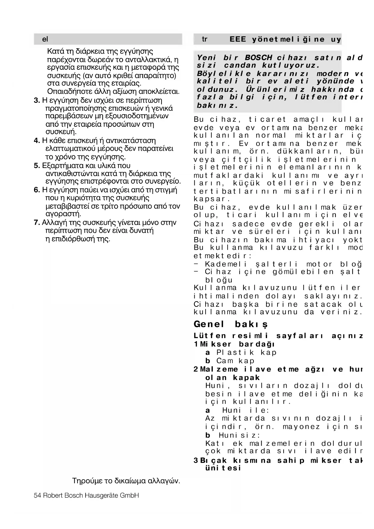 ðåñßðôùóç ðïõ äåí åßíáé äõíáôÞ ç åðéäéüñèùóÞ ôçò. Bu cihaz, ticaret amaçlý kullaným için deðil, evde veya ev ortamýna benzer mekanlarda kullanýlan normal miktarlar için tasarlan- mýþtýr. Ev ortamýna benzer mekanlardaki kullaným, örn. dükkanlarýn, bürolarýn, çiftlik veya çiftçilik iþletmelerinin ve diðer sanayi iþletmelerinin elemanlarýnýn kullandýðý mutfaklardaki kullanýmý ve ayrýca pansiyon- larýn, küçük otellerin ve benzeri mesken tertibatlarýnýn misafirlerinin kullanýmýný kapsar. Bu cihaz, evde kullanýlmak üzere üretilmiþ olup, ticari kullaným için elveriþli deðildir. Cihazý sadece evde gerekli olan iþleme miktar ve süreleri için kullanýnýz. Bu cihazýn bakýma ihtiyacý yoktur. Bu kullanma kýlavuzu farklý modelleri tarif etmektedir: — Kademeli þalterli motor bloðu — Cihaz içine gömülebilen þalterli motor bloðu Kullanma kýlavuzunu lütfen ileride lazým olma ihtimalinden dolayý saklayýnýz. Cihazý baþka birine satacak olursanýz, kullanma kýlavuzunu da veriniz. Genel bakýþ Lütfen resimli sayfalarý açýnýz. 1 Mikser bardaðý a Plastik kap b Cam kap 2 Malzeme ilave etme aðzý ve hunisi olan kapak Huni, sývýlarýn dozajlý doldurulmasý ve besin ilave etme deliðinin kapatýlmasý için kullanýlýr. a Huni ile: Az miktarda sývýnýn dozajlý ilave edilmesi içindir, örn. mayonez için sývý yað. b Hunisiz: Katý ek malzemelerin doldurulmasý ve çok miktarda sývý ilave edilmesi içindir. 3 Býçak kýsmýna sahip mikser takma ünitesi