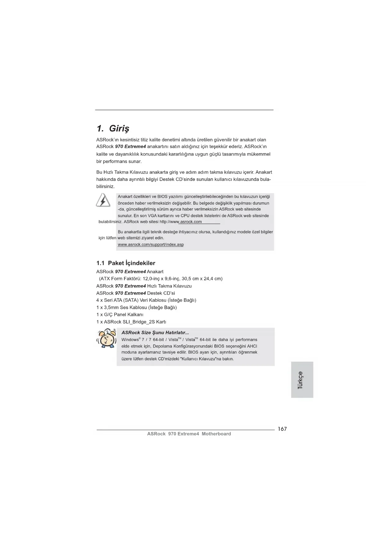 ASRock’ın kesintisiz titiz kalite denetimi altında üretilen güvenilir bir anakart olan ASRock 970 Extreme4 anakartını satın aldığınız için teşekkür ederiz. ASRock’ın kalite ve dayanıklılık konusundaki kararlılığına uygun güçlü tasarımıyla mükemmel bir performans sunar. Bu Hızlı Takma Kılavuzu anakarta giriş ve adım adım takma kılavuzu içerir. Anakart hakkında daha ayrıntılı bilgiyi Destek CD’sinde sunulan kullanıcı kılavuzunda bula- bilirsiniz. Anakart özellikleri ve BIOS yazılımı güncelleştirilebileceğinden bu kılavuzun içeriği önceden haber verilmeksizin değişebilir. Bu belgede değişiklik yapılması durumun -da, güncelleştirilmiş sürüm ayrıca haber verilmeksizin ASRock web sitesinde sunulur. En son VGA kartlarını ve CPU destek listelerini de ASRock web sitesinde bulabilirsiniz. ASRock web sitesi http://www.asrock.com Bu anakartla ilgili teknik desteğe ihtiyacınız olursa, kullandığınız modele özel bilgiler için lütfen web sitemizi ziyaret edin. www.asrock.com/support/index.asp