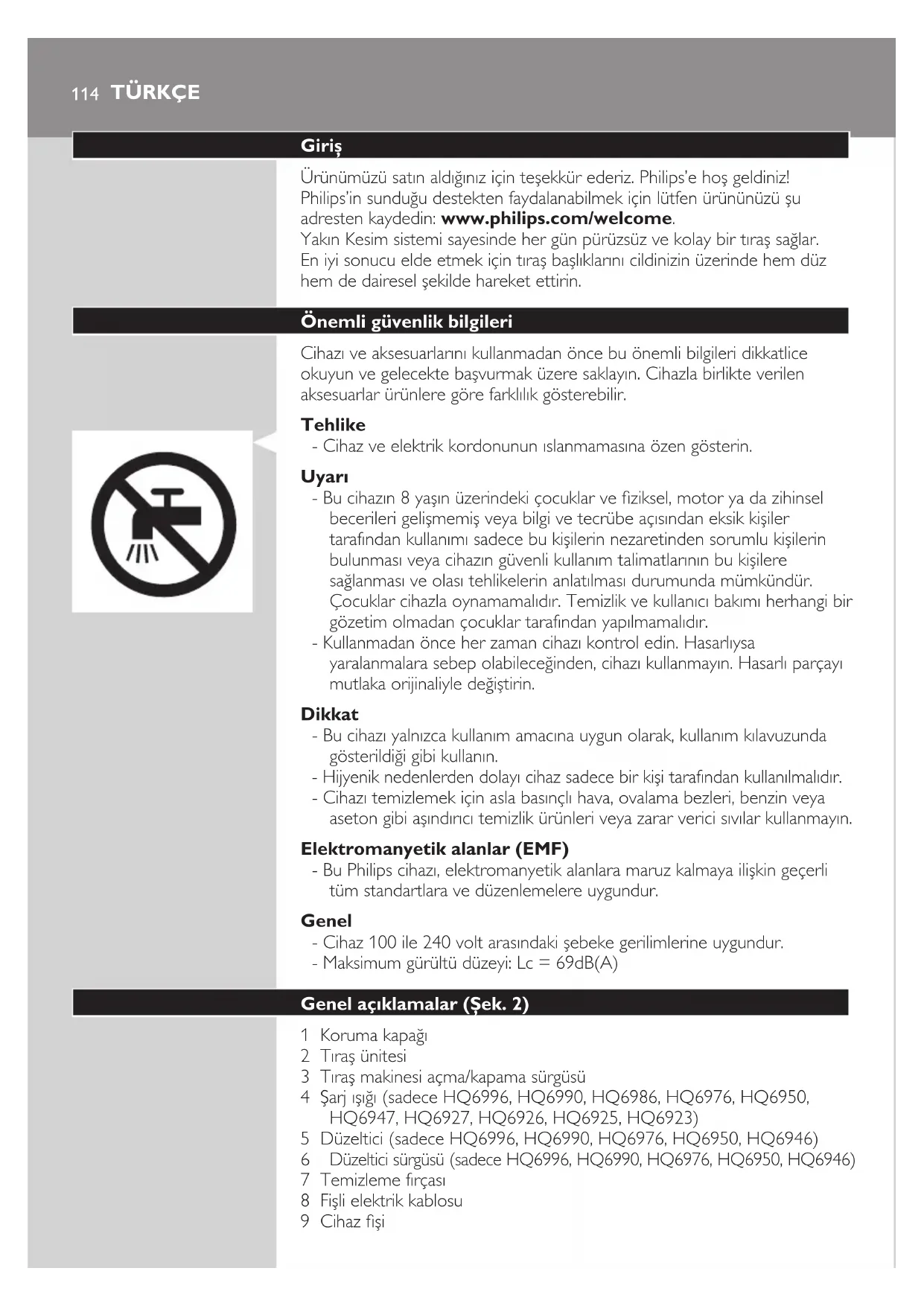 Düzeltici sürgüsü (sadece HQ6996, HQ6990, HQ6976, HQ6950, HQ6946) 7 Temizleme fırçası 8 Fişli elektrik kablosu 9 Cihaz şi TÜRKÇEŞarj etme Cihazı aşağıdaki durumlarda şarj edin: - ilk kullanımdan önce ve cihazı uzun süre kullanmadıysanız - motor duruyorsa veya yavaş çalışıyorsa Cihazı ilk defa ve uzun bir süre kullanmadıktan sonra şarj ettiğinizde pil kapasitesini aşağıdaki şekilde en iyi duruma getirin: 1 Tıraşmakinesinitamamenşarjedinvepiltamamenboşalanakadar normalbiçimdekullanın.Buişlemiarkaarkayaikidefatekraredin. Pilleribuşekildeoptimizeederseniz,piltamamenbitmemişolsabile tıraşsırasındapilinbitmesiniönlemekiçintıraşmakinesiniikitıraş arasındaşarjedebilirsiniz. Tıraş makinesinin şarj edilmesi (sadece HQ6996, HQ6990, HQ6986, HQ6976, HQ6950, HQ6947, HQ6927, HQ6926, HQ6925, HQ6923) Hızlı şarj (sadece HQ6996, HQ6990, HQ6986) Tıraş makinesi 3 dakika şarj olduğunda, bir kablosuz tıraş işlemi için yeterli güce sahip olur. Adaptörle şarj etme 1 Cihazınşinitıraşmakinesinetakın. 2 Elektrikşiniprizetakın. Dikkat: Tıraş makinesinin kapalı olduğundan emin olun. , Şarjışığıyanar. , HQ6996,HQ6990,HQ6986:Tıraşmakinesinienaz1saatşarjedin, ancak24saattenfazlaşarjetmeyin. Pil tamamen şarj olduğunda, şarj ışığı yanıp sönmeye başlar. , HQ6976, HQ6950, HQ6947, HQ6927, HQ6926, HQ6925, HQ6923: Tıraşmakinesinienaz8saatşarjedin,ancak24saattenfazlaşarj etmeyin. Cihaz elektriğe bağlıyken şarj ışığı sürekli olarak yanar. Dikkat: Tıraş makinesini sürekli elektriğe bağlı bırakmayın. Dikkat: Tıraş makinesini şarj etmeden, elektriğe bağlayarak da tıraş olabilirsiniz. 3 Piltamamendolduğundaşiprizdençekinvecihazınşinitıraş makinesindençıkarın. Cihazın kullanımı Yalnızca HQ6996, HQ6990, HQ6986, HQ6976, HQ6950, HQ6947, HQ6927, HQ6926, HQ6925, HQ6923: Tıraş makinesini doğrudan elektriğe bağlıyken veya kablosuz olarak kullanabilirsiniz. HQ6946, HQ6906, HQ6902: Tıraş makinesini yalnızca doğrudan elektriğe bağlıyken kullanabilirsiniz. TÜRKÇE 115Cihazın kullanıma hazırlanması (Yalnızca HQ6946, HQ6906, HQ6902) 1 Cihazınşinitıraşmakinesinetakın. 2 Elektrikşiniprizetakın. Tıraş olma 1 Açma/kapamadüğmesiniyukarıiterekcihazıçalıştırın. 2 Tıraşbaşlıklarınıdaireselhareketleryaparakcildinizinüzerinde dolaştırın. Kuru cilt üzerinde yapılan tıraş en iyi sonucu verir. Cildinizin Philips tıraş sistemine alışması 2 ile 3 hafta sürebilir. 3 Açma/kapamadüğmesiniaşağıbasaraktıraşmakinesinikapatın. 4 Tıraşmakinesininbaşlıklarını,hasargörmemeleriiçinherkullanımdan sonrakoruyucukapakilekapatın. Düzeltme (sadece HQ6996, HQ6990, HQ6976, HQ6950, HQ6946) Favorilerinizi ve bıyığınızı düzeltmek için düzelticiyi kullanabilirsiniz. 1 Düzelticiyiaçmakiçindüzelticisürgüsünüyukarıdoğruitin. Motor çalışırken düzelticiyi aktif hale getirebilirsiniz. Temizlik ve bakım Cihazı düzenli olarak temizlemek daha iyi tıraş performansı sağlar. Bucihazyıkanamaz.Cihazıaslasuyabatırmayınveyamuslukaltında durulamayın. Cihazıtemizlemekiçinbulaşıksüngeri,aşındırıcıtemizlikmalzemeleri veyabenzinyadaasetongibizararverebileceksıvılarkullanmayın. - Etkili ve kolay temizlik için Philips Tıraş Başlığı Temizleme Spreyi (model HQ110) kullanın. Bilgi için Philips bayinize başvurun. Dikkat: Philips Tıraş Başlığı Temizleme Spreyi her ülkede bulunmayabilir. Bu aksesuarın bulunup bulunmadığı hakkında bilgi için ülkenizdeki Müşteri Hizmetleri’ne başvurun. Tıraş makinesini aşağıda açıklanan şekilde de temizleyebilirsiniz: TÜRKÇE116Haftada bir: tıraş ünitesi ve kıl toplama haznesi 1 Tıraşmakinesinikapatın.Fişiniprizdençekinvecihazınşinitıraş makinesindençıkartın. 2 Öncecihazınüstkısmınıtemizleyin.Cihazlabirlikteverilentemizleme fırçasınıkullanın. 3 Ayırmadüğmesine(1)basınvetıraşünitesini(2)çıkartın. 4 Tıraşünitesivekıltoplamahaznesininiçkısmınıtemizlemefırçasıyla temizleyin. 5 Tıraşünitesinitekrartıraşmakinesinetakın.