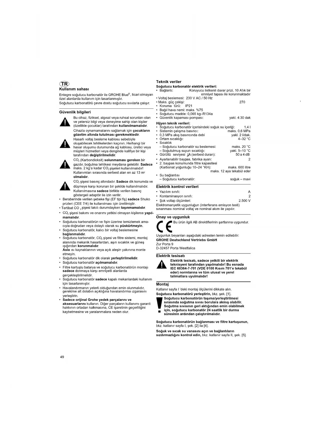 - Şok voltajı ölçümleri: 2.500 V Elektromanyetik uygunluğun (interferans emisyon testi) sınanması nominal voltaj ve nominal akım ile yapılır. Onay ve uygunluk Uygunluk beyanları aşağıdaki adresten temin edilebilir: GROHE Deutschland Vertriebs GmbH Zur Porta 9 D-32457 Porta Westfalica Elektrik tesisatı Elektrik tesisatı, sadece yetkili bir elektrik teknisyeni tarafından yapılmalıdır! Bu esnada IEC 60364-7-701 (VDE 0100 Kısım 701’e tekabül eder) normlarına ve tüm ulusal ve yerel talimatlara uyulmalıdır! Montaj Katlanır sayfa I ’deki montaj ölçülerini dikkate alın. Soğutucu karbonatörü yerleştirin, bkz. şek. [1]. Soğutucu karbonatörün taşıma/yerleştirilmesi sırasında soğutma sıvısı borulara akmış olabilir. Soğutma sıvısının geri aktığından emin olabilmek için, soğutucu karbonatör 24 saatlik bir durma süresinin ardından çalıştırılmalıdır. Soğutucu karbonatörün bağlanması ve filtre kartuşunun, bkz. katlanır sayfa I, şek. [2] ila [4]. Soğuk ve sıcak su vanasını açın ve bağlantıların sızdırmazlığını kontrol edin, bkz. katlanır sayfa II, şek. [5]. Bu ürün ilgili AB direktiflerinin şartlarına uygundur.50 Batarya ve soğutucu karbonatör arasında priz bağlantısını oluşturun, şek. [6]. Voltaj beslemesini şebeke fişi üzerinden oluşturun, bkz. şek. [7]. Ekrandaki gösterge yanar ve kalan filtre kapasitesi yüzde olarak görüntülenir.