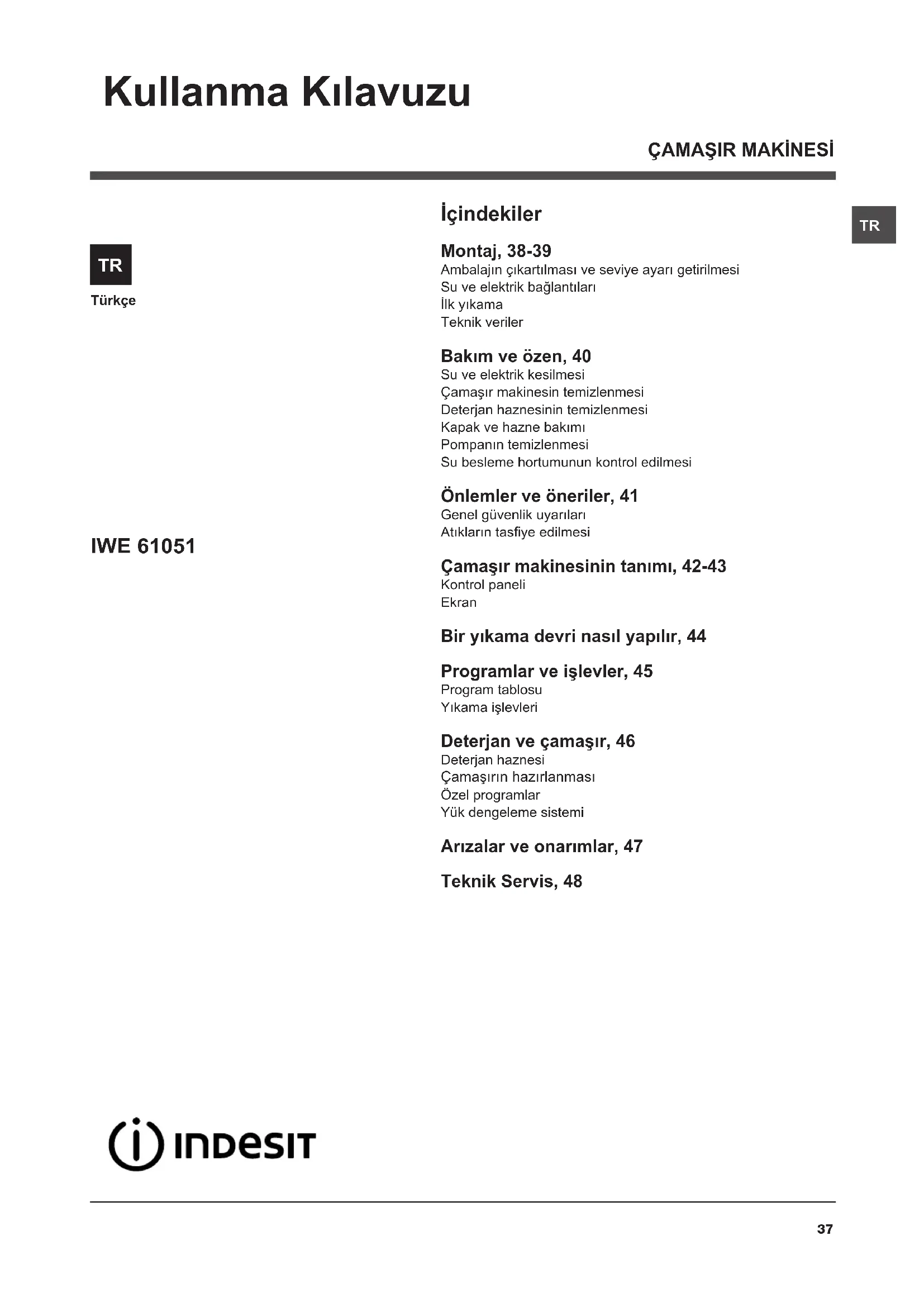 Türkçe İçindekiler Montaj, 38-39 Ambalajın çıkartılması ve seviye ayarı getirilmesiSu ve elektrik bağlantılarıİlk yıkamaTeknik veriler Bakım ve özen, 40 Su ve elektrik kesilmesiÇamaşır makinesin temizlenmesiDeterjan haznesinin temizlenmesiKapak ve hazne bakımıPompanın temizlenmesiSu besleme hortumunun kontrol edilmesi Önlemler ve öneriler, 41 Genel güvenlik uyarılarıAtıkların tasye edilmesi Çamaşır makinesinin tanımı, 42-43 Kontrol paneliEkran Bir yıkama devri nasıl yapılır, 44 Programlar ve işlevler, 45 Program tablosuYıkama işlevleri Deterjan ve çamaşır, 46 Deterjan haznesi Çamaşırın hazırlanması Özel programlarYük dengeleme sistemi Arızalar ve onarımlar, 47 Teknik Servis, 48