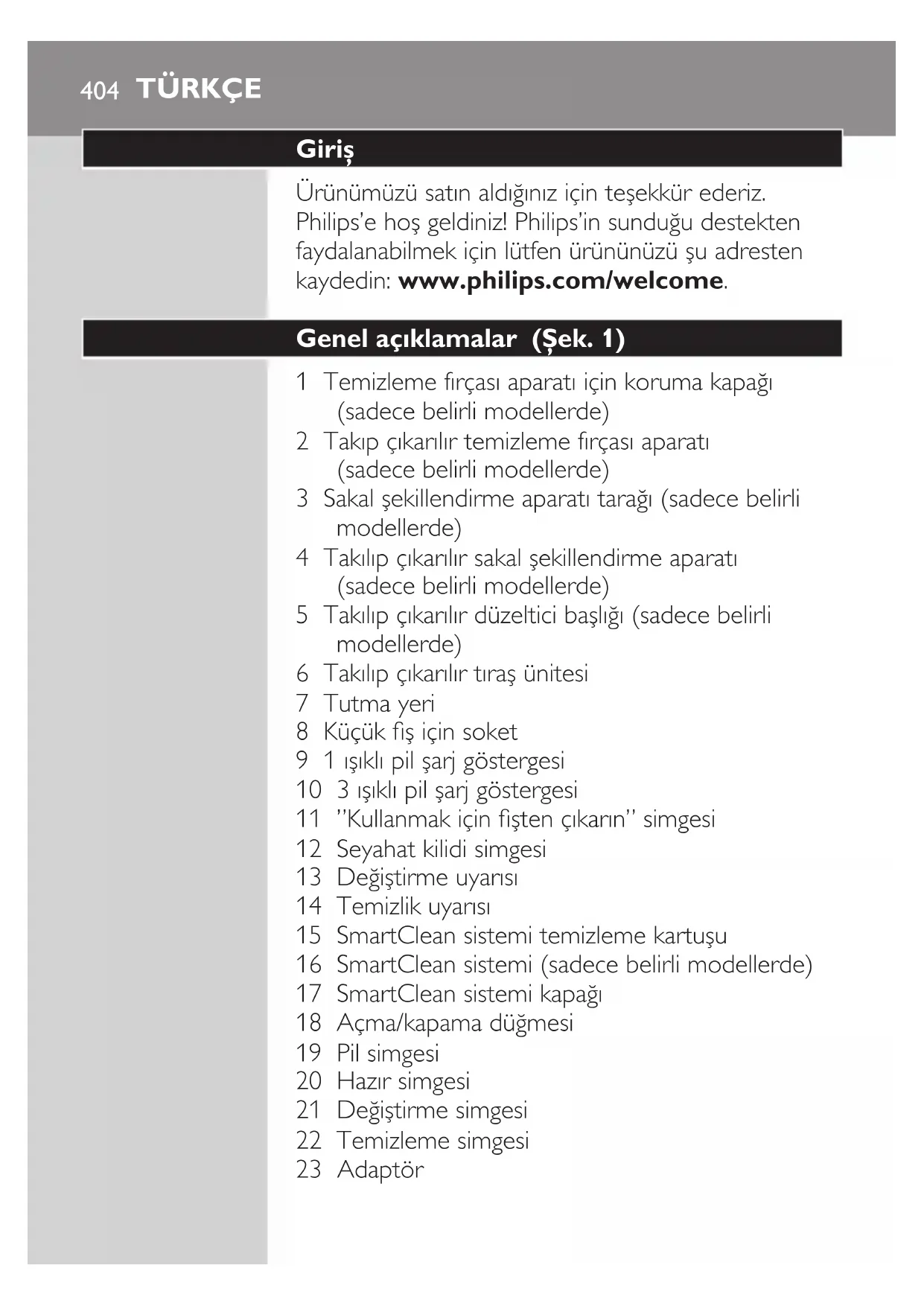 TÜRKÇE 4155 Kullandıktan sonra aparatı temizleyin (bkz. ‘Temizlik ve bakım’ bölümü). Sakal şekillendirme aparatının tarak olmadan kullanılması Sakal, bıyık, favori ve enseyi 0,5 mm uzunluğunda düzeltmek için sakal şekillendirme aparatını tarak olmadan kullanabilirsiniz. 1 Tarağı aparattan çekerek çıkarın. Not: Tarağı aparattan çıkarmak için ortasından tutun. Tarağı kenarlarından çekmeyin. 2 Cihazı açın. 3 Şekillendiriciyi cildinize dik olarak tutup aşağı doğru hafçe bastırarak ve hareket ettirerek sakalınızı, bıyığınızı, favorilerinizi veya ensedeki saç çizginizi düzeltmeye başlayabilirsiniz. 4 Kullandıktan sonra aparatı temizleyin (bkz. ‘Temizlik ve bakım’ bölümü). Temizleme fırçası aparatının kullanılması Dönen temizleme fırçası aparatını günlük temizleme kreminizle birlikte kullanın. Temizleme fırçası aparatı, yağ ve kirleri temizleyerek sağlıklı ve yağsız bir cilde sahip olmanıza yardımcı olur. 1 Aparatın sapını cihazın üzerindeki yuvaya yerleştirin. Daha sonra aparatı bastırarak cihaza takın (‘klik’ sesi duyulur). 2 Aparatı suyla ıslatın. Cildi tahriş edebileceğinden cihazı kuru bir fırça başlığıyla kullanmayın. İpucu: Daha kolay ve daha hijyenik bir tıraş için tıraş olmadan önce aparatı kullanın. TÜRKÇE4163 Yüzünüzü suyla ıslatın ve yüzünüze bir temizleyici uygulayın. 4 Aparatı sağ yanağınıza dayayın. 5 Cihazı açın. 6 Aparatı cildiniz üstünde, burundan kulağa doğru, hafçe hareket ettirin. Uygulamanın rahat geçmesi için aparatı cildinize çok fazla bastırmayın. 7 Yaklaşık 20 saniye sonra cihazı sol yanağınıza doğru hareket ettirip yüzünüzün bu kısmını temizlemeye başlayabilirsiniz. Dikkat: Gözlerinizin etrafındaki hassas alanı temizlemeyin. 8 Yaklaşık 20 saniye sonra aparatı alnınıza doğru hareket ettirip yüzünüzün bu kısmını temizlemeye başlayabilirsiniz. Fırça başlığını soldan sağa doğru hafçe hareket ettirin. Not: Temizleme işlemini uzun süre yapmamanızı ve her bölgeyi 20 saniyeden daha uzun süre temizlemenizi öneririz. 9 Uygulama sonrasında yüzünüzü yıkayın ve kurulayın. Yüzünüz, artık bir sonraki günlük cilt bakımı adımına hazırdır. 10 Kullandıktan sonra aparatı temizleyin (bkz. ‘Temizlik ve bakım’ bölümü). 20 sec. 20 sec. 20 sec. TÜRKÇE 417Temizlik ve bakım Not: Cihazla birlikte verilen aksesuarlar ürünlere göre farklılık gösterebilir. Cihazınızla birlikte verilen aksesuarları kutu üzerinde görebilirsiniz. Tıraş makinesinin SmartClean sisteminde temizlenmesi (sadece belirli modellerde) Sızıntıyı önlemek için SmartClean sistemini yatırmayın. Not: SmartClean sistemini tutarak kullanıma hazırlayın. Not: Tıraş makinesini haftada bir kez SmartClean sistemi ile temizlerseniz SmartClean kartuşunu yaklaşık üç ay kullanabilirsiniz. SmartClean sistemini kullanıma hazırlama 1 Küçük şi SmartClean sisteminin arkasına takın. 2 Adaptörü prize takın. 3 SmartClean sisteminin yanındaki düğmeye basın ve SmartClean sisteminin üst kısmını kaldırın. 4 Temizleme kartuşu contasını çekerek çıkarın. 5 Temizleme kartuşunu SmartClean sistemine yerleştirin.