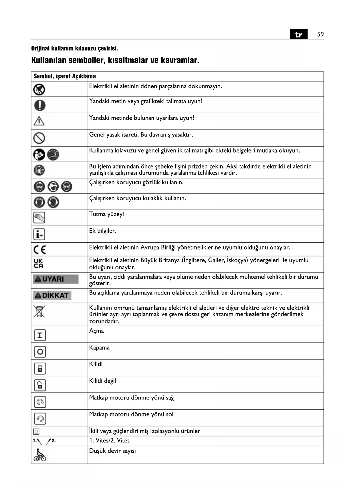 Orijinal kullanım kılavuzu çevirisi. Kullanılan semboller, kısaltmalar ve kavramlar. Sembol, işaret Açıklama Elektrikli el aletinin dönen parçalarına dokunmayın. Yandaki metin veya grafikteki talimata uyun! Yandaki metinde bulunan uyarılara uyun! Genel yasak işareti. Bu davranış yasaktır. Kullanma kılavuzu ve genel güvenlik talimatı gibi ekteki belgeleri mutlaka okuyun. Bu işlem adımından önce şebeke fişini prizden çekin. Aksi takdirde elektrikli el aletinin yanlışlıkla çalışması durumunda yaralanma tehlikesi vardır. Çalışırken koruyucu gözlük kullanın. Çalışırken koruyucu kulaklık kullanın. Tutma yüzeyi Ek bilgiler. Elektrikli el aletinin Avrupa Birliği yönetmeliklerine uyumlu olduğunu onaylar. Elektrikli el aletinin Büyük Britanya (İngiltere, Galler, İskoçya) yönergeleri ile uyumlu olduğunu onaylar. Bu uyarı, ciddi yaralanmalara veya ölüme neden olabilecek muhtemel tehlikeli bir durumu gösterir. Bu açıklama yaralanmaya neden olabilecek tehlikeli bir duruma karşı uyarır. Kullanım ömrünü tamamlamış elektrikli el aletleri ve diğer elektro teknik ve elektrikli ürünler ayrı ayrı toplanmak ve çevre dostu geri kazanım merkezlerine gönderilmek zorundadır. Açma Kapama Kilitli Kilitli değil Matkap motoru dönme yönü sağ Matkap motoru dönme yönü sol İkili veya güçlendirilmiş izolasyonlu ürünler