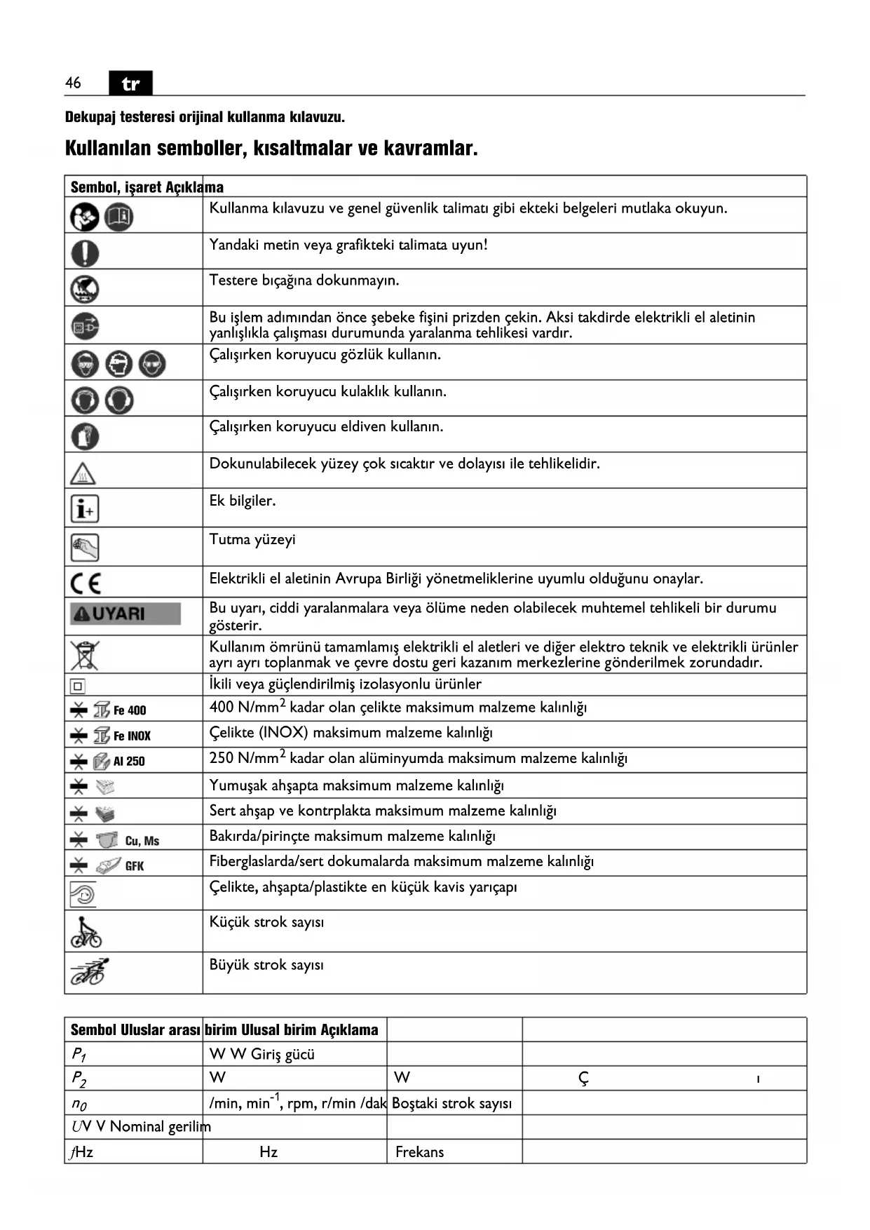 bicomde okuyup tam olarak anlamadan bu elektrikli el aletini kullanmayin. Anilan belgeleri ileride kullanmak üzere saklayin ve elektrikli el aletini baskalarina verdiginizde veya devrettiginizde bu belgeleri de verin. Ilgili ulusal calisma hukumlerine de uyun.