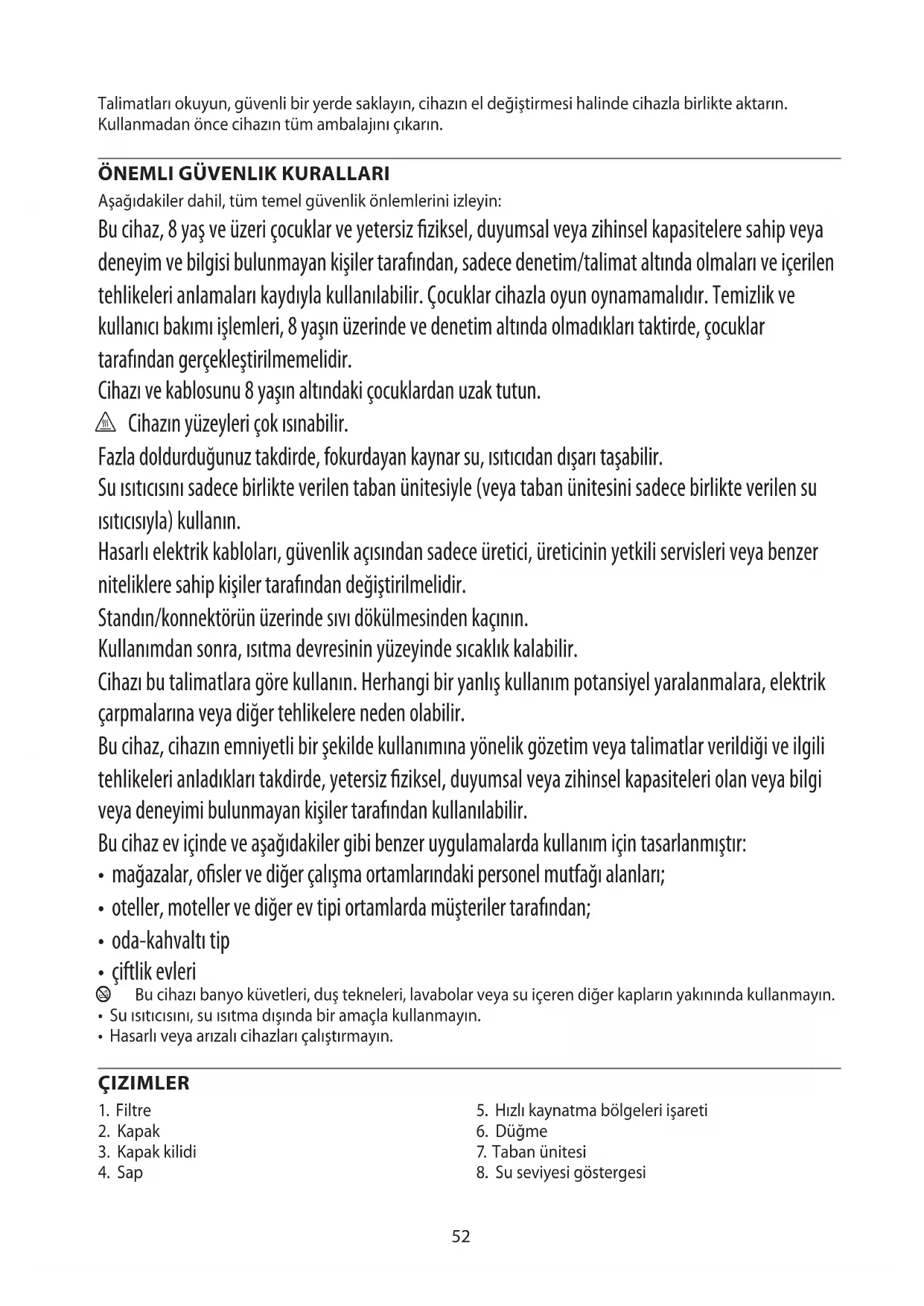 Aşağıdakiler dahil, tüm temel güvenlik önlemlerini izleyin: Bu cihaz, 8 yaş ve üzeri çocuklar ve yetersiz fiziksel, duyumsal veya zihinsel kapasitelere sahip veya deneyim ve bilgisi bulunmayan kişiler tarafından, sadece denetim/talimat altında olmaları ve içerilen tehlikeleri anlamaları kaydıyla kullanılabilir. Çocuklar cihazla oyun oynamamalıdır. Temizlik ve kullanıcı bakımı işlemleri, 8 yaşın üzerinde ve denetim altında olmadıkları taktirde, çocuklar tarafından gerçekleştirilmemelidir. Cihazı ve kablosunu 8 yaşın altındaki çocuklardan uzak tutun. h Cihazın yüzeyleri çok ısınabilir. Fazla doldurduğunuz takdirde, fokurdayan kaynar su, ısıtıcıdan dışarı taşabilir. Su ısıtıcısını sadece birlikte verilen taban ünitesiyle (veya taban ünitesini sadece birlikte verilen su ısıtıcısıyla) kullanın. Hasarlı elektrik kabloları, güvenlik açısından sadece üretici, üreticinin yetkili servisleri veya benzer niteliklere sahip kişiler tarafından değiştirilmelidir. Standın/konnektörün üzerinde sıvı dökülmesinden kaçının. Kullanımdan sonra, ısıtma devresinin yüzeyinde sıcaklık kalabilir. Cihazı bu talimatlara göre kullanın. Herhangi bir yanlış kullanım potansiyel yaralanmalara, elektrik çarpmalarına veya diğer tehlikelere neden olabilir. Bu cihaz, cihazın emniyetli bir şekilde kullanımına yönelik gözetim veya talimatlar verildiği ve ilgili tehlikeleri anladıkları takdirde, yetersiz fiziksel, duyumsal veya zihinsel kapasiteleri olan veya bilgi veya deneyimi bulunmayan kişiler tarafından kullanılabilir. Bu cihaz ev içinde ve aşağıdakiler gibi benzer uygulamalarda kullanım için tasarlanmıştır: