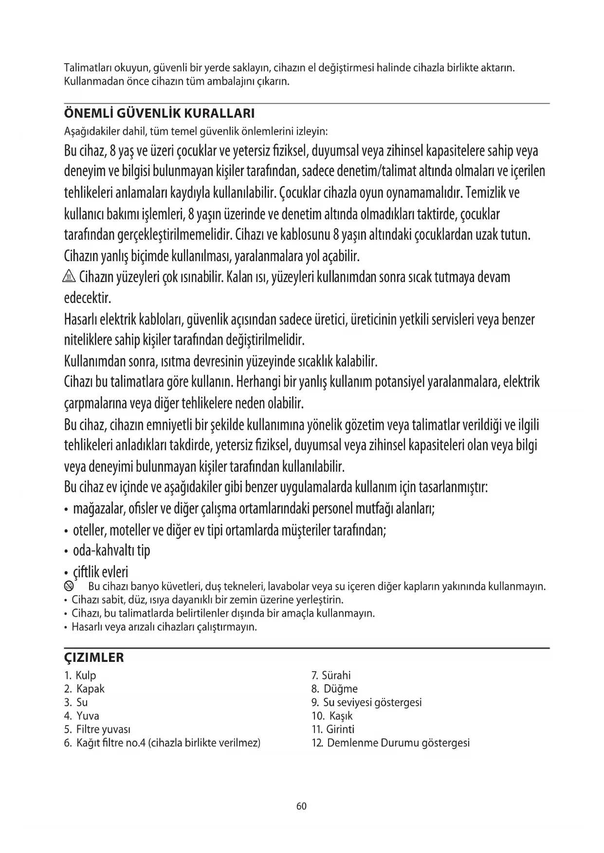 Aşağıdakiler dahil, tüm temel güvenlik önlemlerini izleyin: Bu cihaz, 8 yaş ve üzeri çocuklar ve yetersiz fiziksel, duyumsal veya zihinsel kapasitelere sahip veya deneyim ve bilgisi bulunmayan kişiler tarafından, sadece denetim/talimat altında olmaları ve içerilen tehlikeleri anlamaları kaydıyla kullanılabilir. Çocuklar cihazla oyun oynamamalıdır. Temizlik ve kullanıcı bakımı işlemleri, 8 yaşın üzerinde ve denetim altında olmadıkları taktirde, çocuklar tarafından gerçekleştirilmemelidir. Cihazı ve kablosunu 8 yaşın altındaki çocuklardan uzak tutun. Cihazın yanlış biçimde kullanılması, yaralanmalara yol açabilir. h Cihazın yüzeyleri çok ısınabilir. Kalan ısı, yüzeyleri kullanımdan sonra sıcak tutmaya devam edecektir. Hasarlı elektrik kabloları, güvenlik açısından sadece üretici, üreticinin yetkili servisleri veya benzer niteliklere sahip kişiler tarafından değiştirilmelidir. Kullanımdan sonra, ısıtma devresinin yüzeyinde sıcaklık kalabilir. Cihazı bu talimatlara göre kullanın. Herhangi bir yanlış kullanım potansiyel yaralanmalara, elektrik çarpmalarına veya diğer tehlikelere neden olabilir. Bu cihaz, cihazın emniyetli bir şekilde kullanımına yönelik gözetim veya talimatlar verildiği ve ilgili tehlikeleri anladıkları takdirde, yetersiz fiziksel, duyumsal veya zihinsel kapasiteleri olan veya bilgi veya deneyimi bulunmayan kişiler tarafından kullanılabilir. Bu cihaz ev içinde ve aşağıdakiler gibi benzer uygulamalarda kullanım için tasarlanmıştır: