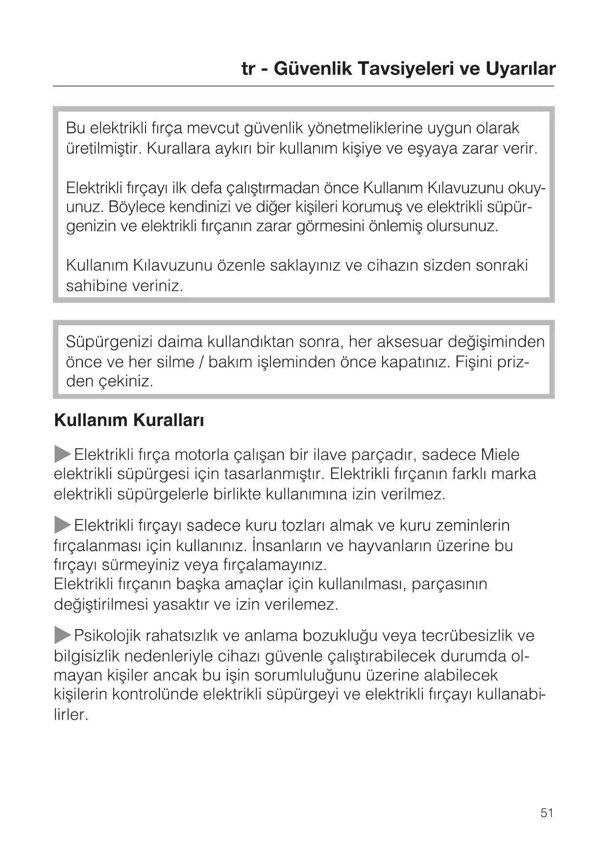 Elektrikli fýrça motorla çalýþan bir ilave parçadýr, sadece Miele elektrikli süpürgesi için tasarlanmýþtýr. Elektrikli fýrçanýn farklý marka elektrikli süpürgelerle birlikte kullanýmýna izin verilmez.