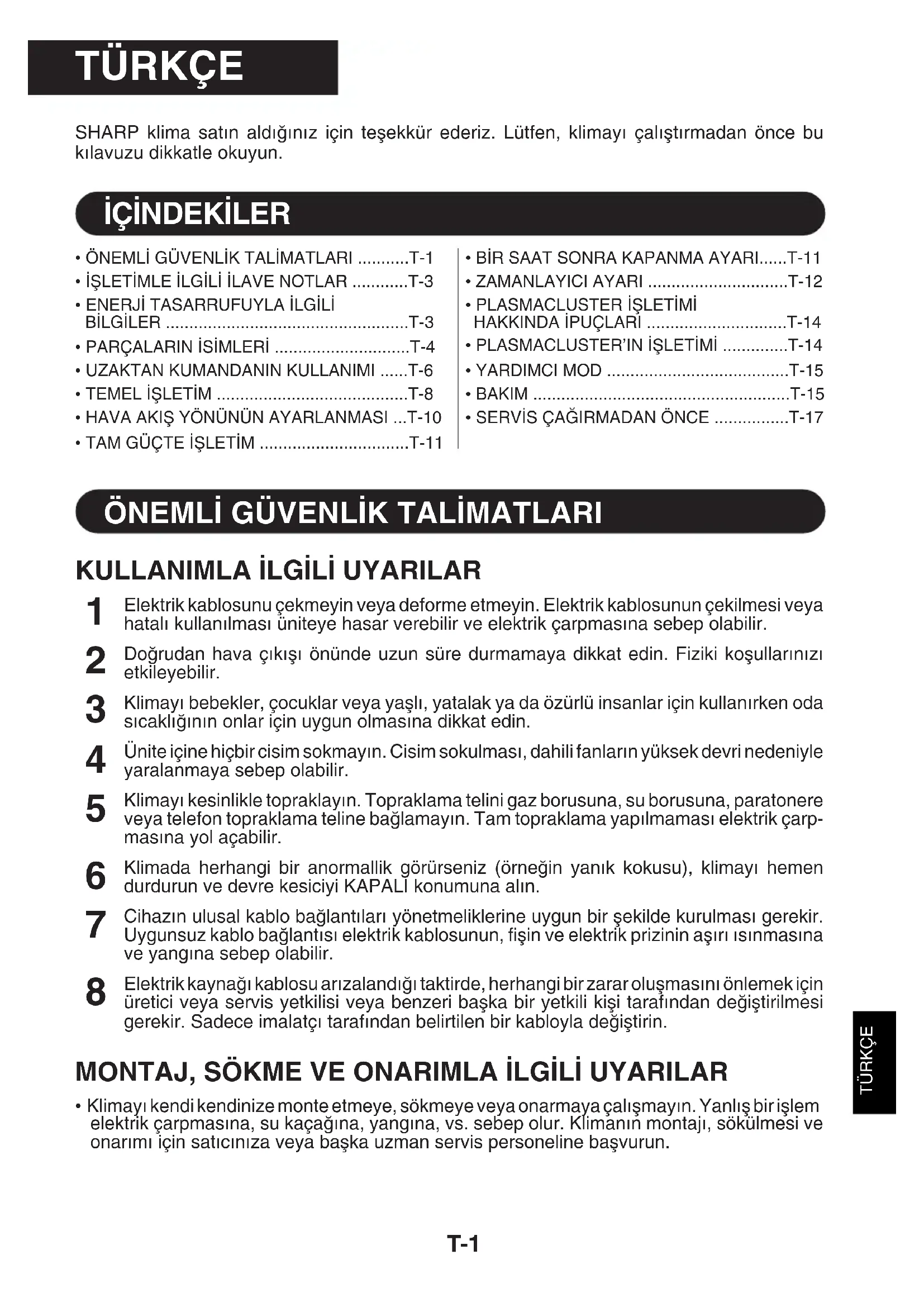 - Klimayı kendi kendinize monte etmeye, sökmeye veya onarmaya çalıµmayın. Yanlıµ bir iµlemelektrik çarpmasına, su kaçaπına, yangına, vs. sebep olur. Klimanın montajı, sökülmesi veonarımı için satıcınıza veya baµka uzman servis personeline baµvurun.