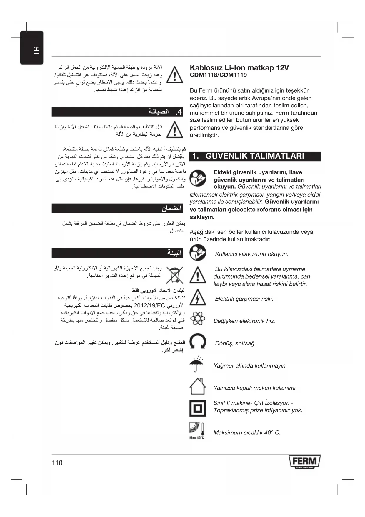 Kablosuz Li-Ion matkap 12V CDM1118/CDM1119 BuFermürününüsatınaldığınıziçinteşekkür ederiz.BusayedeartıkAvrupa’nınöndegelen sağlayıcılarındanbiritarafındanteslimedilen, mükemmelbirürünesahipsiniz.Fermtarafından size teslim edilen bütün ürünler en yüksek performansvegüvenlikstandartlarınagöre üretilmiştir.