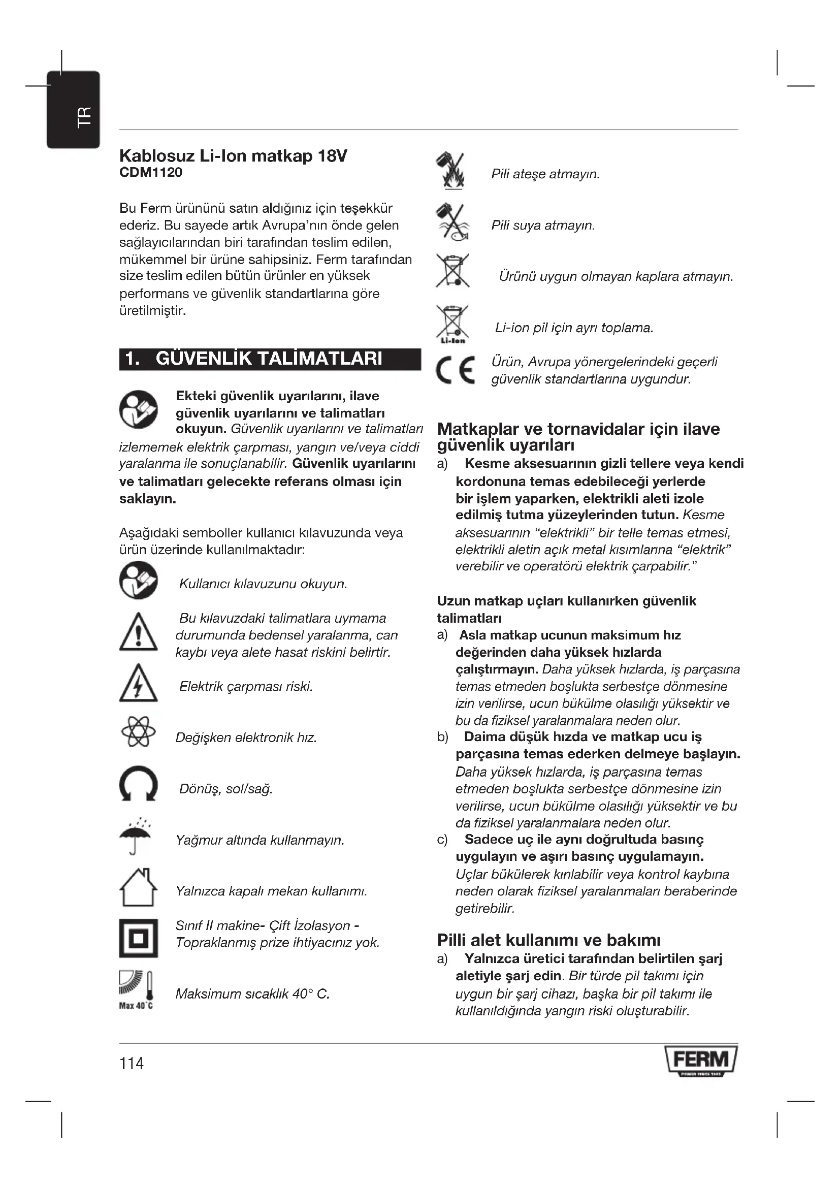 Kablosuz Li-Ion matkap 18V CDM1120 BuFermürününüsatınaldığınıziçinteşekkür ederiz.BusayedeartıkAvrupa’nınöndegelen sağlayıcılarındanbiritarafındanteslimedilen, mükemmelbirürünesahipsiniz.Fermtarafından size teslim edilen bütün ürünler en yüksek performansvegüvenlikstandartlarınagöre üretilmiştir.