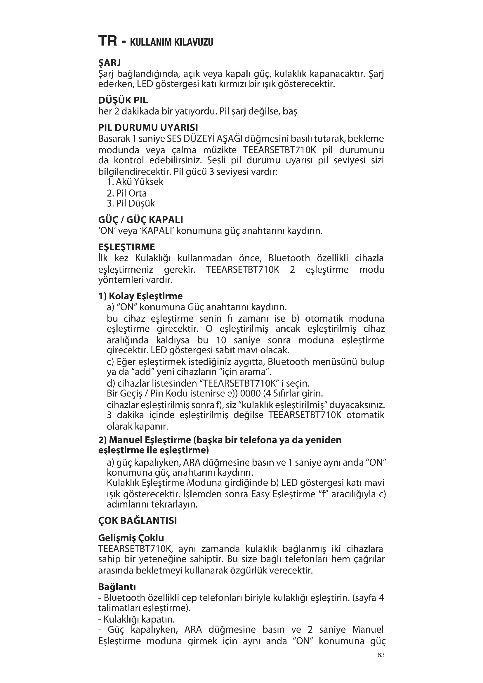 Gelişmiş Çoklu TEEARSETBT710K, aynı zamanda kulaklık bağlanmış iki cihazlara sahip bir yeteneğine sahiptir. Bu size bağlı telefonları hem çağrılar arasında bekletmeyi kullanarak özgürlük verecektir. Bağlantı - Bluetooth özellikli cep telefonları biriyle kulaklığı eşleştirin. (sayfa 4 talimatları eşleştirme). - Kulaklığı kapatın. - Güç kapalıyken, ARA düğmesine basın ve 2 saniye Manuel Eşleştirme moduna girmek için aynı anda “ON” konumuna güç64 anahtarını kaydırın. - Şimdi, eşleştirmek ve diğer Bluetooth özellikli cep telefonu ile kulaklık bağlamak. (Bu birincil yakışıklı olacaktır). - Bu yakışıklı eşleştirilmiş ve bağlandıktan sonra, geri dönün ve kulaklığa başlangıçta eşleştirilmiş yakışıklı bağlayabilirsiniz. Bu artık ikincil yakışıklı olacak.