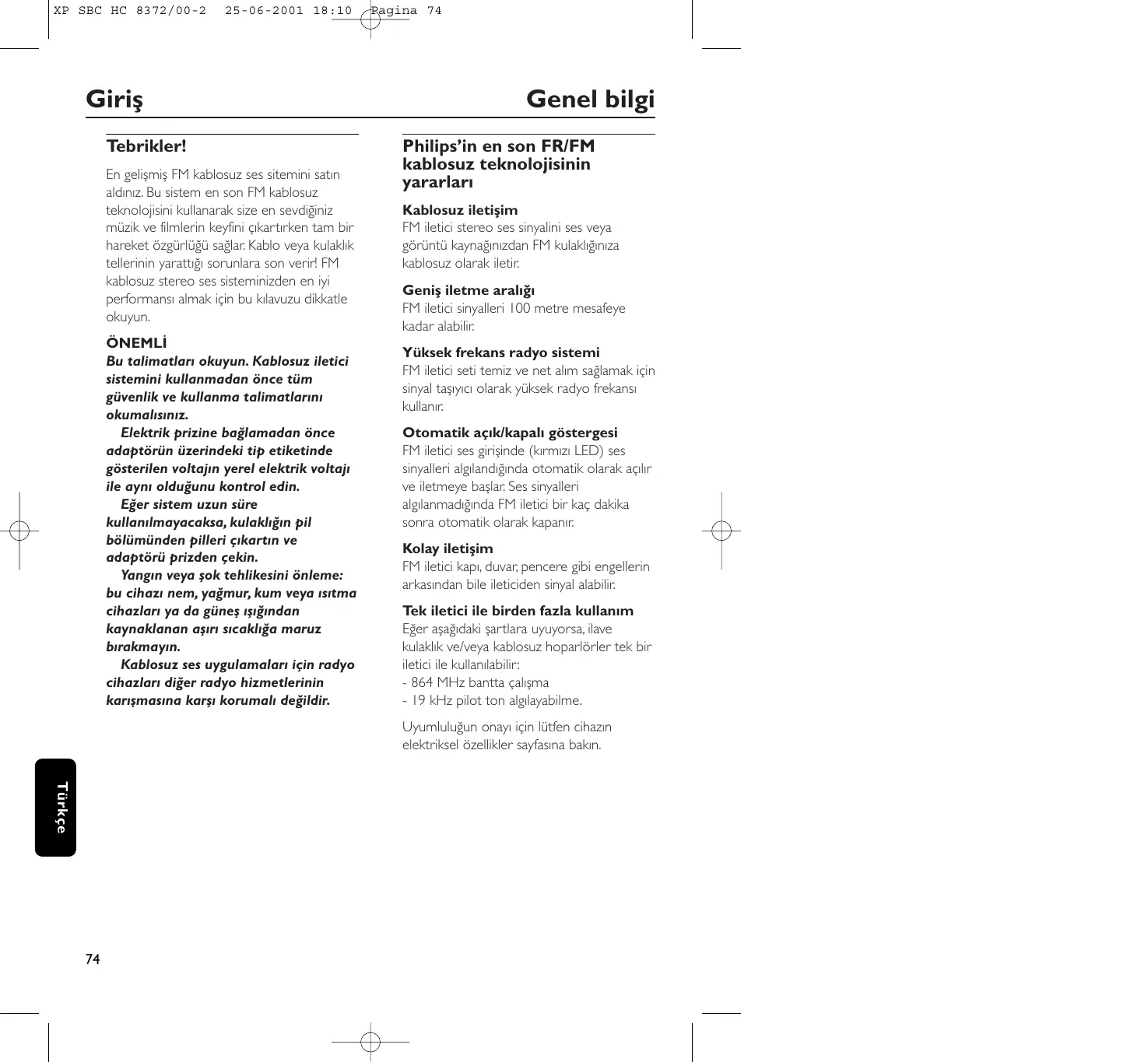 25-06-2001 18:10 Giriş Tebrikler! En gelişmiş FM kablosuz ses sitemini satın aldınız. Bu sistem en son FM kablosuz teknolojisini kullanarak size en sevdiğiniz müzik ve filmlerin keyfini çıkartırken tam bir hareket özgürlüğü sağlar. Kablo veya kulaklık tellerinin yarattığı sorunlara son verir! FM kablosuz stereo ses sisteminizden en iyi performansı almak için bu kılavuzu dikkatle okuyun. ÖNEMLİ Bu talimatları okuyun. Kablosuz iletici sistemini kullanmadan önce tüm güvenlik ve kullanma talimatlarını okumalısınız. Elektrik prizine bağlamadan önce adaptörün üzerindeki tip etiketinde gösterilen voltajın yerel elektrik voltajı ile aynı olduğunu kontrol edin. Eğer sistem uzun süre kullanılmayacaksa, kulaklığın pil bölümünden pilleri çıkartın ve adaptörü prizden çekin. Yangın veya şok tehlikesini önleme: bu cihazı nem, yağmur, kum veya ısıtma cihazları ya da güneş ışığından kaynaklanan aşırı sıcaklığa maruz bırakmayın. Kablosuz ses uygulamaları için radyo cihazları diğer radyo hizmetlerinin karışmasına karşı korumalı değildir. Pagina 74 Genel bilgi Philips’in en son FR/FM kablosuz teknolojisinin yararları Kablosuz iletişim FM iletici stereo ses sinyalini ses veya görüntü kaynağınızdan FM kulaklığınıza kablosuz olarak iletir. Geniş iletme aralığı FM iletici sinyalleri 100 metre mesafeye kadar alabilir. Yüksek frekans radyo sistemi FM iletici seti temiz ve net alım sağlamak için sinyal taşıyıcı olarak yüksek radyo frekansı kullanır. Otomatik açık/kapalı göstergesi FM iletici ses girişinde (kırmızı LED) ses sinyalleri algılandığında otomatik olarak açılır ve iletmeye başlar. Ses sinyalleri algılanmadığında FM iletici bir kaç dakika sonra otomatik olarak kapanır. Kolay iletişim FM iletici kapı, duvar, pencere gibi engellerin arkasından bile ileticiden sinyal alabilir. Tek iletici ile birden fazla kullanım Eğer aşağıdaki şartlara uyuyorsa, ilave kulaklık ve/veya kablosuz hoparlörler tek bir iletici ile kullanılabilir: - 864 MHz bantta çalışma - 19 kHz pilot ton algılayabilme. Uyumluluğun onayı için lütfen cihazın elektriksel özellikler sayfasına bakın. Türkçe