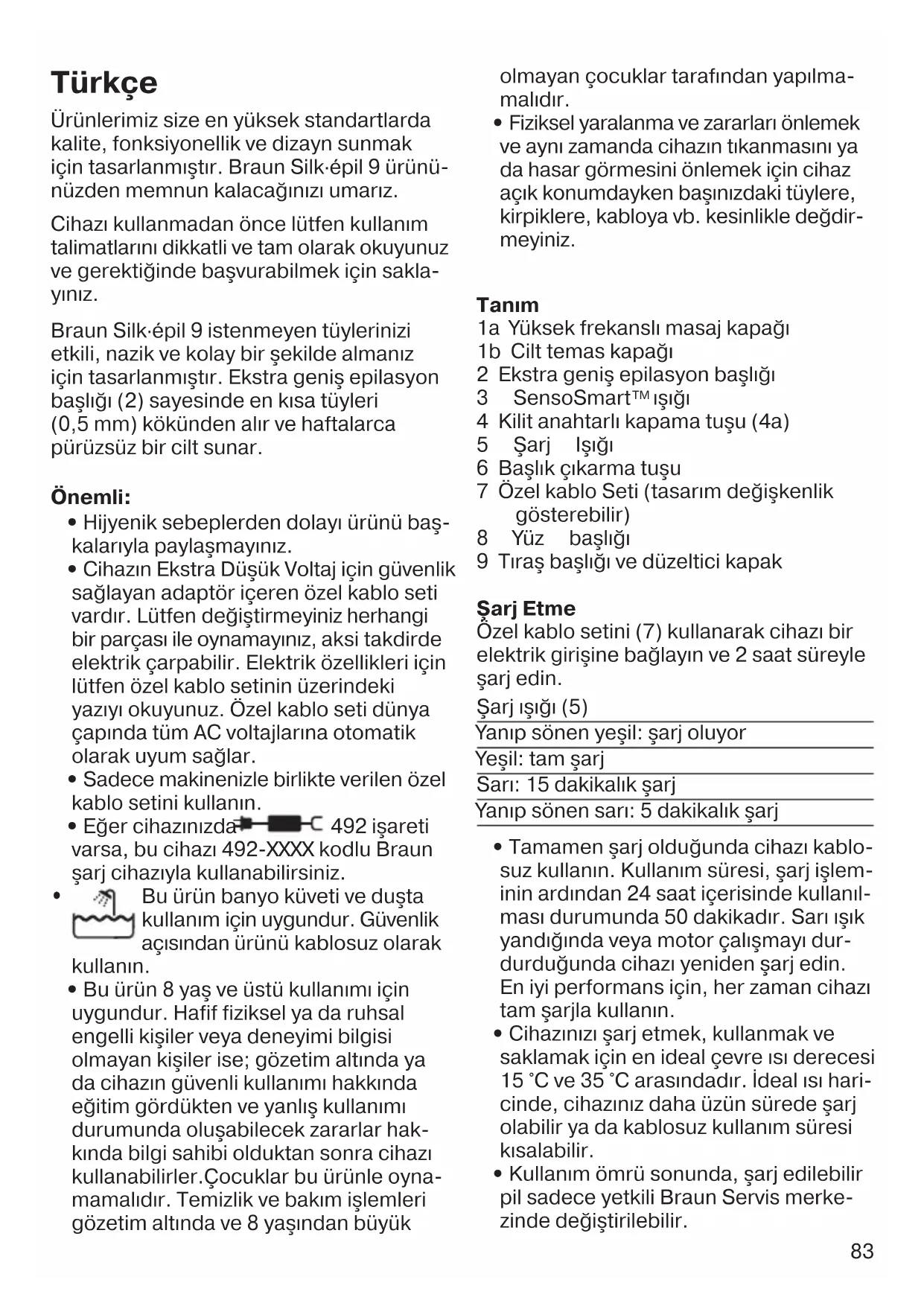 - Eğer cihazınızda 492 işareti varsa, bu cihazı 492-XXXX kodlu Braun şarj cihazıyla kullanabilirsiniz.