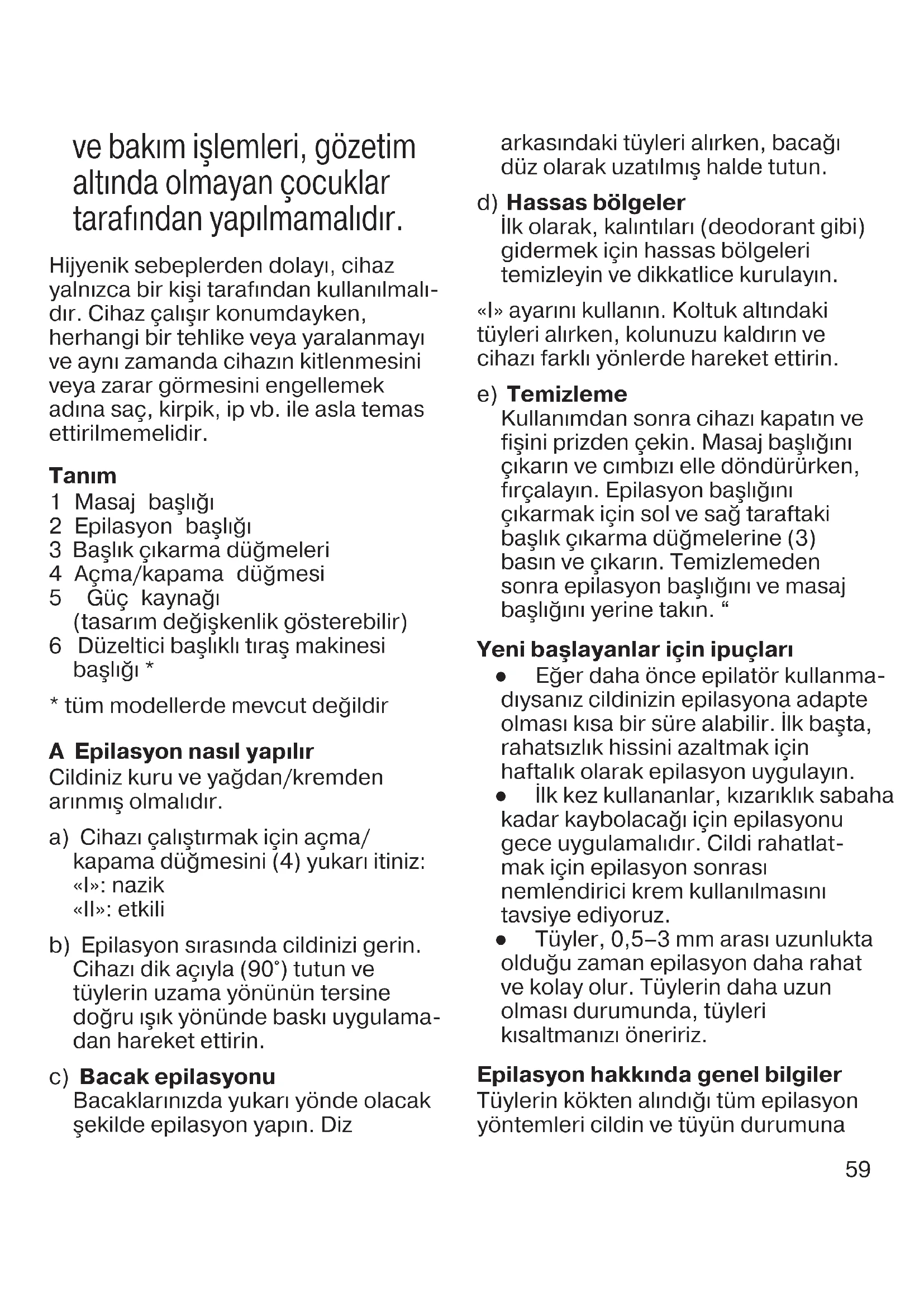 - tüm modellerde mevcut değildir A Epilasyon nasıl yapılır Cildiniz kuru ve yağdan/kremden arınmış olmalıdır. a) Cihazı çalıştırmak için açma/ kapama düğmesini (4) yukarı itiniz: «I»: nazik «II»: etkili b) Epilasyon sırasında cildinizi gerin. Cihazı dik açıyla (90°) tutun ve tüylerin uzama yönünün tersine doğru ışık yönünde baskı uygulama- dan hareket ettirin. c) Bacak epilasyonu Bacaklarınızda yukarı yönde olacak şekilde epilasyon yapın. Diz 90323726_SE_3_Grocery.indd 5990323726_SE_3_Grocery.indd 59 02.06.22 15:3502.06.22 15:3560 c) Temizleme: Tıraş makinesinin folyo çerçevesini (II) çıkarmak için öndeki ve arkadaki serbest bırakma çubuklarına basın. Düz bir yüzeye dikkatli bir şekilde hafifçe vurun. Kesici blok (III) ile altındaki alanı fırçalayarak temizleyin. d) Tıraş makinesi folyosunu (II), folyoya zarar verebileceği için fırça ile temizlemeyin. Zarar görmüş folyo ile tıraş olmayın. e) Tıraş parçalarının 3 ayda bir düzenli olarak yağlanması gerekir. Tıraş performansında bir azalma fark ettiğinizde folyo çerçevesini ve kesici bloğu değiştirin. Değişim parçaları www.service.braun.com adresinden temin edilebilir. Ürünü Atma Bu ürün, geri dönüştürülebilir elektrikli atık içerir. Çevresel koruma için, evsel atıklarla birlikte atmayın ancak geri dönüşüm için bölgenizdeki elektrikli atık dönüştürme merkezlerine götürün. Bu bilgiler bildirim yapılmadan değiştirilebilir. AEEE Yönetmeliğine uygundur. Bakanlıkça tespit ve ilan edilen kullanım ömrü 5 yıldır. Üretici firma ve CE uygunluk değerlendirme kuruluşu: Braun GmbH Frankfurter Straße 145 61476 Kronberg / Germany bağlı olarak irritasyona sebep olabilir (örn. kaşıntı, rahatsızlık, ciltte kızarıklık). Bu normal bir reaksiyondur ve hemen geçmesi gerekir; ama eğer tüylerinizi birkaç seferdir ilk defa kökten alıyorsanız ya da hassas bir cilde sahipseniz bu durum daha uzun sürebilir. Genelde, cilt reaksiyonları ve acı hissi tekrar eden kullanımla önemli ölçüde azalma eğilimindedir. Eğer 36 saat sonra cilt hala irritasyon gösteriyorsa, doktorunuza başvurma- nızı öneririz. Cilt altına yerleşen bakterilerin küçük yaralara ulaştığında enfeksiyon veya iltihap yaratma riskini minimuma indirmek için epilasyon başlığını ve cildinizi her kullanımdan önce iyice temizleyin. Cihazı kullanmakla ilgili şüpheleriniz varsa lütfen doktorunuza başvurun. Ürün aşağıdaki durumlarda ancak bir doktorun tavsiyesiyle kullanılabilir: egzama, yaralar, follikulitis (kıl kökü iltihabı) gibi iltihaplı cilt reaksiyonları ve benlerin çevresin- deki varisli damarlar, şeker hastalığı, hamilelik, Raynaud hastalığı, hemofili, candida ve immun yetmezliği gibi cildin bağışıklığını azaltan durumlar. B Nasıl tıraş edilir / düzeltilir Tıraş makinesi başlığı (6) bacakların, koltuk altlarının ve bikini bölgesinin hızlı ve sinekkaydı tıraşı, kontür düzeltme ve tüy almaya hazırlama işlemleri için tasarlanmıştır. a) Tıraş makinesi başlığı (düzeltici öne bakacak şekilde) takın. «II» ayarı ile tıraş olun. b) Tüylere, epilasyon için ideal uzunluğa getirmek adına ön kesim yapmak için düzeltici başlığı (I) takın. 90323726_SE_3_Grocery.indd 6090323726_SE_3_Grocery.indd 60 02.06.22 15:3502.06.22 15:3561 tü ketici, 6502 sayılı Tü keticinin Korunması Hakkında Kanunun 11 inci maddesinde yer alan; a) Sözleşmeden dönme, b) Satış bedelinden indirim isteme, c) Ücretsiz onarılmasını isteme, ç) Satılanın ayıpsız bir misli ile değiştirilmesini isteme haklarından birini kullanabilir.