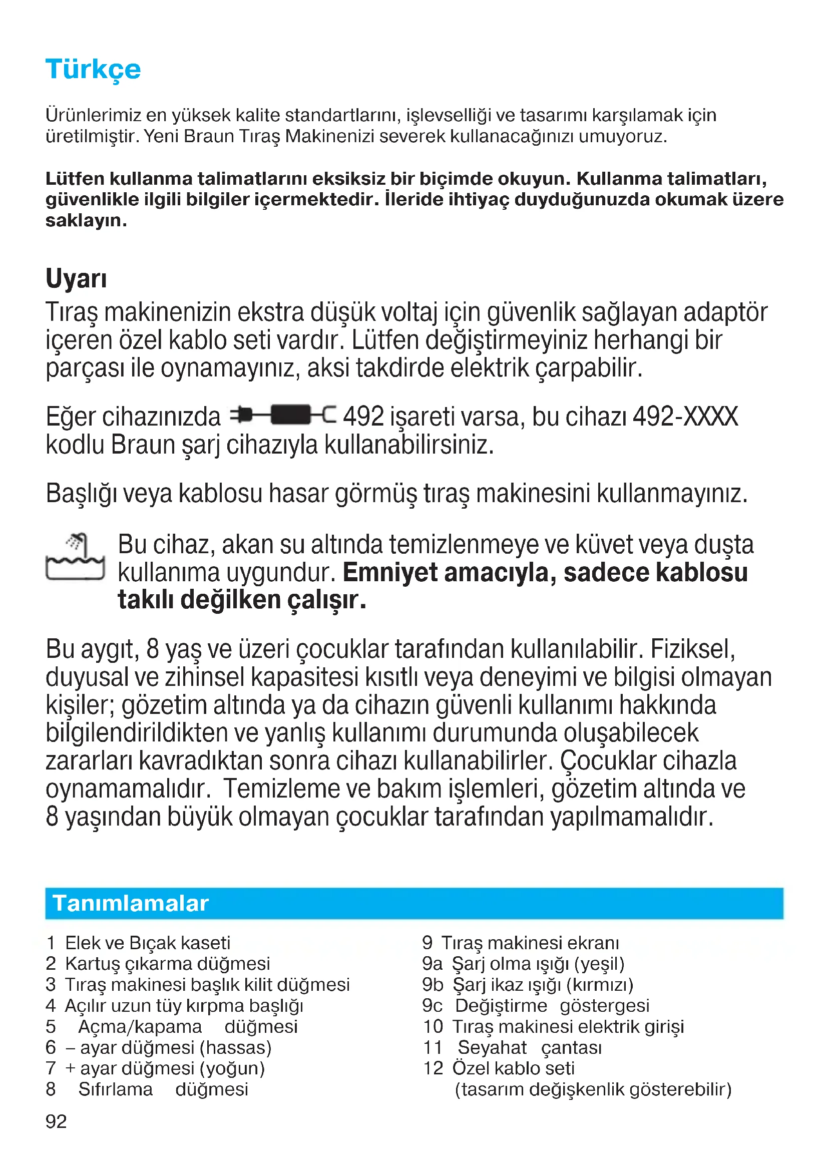 namočite v toplo vodo s tekočim čistilom za posodo. Kaseto nato dobro sperite in jo povsem izpraznite tako, da jo z njo nežno udarjate ob površino. Ko se posuši, na vrh folije kanite kapljico lahkega strojnega olja. Ko je akumulator napolnjen, se brivnik izklopi. Folija in rezalnik sta obrabljena, zato za delovanje potrebujeta več moči, kot jo lahko zagotovi motor. Naprava se izklopi. – Obnovite kaseto z rezalnikom in folijo. – Sistem za britje redno mažite z oljem, zlasti če za čiščenje uporabljate samo vodo. Segmenti prikaza akumulatorja na prikazovalniku se manjšajo glede na zmanjševanje zmogljivosti akumulatorja. Folija in rezalnik sta obrabljena, zato pri vsakem britju porabita več energije. – Obnovite kaseto z rezalnikom in folijo. – Sistem za britje redno mažite z oljem, zlasti če za čiščenje uporabljate samo vodo. Dele brivnika ste nedavno menjali, vendar kljub temu simbol za menjavo sveti. Gumba za ponastavitev niste pritisnili. – Za tri sekunde pridržite gumb za ponastavitev, da ponastavite števec. 91153500_Series_7-8_Solo_EURO_S6-140.indd 9191153500_Series_7-8_Solo_EURO_S6-140.indd 91 28.11.16 13:4228.11.16 13:42 CSS APPROVED Effective Date 30Nov2016 GMT - Printed 04Jan2017 Page 90 of 13992 Türkçe Ürünlerimiz en yüksek kalite standartlarını, işlevselliği ve tasarımı karşılamak için üretilmiştir. Yeni Braun Tıraş Makinenizi severek kullanacağınızı umuyoruz. Lütfen kullanma talimatlarını eksiksiz bir biçimde okuyun. Kullanma talimatları, güvenlikle ilgili bilgiler içermektedir. İleride ihtiyaç duyduğunuzda okumak üzere saklayın. Uyarı Tıraş makinenizin ekstra düşük voltaj için güvenlik sağlayan adaptör içeren özel kablo seti vardır. Lütfen değiştirmeyiniz herhangi bir parçası ile oynamayınız, aksi takdirde elektrik çarpabilir. Eğer cihazınızda 492 işareti varsa, bu cihazı 492-XXXX kodlu Braun şarj cihazıyla kullanabilirsiniz. Başlığı veya kablosu hasar görmüş tıraş makinesini kullanmayınız. Bu cihaz, akan su altında temizlenmeye ve küvet veya duşta kullanıma uygundur. Emniyet amacıyla, sadece kablosu takılı değilken çalışır. Bu aygıt, 8 yaş ve üzeri çocuklar tarafından kullanılabilir. Fiziksel, duyusal ve zihinsel kapasitesi kısıtlı veya deneyimi ve bilgisi olmayan kişiler; gözetim altında ya da cihazın güvenli kullanımı hakkında bilgilendirildikten ve yanlış kullanımı durumunda oluşabilecek zararları kavradıktan sonra cihazı kullanabilirler. Çocuklar cihazla oynamamalıdır. Temizleme ve bakım işlemleri, gözetim altında ve 8 yaşından büyük olmayan çocuklar tarafından yapılmamalıdır. Tanımlamalar 1 Elek ve Bıçak kaseti 2 Kartuş çıkarma düğmesi 3 Tıraş makinesi başlık kilit düğmesi 4 Açılır uzun tüy kırpma başlığı 5 Açma/kapama düğmesi 6 – ayar düğmesi (hassas) 7 + ayar düğmesi (yoğun) 8 Sıfırlama düğmesi 9 Tıraş makinesi ekranı 9a Şarj olma ışığı (yeşil) 9b Şarj ikaz ışığı (kırmızı) 9c Değiştirme göstergesi 10 Tıraş makinesi elektrik girişi 11 Seyahat çantası 12 Özel kablo seti (tasarım değişkenlik gösterebilir) 91153500_Series_7-8_Solo_EURO_S6-140.indd 9291153500_Series_7-8_Solo_EURO_S6-140.indd 92 28.11.16 13:4228.11.16 13:42 CSS APPROVED Effective Date 30Nov2016 GMT - Printed 04Jan2017 Page 91 of 13993 Tıraş Makinesini Şarj Etme Şarj için ortam sıcaklığının, 5 °C ile 35 °C arasında olması tavsiye edilir. Pil, aşırı düşük veya aşırı yüksek sıcaklıklarda verimli şekilde şarj olmayabilir veya hiç şarj olmayabilir. Tıraş olmak için ortam sıcaklığının 15 °C ile 35 °C arasında olması tavsiye edilir. Tıraş makinesini uzun süre 50 °C üzeri sıcaklıklara maruz bırakmayınız.