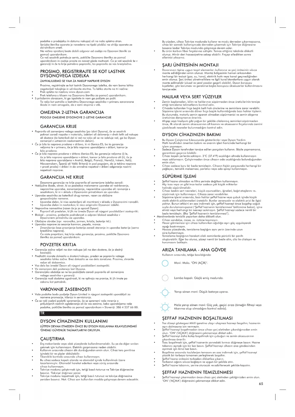 - Dyson ya da Dyson tarafından belirlenen yetkili servisin uygun ve gerekli gördüğü takdirde, elektrikli süpürgenizin onarımı ya da yenilenmesi, yanlış ya Mavi: Açık. Yanıp sönen mavi: Güç yok, bataryayı şarj edin. Yanıp sönen sarı: Güç yok, geçici arıza (örneğin çok sıcak/soğuk). Yanıp sönen kırmızı: Arıza (Dyson Yardım Hattına telefon edin). Mavi: Şarj oluyor. Lambalar kapalı: Şarj tamamlandı. Sarı: Şarj edilmiyor, geçici arıza (örneğin çok sıcak/soğuk). Yanıp sönen kırmızı: Arıza (Dyson Yardım Hattına telefon edin).67 da hatalı parçaların kullanılmasından dolayı arızalanması, satın alma yada teslimat sürecinin ilk beş yılı boyunca gerçekleşen işçilik ve fonksiyonellik (eğer süpürgenizin herhangi bir parçası kullanılabilir durumda değilse ya da artık üretilmiyorsa Dyson ya da belirlenen yetkili teknik servis, hatalı yada kusurlu parçayı fonksiyonel yedek bir parça ile değiştirecektir).