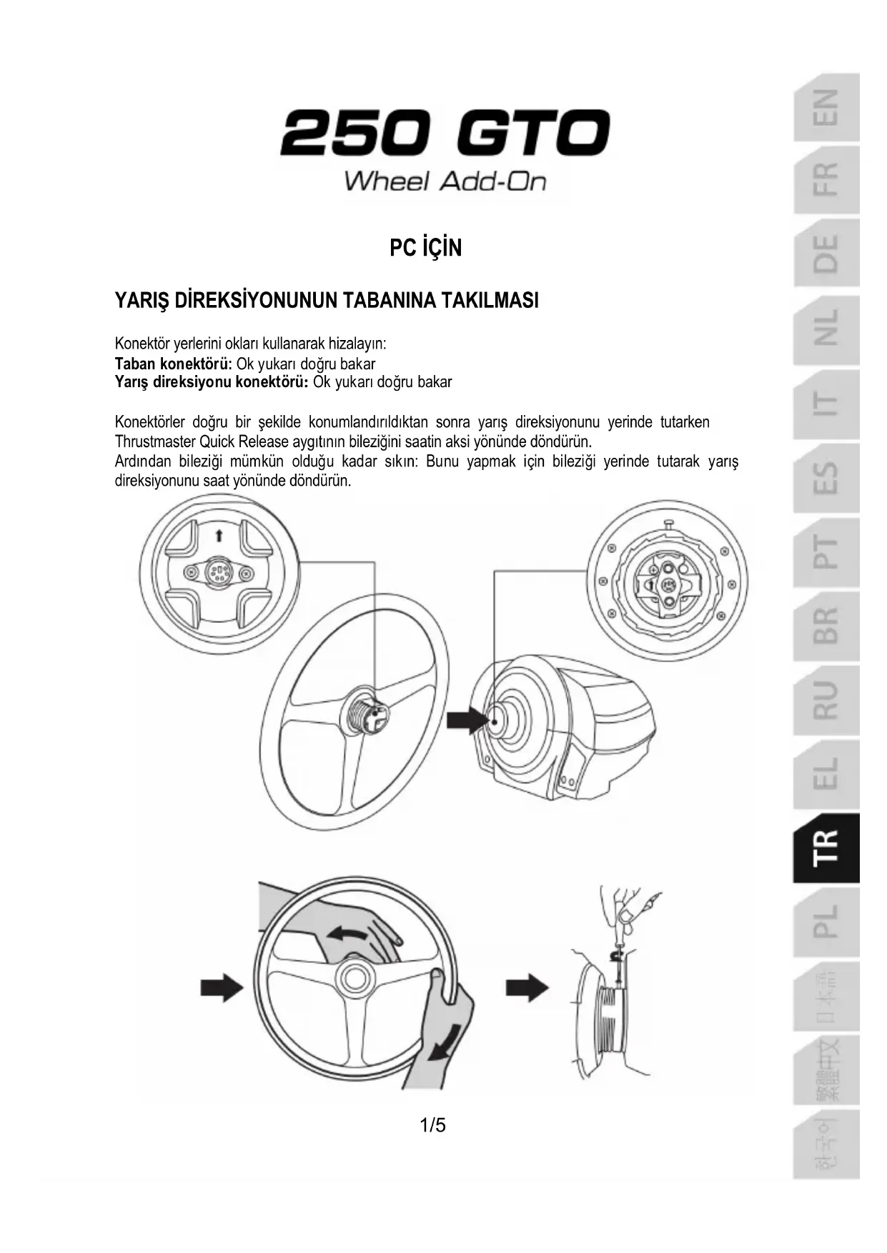 Küçük ayar vidasını (yıldız tornavida kullanarak) sıkarken fazla güç kullanmayın! Bir miktar direnç hisseder hissetmez vidayı döndürmeyi kesin. ÖNEMLİ BİLGİ: 250 GTO Wheel Add-On direksiyonunuzun düzgün çalışmasını sağlamak için (özellikle TS-PC Racer, TS-XW Racer, T-GT, TX, T300 ve T500 tabanlarla) tabanınızın donanım yazılımını https://support.thrustmaster.com adresinde mevcut en son sürümle güncellemeniz gerekmektedir (Racing Wheels / [tabanınızın adı] / Firmware'e tıklayın ve sonra talimatları, indirme ve yükleme prosedürünü izleyin).3/5 TÜKETİCİ GARANTİ BİLGİSİ İşbu Thrustmaster ürünü, malzeme ve işçilik hatalarına karşı, müşterinin kusurlu ürünün ücretinin iade edilmesi veya değiştirilmesi talebinde bulunabileceği süreye karşılık gelen garanti süresince dünya çapında tescil edilmiş merkezi Place du Granier, B.P. 97143, 35571 Chantepie, Fransa’da bulunan Guillemot Corporation S.A. (bundan sonra “Guillemot” olarak ifade edilecektir) garantisi altındadır. Avrupa Birliği ülkelerinde bu süre, Thrustmaster ürününün tesliminden itibaren iki (2) seneye karşılık gelir. Diğer ülkelerde garanti süresi, Thrustmaster ürünü ile ilgili olarak, Thrustmaster ürününün satın alındığı tarihte müşterinin ikamet ettiği ülkede geçerli yasalara uygun şekilde, müşterinin kusurlu ürünün ücretinin iade edilmesi veya değiştirilmesi talebinde bulunabileceği süreye karşılık gelir (İlgili ülkede bu tür bir düzenleme mevcut değilse garanti süresi Thrustmaster ürününün satın alındığı asıl tarihten itibaren bir (1) yıl olacaktır). Garanti süresi içinde üründe hata veya kusur tespit edilmesi durumunda derhal izlenecek yöntem ile ilgili size bilgi verecek olan Teknik Destek servisimize başvurun. Hata veya kusur onaylanırsa ürünün satın alındığı yere (ya da Teknik Destek servisi tarafından belirtilen yere) iade edilmesi gerekmektedir. İşbu garanti kapsamında müşterinin kusurlu ürünü, Teknik Destek servisinin insiyatifine bağlı olarak, değiştirilecek veya çalışır hale getirilecektir. Garanti süresince Thrustmaster ürününün onarım işlemine tabi tutulması durumunda, ürünün kullanım dışı olduğu en az yedi (7) günlük tüm süreler kalan garanti süresine eklenecektir (bu süre, ürünün onarılması için hazır bulundurulduğu tarih müdahale edilmesi için talepte bulunduğu tarihi takip ediyor ise müşterinin müdahale edilmesi için talepte bulunduğu tarihten veya bahse konu ürünün onarılması için hazır bulundurulduğu tarihten başlar). Yürürlükte olan yasaların izin verdiği durumlarda, Guillemot ve bağlılarının tüm sorumluluğu (dolaylı hasarlar da dahil olmak üzere) Thrustmaster ürününün çalışır hale getirilmesi veya değiştirilmesi ile sınırlıdır. Yürürlükte olan yasaların izin vermesi halinde Guillemot, ticarete elverişlilik veya belirli bir amaca uygunluk ile ilgili tüm garantileri reddeder. İşbu garanti aşağıdaki durumlar için geçerli değildir: (1) Ürün modifiye edilmişse, açılmışsa, üzerinde değişiklik yapılmışsa, uygunsuz veya kötü kullanım, ihmal, kaza, normal aşınma ya da malzeme veya üretim hatası ile ilgili olmayan nedenlerden dolayı hasar görmüşse (ancak bununla sınırlı kalmamak üzere, Thrustmaster ürününü herhangi uygun bir elemanla birleştirmek, buna dahil olarak özellikle güç kaynakları, yeniden doldurulabilir piller, şarj cihazları veya bu ürün için Guillemot tarafından tedarik edilmemiş tüm diğer elemanlar); (2) ürün, evde kullanım dışında, profesyonel veya ticari maksatlı olanlar da dahil olmak üzere (örneğin oyun salonları, eğitim, yarışlar) başka maksatlarla kullanılmışsa; (3) Teknik Destek servisi tarafından sağlanan talimatlara uyulmamışsa; (4) yazılım için, işbu garanti geçerli değildir, söz konusu yazılım için sağlanan özel garanti hükümlerine tabidir; (5) sarf malzemeleri için (ürünün kullanım süresi içinde değiştirilecek elemanlar: örneğin; tek kullanımlık piller, kulaklık yastıkları); (6) aksesuarlar için (örneğin; kablolar, kılıflar, cepler, çantalar, bileklikler); (7) ürün açık artırma ile satılmışsa. Bu garanti devrolunamaz. Tüketim mallarının tüketicinin ülkesinde satışına ilişkin tüketicinin yasal hakları işbu garantiden etkilenmemektedir.4/5 Ek garanti hükümleri Garanti süresince, tüm Thrustmaster ürünlerini açmaya ve/veya onarmaya yetkili tek taraf Teknik Destek Servisi olduğundan prensip olarak Guillemot tarafından hiçbir yedek parça sağlanmayacaktır (Uygulanabilir olması durumunda yazılı talimatlarla ve müşteriye gerekli yedek parça(lar) sağlanarak Teknik Destek Servisinin müşteri tarafından yapılmasını isteyebileceği tüm onarım prosedürleri hariç – örneğin onarım işleminin basit olmasından ve gizlilik içermemesinden dolayı). İnovasyon döngülerini dikkate almak ve bilgi birikimi ile ticari sırlarını korumak için Guillemot, prensip olarak garanti süresi dolmuş hiç bir Thrustmaster ürünü için onarım bilgisi veya yedek parça sağlamayacaktır. Sorumluluk Yürürlükte olan yasaların izin vermesi halinde, Guillemot Corporation S.A. (bundan sonra “Guillemot” olarak ifade edilecektir) ve bağlıları aşağıdakilerin biri veya daha fazlasından kaynaklanan her türlü hasara karşı tüm sorumluluğu reddeder: (1) Ürün modifiye edilmişse, açılmışsa, üzerinde değişiklik yapılmışsa; (2) montaj talimatlarına uyulmamışsa; (3) uygunsuz veya kötü kullanım, ihmal, kaza (örneğin bir darbe); (4) normal aşınma; (5) ürünün, evde kullanım dışında, profesyonel veya ticari maksatlı olanlar da dahil olmak üzere (örneğin oyun salonları, eğitim, yarışlar) başka maksatlarla kullanılması. Yürürlükte olan yasaların izin vermesi ha