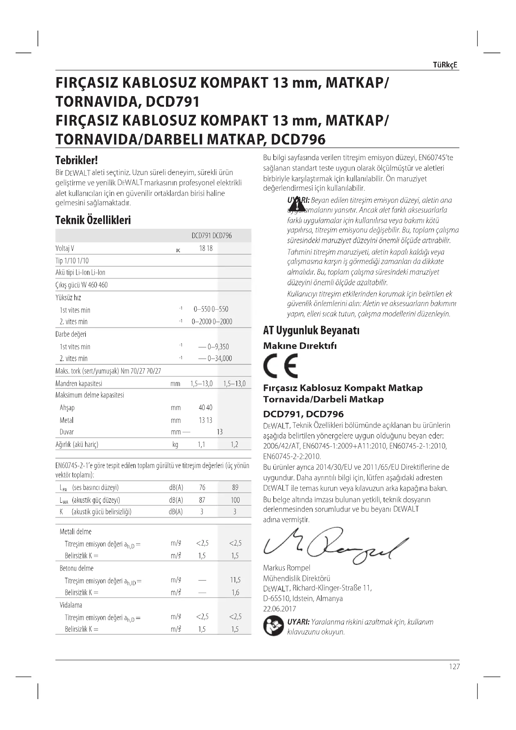 Bu ürünler ayrıca 2014/30/EU ve 2011/65/EU Direktiflerine de uygundur. Daha ayrıntılı bilgi için, lütfen aşağıdaki adresten DEWALT ile temas kurun veya kılavuzun arka kapağına bakın. Bu belge altında imzası bulunan yetkili, teknik dosyanın derlenmesinden sorumludur ve bu beyanı DEWALT adına vermiştir.