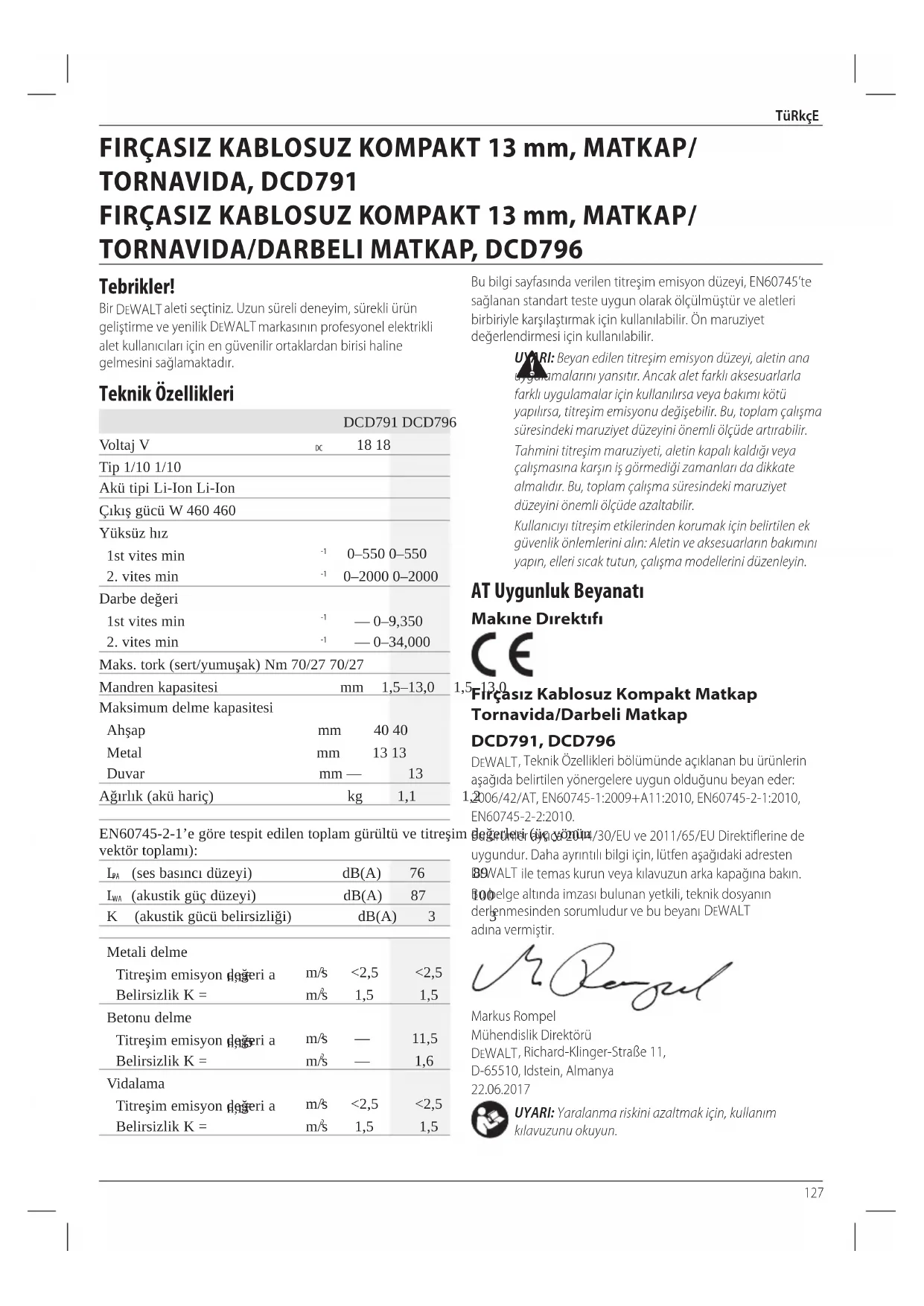 100belge alteinda imzasi bulunan yetkili, teknik dosyanin derlenmesinden sorumludur ve bu beyani DEWALT adina vermistir.