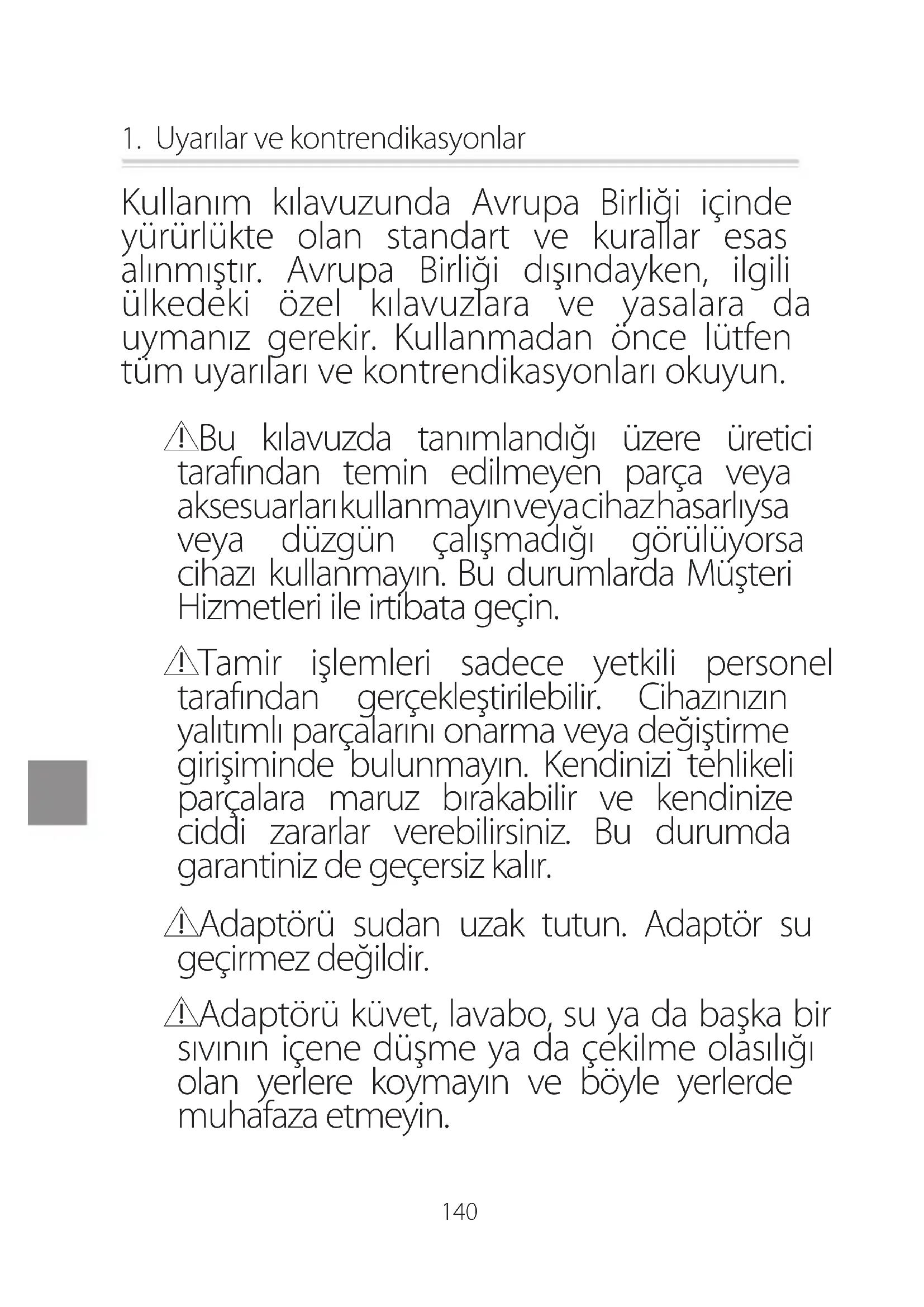 ⚠Kablosu ya da fişi zarar görmüş, düzgün çalışmayan ya da suya batırılmış adaptörü kullanmayın. Böyle bir durumda, hemen adaptörün fişini prizden çekin.