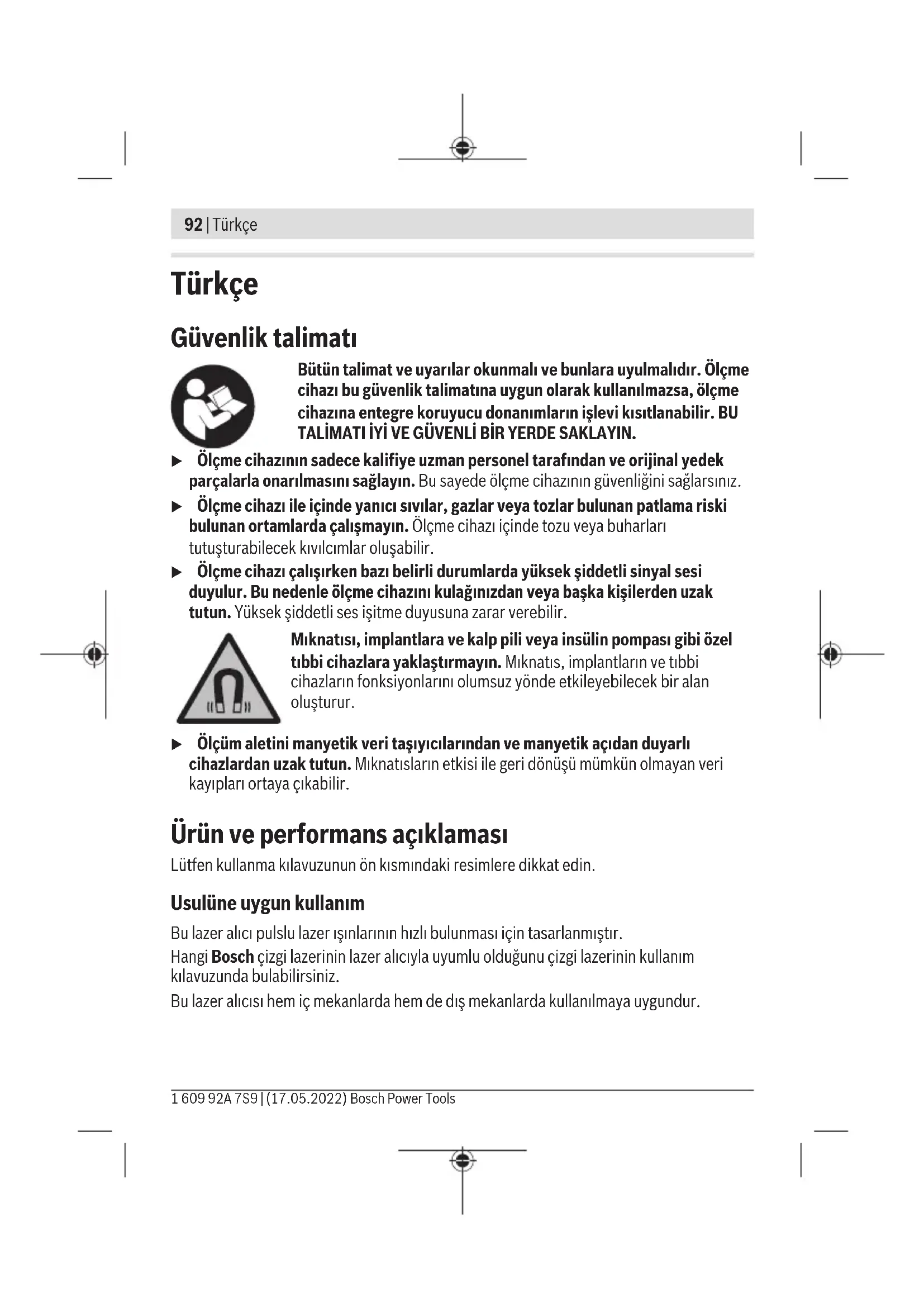 Οι δέκτες λέιζερ, τα εξαρτήματα και οι συσκευασίες πρέπει να ανακυκλώνονται με τρόπο φι- λικό προς το περιβάλλον. Μη ρίχνετε τον δέκτη λέιζερ και τις μπαταρίες στα οικιακά απορρίμματα! Μόνο για χώρες τηςΕΕ: Σύμφωνα με την Ευρωπαϊκή οδηγία 2012/19/ΕΕ σχετικά με τις παλιές ηλεκτρικές και ηλε- κτρονικές συσκευές και τη μεταφορά της οδηγίας αυτής σε εθνικό δίκαιο οι άχρηστοι δέκτες λέιζερ και σύμφωνα με την Ευρωπαϊκή οδηγία 2006/66/ΕΚ οι χαλασμένες ή χρησιμοποιη- μένες μπαταρίες πρέπει να συλλέγονται ξεχωριστά, για να ανακυκλωθούν με τρόπο φιλικό προς το περιβάλλον. Σε περίπτωση μη ενδεδειγμένης απόσυρσης οι ηλεκτρικές και ηλεκτρονικές συσκευές λόγω ενδεχομένης παρουσίας επικίνδυνων ουσιών μπορούν να έχουν επιβλαβείς επιπτώσεις στο περιβάλλον και στην ανθρώπινη υγεία. Bosch Power Tools 1 609 92A 7S9 | (17.05.2022)92 | Türkçe Türkçe Güvenlik talimatı Bütün talimat ve uyarılar okunmalı ve bunlara uyulmalıdır. Ölçme cihazı bu güvenlik talimatına uygun olarak kullanılmazsa, ölçme cihazına entegre koruyucu donanımların işlevi kısıtlanabilir. BU TALİMATI İYİ VE GÜVENLİ BİR YERDE SAKLAYIN. u Ölçme cihazının sadece kalifiye uzman personel tarafından ve orijinal yedek parçalarla onarılmasını sağlayın. Bu sayede ölçme cihazının güvenliğini sağlarsınız. u Ölçme cihazı ile içinde yanıcı sıvılar, gazlar veya tozlar bulunan patlama riski bulunan ortamlarda çalışmayın. Ölçme cihazı içinde tozu veya buharları tutuşturabilecek kıvılcımlar oluşabilir. u Ölçme cihazı çalışırken bazı belirli durumlarda yüksek şiddetli sinyal sesi duyulur. Bu nedenle ölçme cihazını kulağınızdan veya başka kişilerden uzak tutun. Yüksek şiddetli ses işitme duyusuna zarar verebilir. Mıknatısı, implantlara ve kalp pili veya insülin pompası gibi özel tıbbi cihazlara yaklaştırmayın. Mıknatıs,implantların ve tıbbi cihazların fonksiyonlarını olumsuz yönde etkileyebilecek bir alan oluşturur. u Ölçüm aletini manyetik veri taşıyıcılarından ve manyetik açıdan duyarlı cihazlardan uzak tutun. Mıknatısların etkisi ile geri dönüşü mümkün olmayan veri kayıpları ortaya çıkabilir. Ürün ve performans açıklaması Lütfen kullanma kılavuzunun ön kısmındaki resimlere dikkat edin. Usulüne uygun kullanım Bu lazer alıcı pulslu lazer ışınlarının hızlı bulunması için tasarlanmıştır. HangiBosch çizgi lazerinin lazer alıcıyla uyumlu olduğunu çizgi lazerinin kullanım kılavuzunda bulabilirsiniz. Bu lazer alıcısı hem iç mekanlarda hem de dış mekanlarda kullanılmaya uygundur. 1 609 92A 7S9 | (17.05.2022) Bosch Power ToolsTürkçe | 93 Şekli gösterilen elemanlar Şekli gösterilen elemanların numaraları ile grafik sayfasındaki lazer alıcısı resmindeki numaralar aynıdır. (1) Algılama hassasiyeti ayar tuşu (2) Açma/kapama tuşu (3) Durum göstergesi (4) Sinyal sesi tuşu (5) Hoparlör (6) LED yön göstergesi "Lazer ışını orta hattın üstünde" (7) LED orta hat (8) LED yön göstergesi "Lazer ışını orta hattın altında" (9) Lazer ışını algılama alanı (10) Mıknatıslar (11) Tutucu düzeneği için kılavuz oluk (12) Merkezi işaret (13) Seri numarası (14) Pil haznesi kapağı (15) Pil haznesi kapağı kilidi (16) Tutucu düzeneği