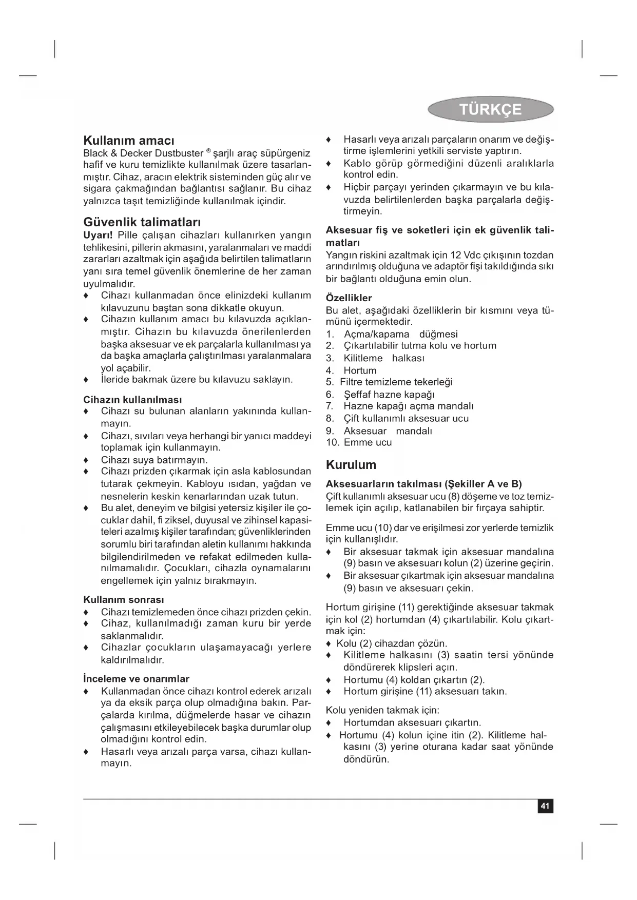 Kullanım 12 Vdc aksesuar fi şi kullanılarak bir güç kayna- ğına bağlanması (Şekiller C ve D) Not: Fişin ucu artı (+), yan bağlantı ise eksidir (-). ♦ Cihazın tabanındaki aksesuar yuvasından (13) 12 Vdc aksesuar fi şini (12) çıkartın. ♦ Kablo klipsini (14) kablo haznesinden çözün. ♦ Kabloyu kablo haznesinden (15) tamamen çö- zün. ♦ 12 Vdc aksesuar fi şini (12) bir taşıtın veya dc güç kaynağının aksesuar çıkışına sıkıca takmak suretiyle cihazınızı güç kaynağına bağlayın. Not: Bazı taşıtlarda aksesuar soketi sadece kontak açıldığında çalışır duruma gelebilir. Uyarı! Pozitif topraklamalı elektrik sistemlerinde (yani eski araçlarda) kullanmayın. Uyarı! Ters kutup bağlantısı sigortanın atmasına yol açar ve cihazda kalıcı hasara yol açabilir. ♦ Cihazınızı kullandıktan sonra: ♦ 12 Vdc aksesuar fi şini (12) 12 Vdc güç kayna- ğından çıkartın. ♦ Kabloyu kablo haznesine (15) sarın ve kablo klipsiyle (14) sabitleyin. ♦ 12 Vdc aksesuar fi şini (12) cihazın tabanındaki aksesuar yuvasında (13) saklayın. Cihazın çalıştırılması ♦ Açmak için, açma/kapama düğmesini (1) sağa itin. ♦ Kapatmak için, açma/kapama düğmesini (1) kapanma konumunda sabitlenene kadar sola itin. Cihaz, iyi durumdaki ve normal şarjlı bir araç aküsü ile akünün güç seviyesini fazla etkilemeden 30 da- kikaya kadar çalışabilir. Uyarı! Daha uzun süreli kullanım aküyü bitirecektir. Temizlik yaparken aracın motoru çalışmamalıdır. Bu araç süpürgesinin ömrünü kısaltabilir. Temizleme ♦ Cihazı kullanırken hortumun sıkışmadığından, kıvrılmadığından veya tıkanmadığından emin olun. ♦ Tutma kolu (2) cihazdan kolayca çıkartılarak, cihazın 1,5 metre civarında temizlik yapmanıza imkan verir. ♦ Tutma kolu (2) çıkartıldığında cihaz üzerindeki entegre koldan tutulabilir. ♦ Tutma kolu (2) hortumdan da (4) ayrılabilir ve bu sayede gerektiğinde hortum girişine (11) aksesuar takılabilir. Yararlı tavsiyeler ♦ Basamaklarda temizlik yaparken en aşağıdan başlayıp yukarı doğru çıkın. Emiş gücünün en iyi duruma getirilmesi (Şe- kil G) Emiş gücünü en iyi durumda tutmak için, fi ltrelerin kullanım sırasında düzenli aralıklarla temizlenmesi gerekir. ♦ Filtre temizleme tekerleğini (5) fi ltrelerin üze- rindeki tozu çıkarmak için 2 kere saat yönünde döndürün. ♦ İnce partikül fi ltresi düzenli aralıklarla temizlen- melidir, “ince partikül fi ltresinin temizlenmesi” bölümüne bakın Temizlik ve bakım Black & Decker aletiniz minimum bakımla uzun bir süre çalışacak şekilde tasarlanmıştır. Kesintisiz olarak memnuniyet verici bir şekilde çalışması gerekli özenin gösterilmesine ve düzenli temizliğe bağlı dır. Uyarı ! Cihaz üzerinde herhangi bir bakım veya temizlik işlemi gerçekleştirmeden önce cihazın fi şini çekin. Cihazı zaman zaman nemli bir bezle silin. Aşındırıcı veya çözücü bazlı temizleyiciler kullanmayın. Cihazı suya batırmayın. Toz haznesinin temizlenmesi (Şekil E) Toz haznesi düzenli olarak, tercihen her kullanımdan sonra temizlenmelidir. ♦ Hazne kapağı açma mandalına (7) basın ve şeffaf hazne kapağını (6) açık konumda sabit kalacak şekilde 180° açı