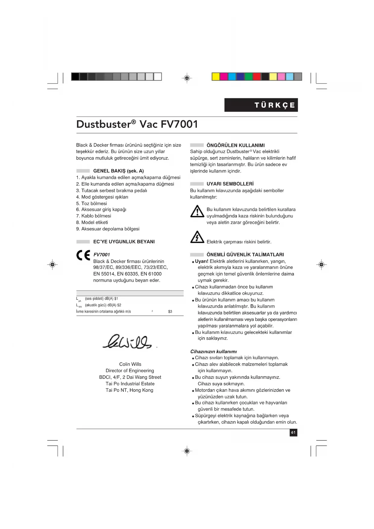 FV7001 Black & Decker firması ürünlerinin 98/37/EC, 89/336/EEC, 73/23/EEC, EN 55014, EN 60335, EN 61000 normuna uyduğunu beyan eder.