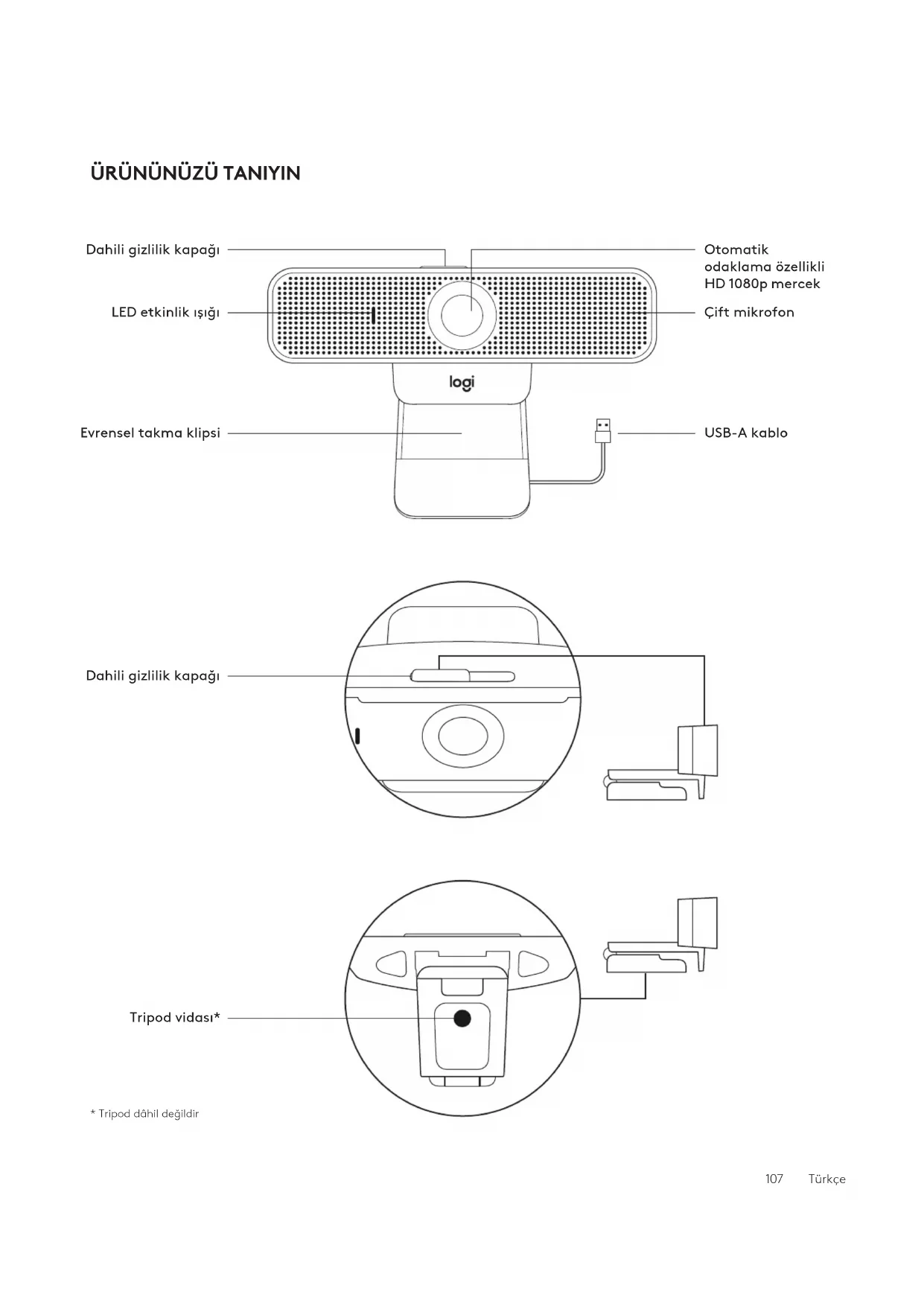 Monitöre yerleştirmek için 1 Web kameranızı bir bilgisayara, dizüstü bilgisayara veya monitöre istediğiniz bir konum veya açıda yerleştirin. 2 Evrensel montaj klipsindeki ayağın cihazınızın arkasıylaaynı hizada olduğundan emin olarak webkamerasını ayarlayın. 3 Kendinizi kamera çerçevesinin içine alacak şekilde webkamerasını yukarı/aşağı ayarlayarak en iyi konuma getirin. Tripoda yerleştirmek için* 1 ¼ inç tripod vidasını, evrensel montaj klipsinin alt kısmına yerleştirin. 2 Tripodunuzu ¼ inç vidaya doğru çevirerek webkamerasını tripoda sabitleyin. 3 Kendinizi kamera çerçevesinin içine almak için webkameranızı tripodla birlikte dilediğiniz yerde en iyi konuma yerleştirin. 109 TürkçeSABİT MONTAJ KLİPSİ İLE BİRLİKTE: Yükseklk x Genşlk x Dernlk: 73 mm (2,9 nç) x 126 mm (5,0 nç) x 45 mm (1,8 nç) Kablo Uzunluğu: 1,83 m (6 ft) Ağırlık: 170 g (6,0 ons) BOYUTLAR www.logitech.com/support/C925e © 2021 Logitech, Logi ve Logitech logosu, ABD ve diğer ülkelerde Logitech Europe S.A.’nın ve/veyabağlı kuruluşlarının ticari veya tescilli ticari markalarıdır. Logitech bu kılavuzda bulunabilecekhatalar için hiçbir sorumluluk kabul etmez. Burada bulunan bilgiler önceden haberverilmeksizin değiştirilebilir.