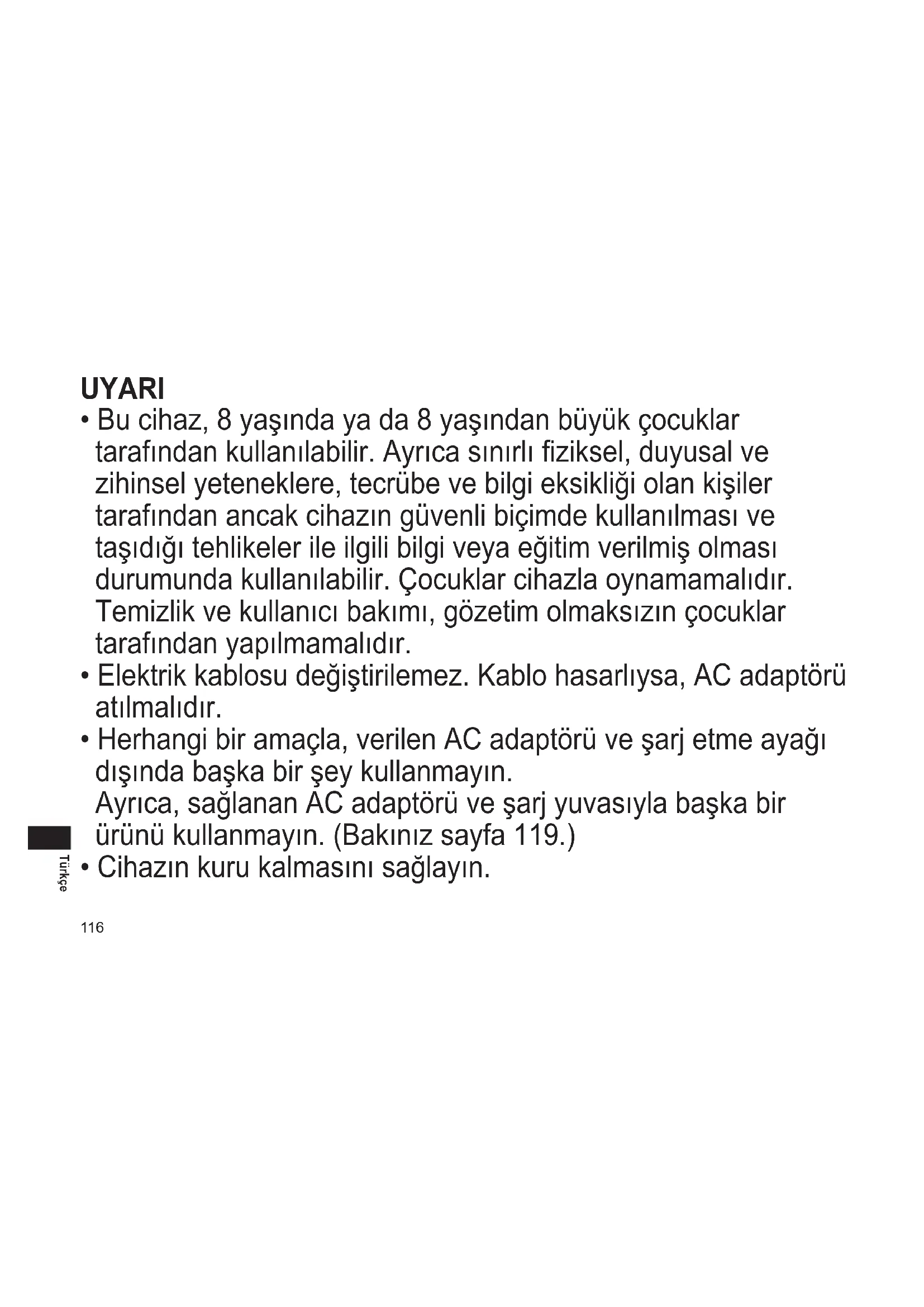 - Bu cihaz, 8 yaşında ya da 8 yaşından büyük çocuklar tarafından kullanılabilir. Ayrıca sınırlı fiziksel, duyusal ve zihinsel yeteneklere, tecrübe ve bilgi eksikliği olan kişiler tarafından ancak cihazın güvenli biçimde kullanılması ve taşıdığı tehlikeler ile ilgili bilgi veya eğitim verilmiş olması durumunda kullanılabilir. Çocuklar cihazla oynamamalıdır. Temizlik ve kullanıcı bakımı, gözetim olmaksızın çocuklar tarafından yapılmamalıdır.