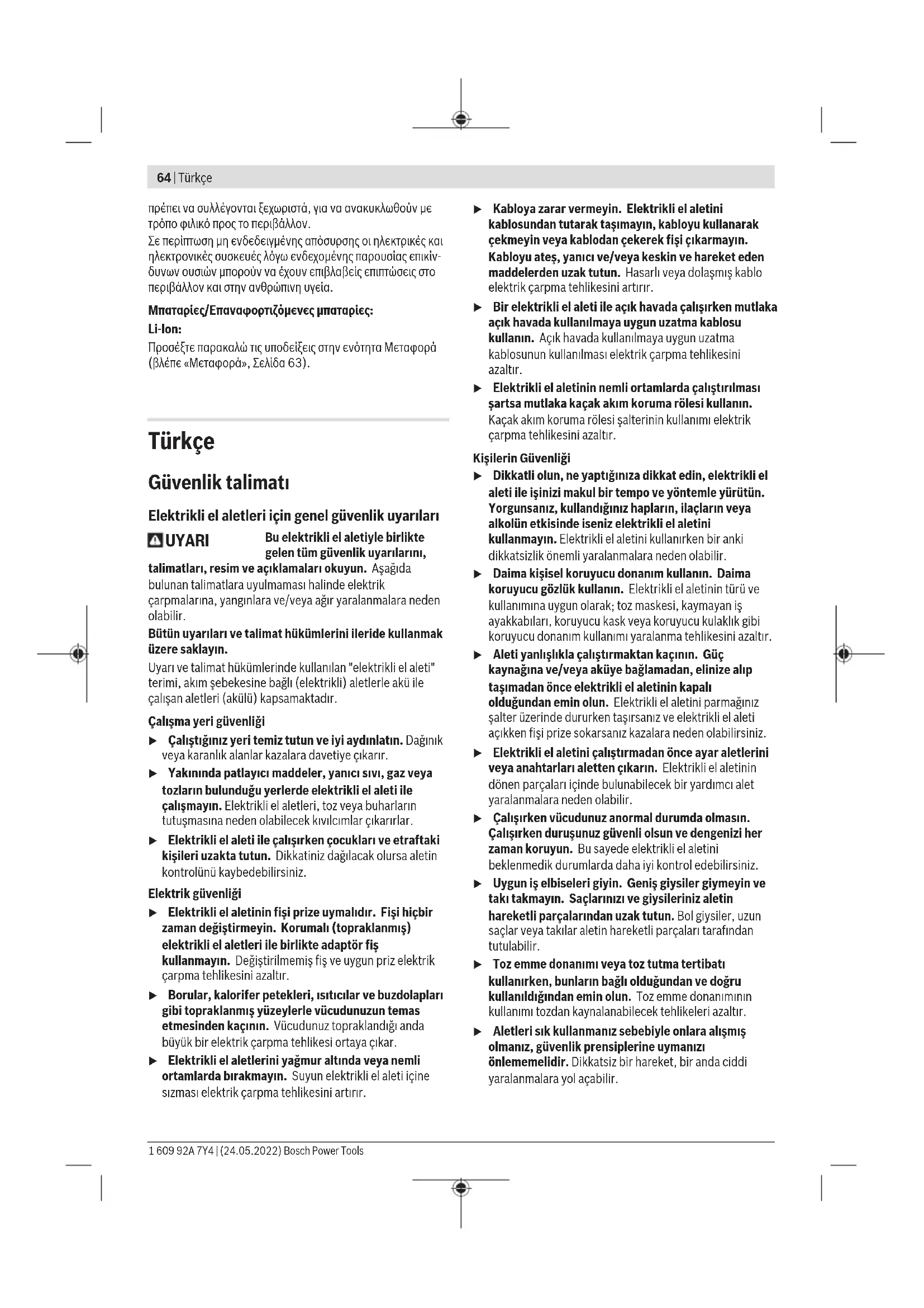 Τα ηλεκτρικά εργαλεία, οι μπαταρίες, τα εξαρτή- ματα και οι συσκευασίες πρέπει να ανακυκλώνο- νται με τρόπο φιλικό προς το περιβάλλον. Μην ρίχνετε τα ηλεκτρικά εργαλεία και τις μπατα- ρίες στα απορρίμματα του σπιτιού σας! Μόνο για χώρες τηςΕΕ: Σύμφωνα με την Ευρωπαϊκή οδηγία 2012/19/ΕΕ σχετικά με τις παλιές ηλεκτρικές και ηλεκτρονικές συσκευές και τη μετα- φορά της οδηγίας αυτής σε εθνικό δίκαιο τα άχρηστα ηλεκτρι- κά εργαλεία και σύμφωνα με την Ευρωπαϊκή οδηγία 2006/66/ΕΚ οι χαλασμένες ή χρησιμοποιημένες μπαταρίες Bosch Power Tools 1 609 92A 7Y4 | (24.05.2022)64 | Türkçe πρέπει να συλλέγονται ξεχωριστά, για να ανακυκλωθούν με τρόπο φιλικό προς το περιβάλλον. Σε περίπτωση μη ενδεδειγμένης απόσυρσης οι ηλεκτρικές και ηλεκτρονικές συσκευές λόγω ενδεχομένης παρουσίας επικίν- δυνων ουσιών μπορούν να έχουν επιβλαβείς επιπτώσεις στο περιβάλλον και στην ανθρώπινη υγεία. Μπαταρίες/Επαναφορτιζόμενες μπαταρίες: Li-Ion: Προσέξτε παρακαλώ τις υποδείξεις στην ενότητα Μεταφορά (βλέπε «Μεταφορά», Σελίδα63). Türkçe Güvenlik talimatı Elektrikli el aletleri için genel güvenlik uyarıları UYARI Bu elektrikli el aletiyle birlikte gelen tüm güvenlik uyarılarını, talimatları, resim ve açıklamaları okuyun. Aşağıda bulunan talimatlara uyulmaması halinde elektrik çarpmalarına, yangınlara ve/veya ağır yaralanmalara neden olabilir. Bütün uyarıları ve talimat hükümlerini ileride kullanmak üzere saklayın. Uyarı ve talimat hükümlerinde kullanılan "elektrikli el aleti" terimi, akım şebekesine bağlı (elektrikli) aletlerle akü ile çalışan aletleri (akülü) kapsamaktadır. Çalışma yeri güvenliği u Çalıştığınız yeri temiz tutun ve iyi aydınlatın. Dağınık veya karanlık alanlar kazalara davetiye çıkarır. u Yakınında patlayıcı maddeler, yanıcı sıvı, gaz veya tozların bulunduğu yerlerde elektrikli el aleti ile çalışmayın. Elektrikli el aletleri, toz veya buharların tutuşmasına neden olabilecek kıvılcımlar çıkarırlar. u Elektrikli el aleti ile çalışırken çocukları ve etraftaki kişileri uzakta tutun. Dikkatiniz dağılacak olursa aletin kontrolünü kaybedebilirsiniz. Elektrik güvenliği u Elektrikli el aletinin fişi prize uymalıdır. Fişi hiçbir zaman değiştirmeyin. Korumalı (topraklanmış) elektrikli el aletleri ile birlikte adaptör fiş kullanmayın. Değiştirilmemiş fiş ve uygun priz elektrik çarpma tehlikesini azaltır. u Borular, kalorifer petekleri, ısıtıcılar ve buzdolapları gibi topraklanmış yüzeylerle vücudunuzun temas etmesinden kaçının. Vücudunuz topraklandığı anda büyük bir elektrik çarpma tehlikesi ortaya çıkar. u Elektrikli el aletlerini yağmur altında veya nemli ortamlarda bırakmayın. Suyun elektrikli el aleti içine sızması elektrik çarpma tehlikesini artırır. u Kabloya zarar vermeyin. Elektrikli el aletini kablosundan tutarak taşımayın, kabloyu kullanarak çekmeyin veya kablodan çekerek fişi çıkarmayın. Kabloyu ateş, yanıcı ve/veya keskin ve hareket eden maddelerden uzak tutun. Hasarlı veya dolaşmış kablo elektrik çarpma tehlikesini artırır. u Bir elektrikli el aleti ile açık havada çalışırken mutlaka açık havada kullanılmaya uygun uzatma kablosu kullanın. Açık havada kullanılmaya uygun uzatma kablosunun kullanılması elektrik çarpma tehlikesini azaltır. u Elektrikli el aletinin nemli ortamlarda çalıştırılması şartsa mutlaka kaçak akım koruma rölesi kullanın. Kaçak akım koruma rölesi şalterinin kullanımı elektrik çarpma tehlikesini azaltır. Kişilerin Güvenliği u Dikkatli olun, ne yaptığınıza dikkat edin, elektrikli el aleti ile işinizi makul bir tempo ve yöntemle yürütün. Yorgunsanız, kullandığınız hapların, ilaçların veya alkolün etkisinde iseniz elektrikli el aletini kullanmayın. Elektrikli el aletini kullanırken bir anki dikkatsizlik önemli yaralanmalara neden olabilir. u Daima kişisel koruyucu donanım kullanın. Daima koruyucu gözlük kullanın. Elektrikli el aletinin türü ve kullanımına uygun olarak; toz maskesi, kaymayan iş ayakkabıları, koruyucu kask veya koruyucu kulaklık gibi koruyucu donanım kullanımı yaralanma tehlikesini azaltır. u Aleti yanlışlıkla çalıştırmaktan kaçının. Güç kaynağına ve/veya aküye bağlamadan, elinize alıp taşımadan önce elektrikli el aletinin kapalı olduğundan emin olun. Elektrikli el aletini parmağınız şalter üzerinde dururken taşırsanız ve elektrikli el aleti açıkken fişi prize sokarsanız kazalara neden olabilirsiniz. u Elektrikli el aletini çalıştırmadan önce ayar aletlerini veya anahtarları aletten çıkarın. Elektrikli el aletinin dönen parçaları içinde bulunabilecek bir yardımcı alet yaralanmalara neden olabilir. u Çalışırken vücudunuz anormal durumda olmasın. Çalışırken duruşunuz güvenli olsun ve dengenizi her zaman koruyun. Bu sayede elektrikli el aletini beklenmedik durumlarda daha iyi kontrol edebilirsiniz. u Uygun iş elbiseleri giyin. Geniş giysiler giymeyin ve takı takmayın. Saçlarınızı ve giysileriniz aletin hareketli parçalarından uzak tutun. Bol giysiler, uzun saçlar veya takılar aletin hareketli parçalar