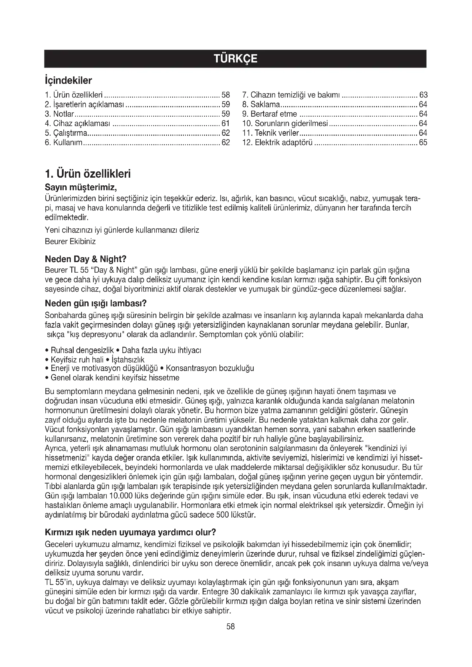 Sayın müşterimiz, Ürünlerimizden birini seçtiğiniz için teşekkür ederiz. Isı, ağırlık, kan basıncı, vücut sıcaklığı, nabız, yumuşak tera- pi, masaj ve hava konularında değerli ve titizlikle test edilmiş kaliteli ürünlerimiz, dünyanın her tarafında tercih edilmektedir. Yeni cihazınızı iyi günlerde kullanmanızı dileriz Beurer Ekibiniz Neden Day & Night? Beurer TL 55 “Day & Night” gün ışığı lambası, güne enerji yüklü bir şekilde başlamanız için parlak gün ışığına vegece daha iyi uykuya dalıp deliksiz uyumanız için kendi kendine kısılan kırmızı ışığa sahiptir. Bu çift fonksiyon sayesinde cihaz, doğal biyoritminizi aktif olarak destekler ve yumuşak bir gündüz-gece düzenlemesi sağlar. Neden gün ışığı lambası? Sonbaharda güneş ışığı süresinin belirgin bir şekilde azalması ve insanların kış aylarında kapalı mekanlarda daha fazla vakit geçirmesinden dolayı güneş ışığı yetersizliğinden kaynaklanan sorunlar meydana gelebilir. Bunlar, sıkça "kış depresyonu" olarak da adlandırılır. Semptomları çok yönlü olabilir: