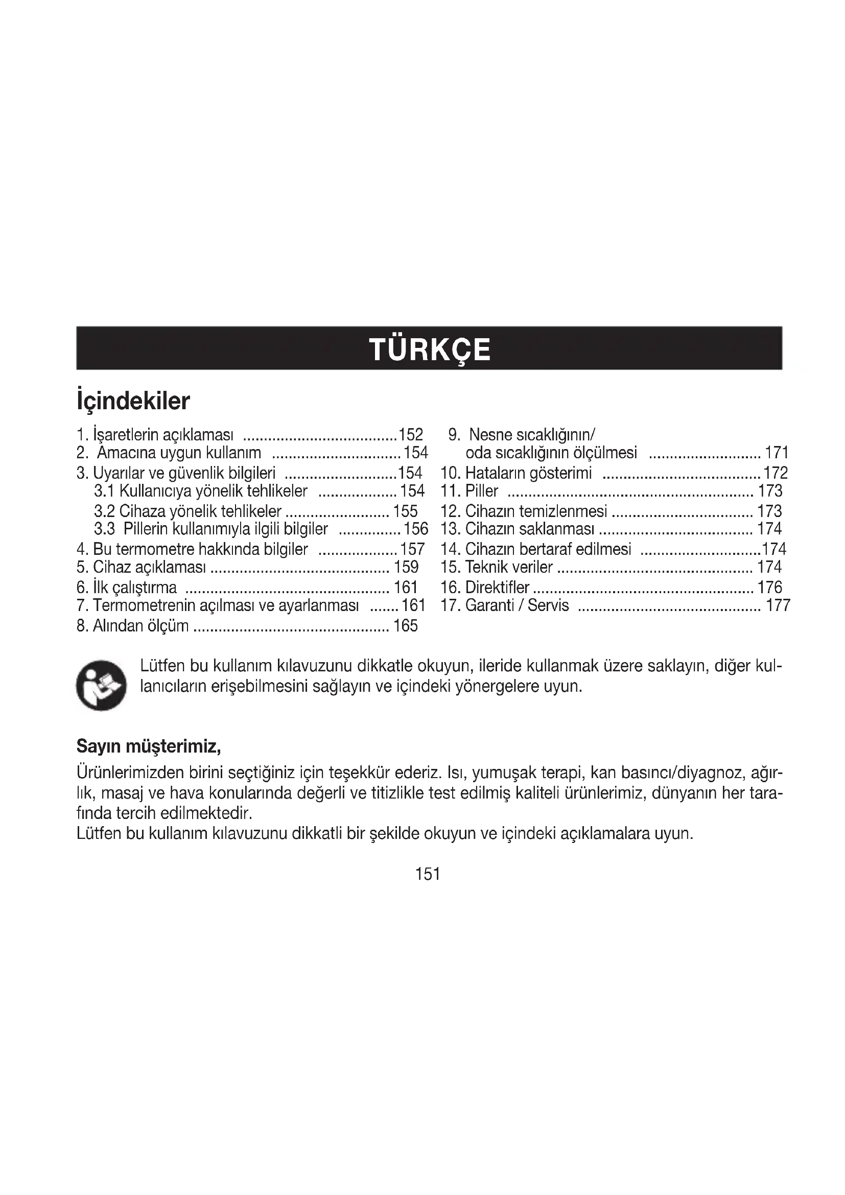 tavia esistere diritti derivanti dalla responsabilità per i prodotti o da altre disposizioni di legge obbligatorie in materia di responsabilità). Le riparazioni o la sostituzione completa non prolungano in alcun caso il periodo di garanzia. Salvo errori e modifiche151 İçindekiler Lütfen bu kullanım kılavuzunu dikkatle okuyun, ileride kullanmak üzere saklayın, diğer kul- lanıcıların erişebilmesini sağlayın ve içindeki yönergelere uyun. Sayın müşterimiz, Ürünlerimizden birini seçtiğiniz için teşekkür ederiz. Isı, yumuşak terapi, kan basıncı/diyagnoz, ağır- lık, masaj ve hava konularında değerli ve titizlikle test edilmiş kaliteli ürünlerimiz, dünyanın her tara- fında tercih edilmektedir. Lütfen bu kullanım kılavuzunu dikkatli bir şekilde okuyun ve içindeki açıklamalara uyun.