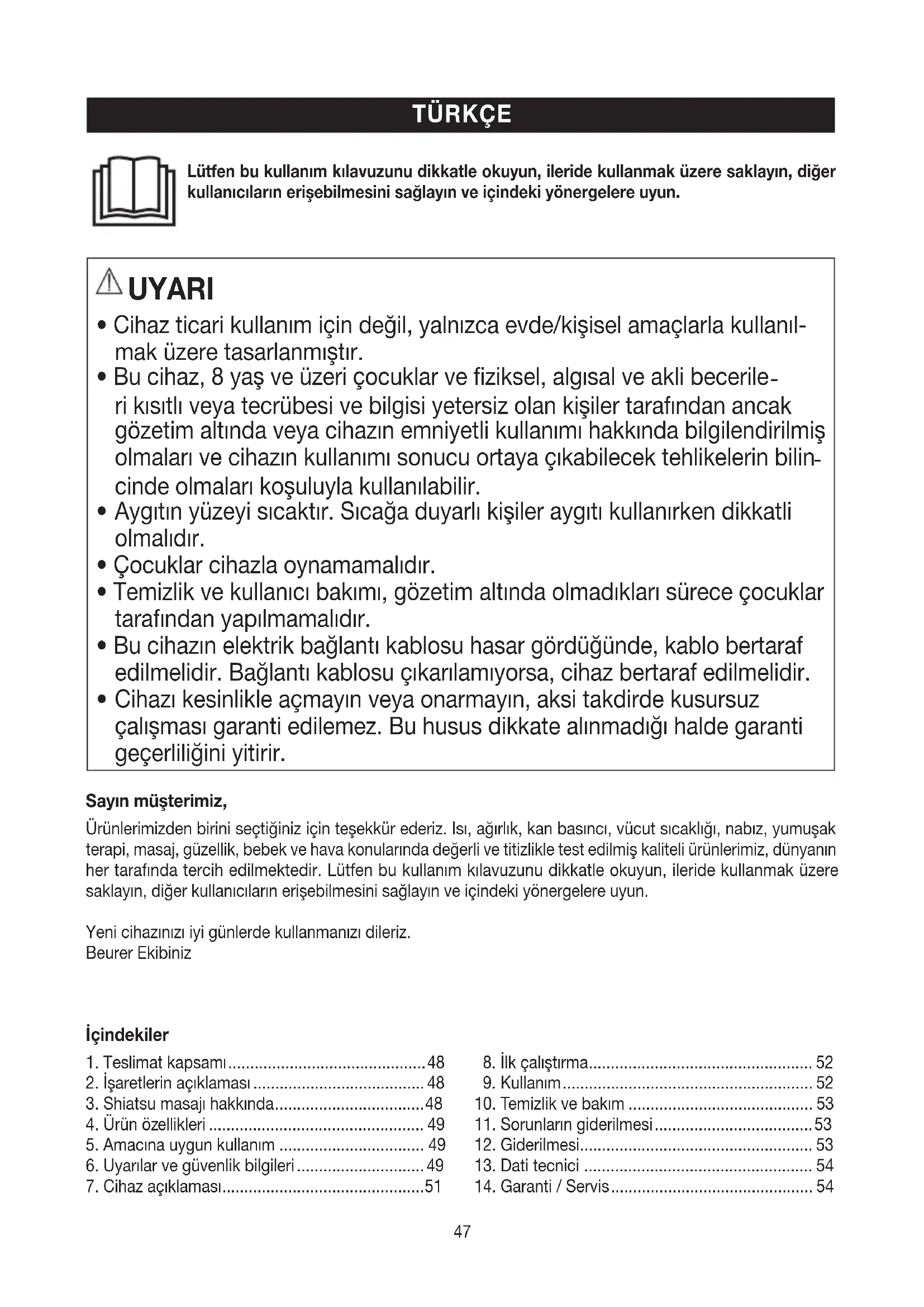 - Cihazı kesinlikle açmayın veya onarmayın, aksi takdirde kusursuz çalışması garanti edilemez. Bu husus dikkate alınmadığı halde garanti geçerliliğini yitirir. Sayın müşterimiz, Ürünlerimizden birini seçtiğiniz için teşekkür ederiz. Isı, ağırlık, kan basıncı, vücut sıcaklığı, nabız, yumuşak terapi, masaj, güzellik, bebek ve hava konularında değerli ve titizlikle test edilmiş kaliteli ürünlerimiz, dünyanın her tarafında tercih edilmektedir. Lütfen bu kullanım kılavuzunu dikkatle okuyun, ileride kullanmak üzere saklayın, diğer kullanıcıların erişebilmesini sağlayın ve içindeki yönergelere uyun. Yeni cihazınızı iyi günlerde kullanmanızı dileriz. Beurer Ekibiniz