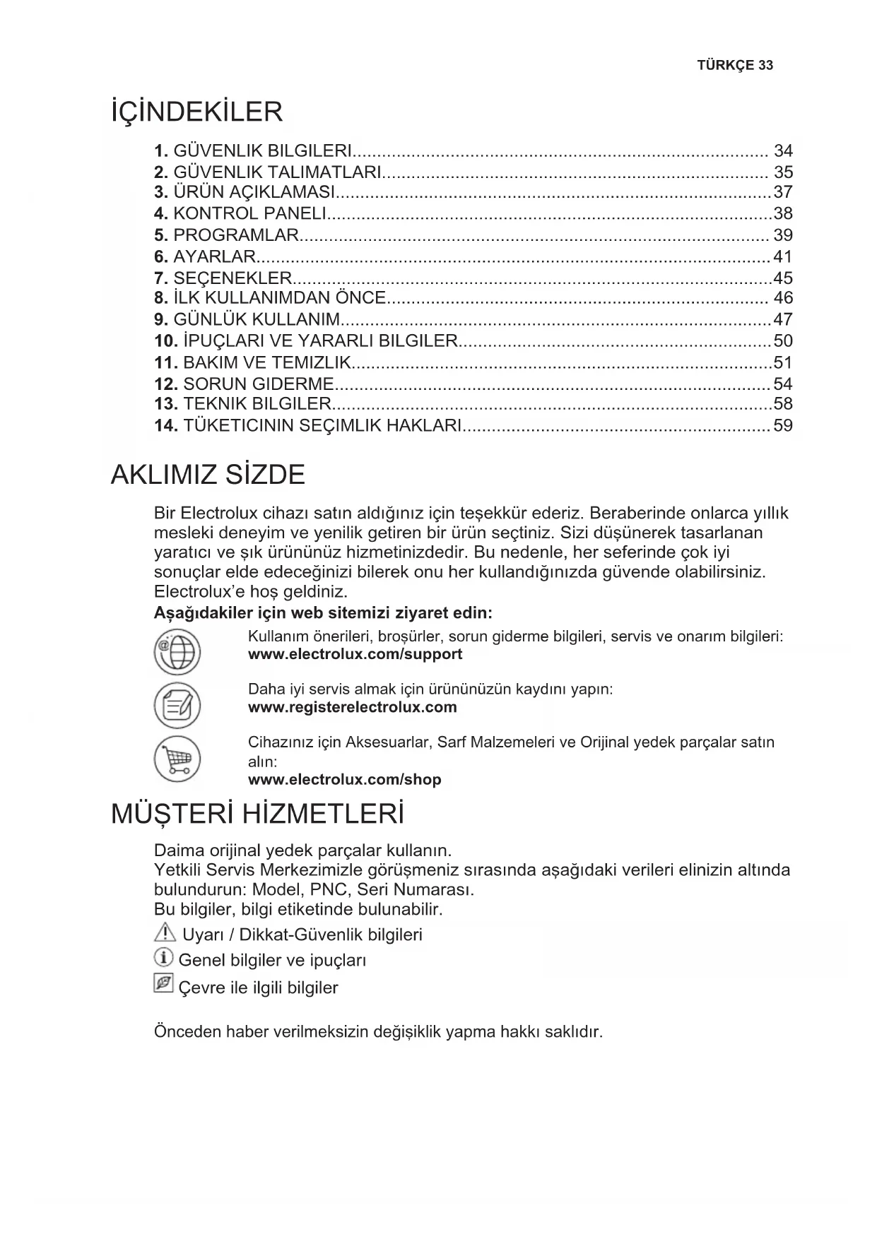 Bir Electrolux cihazı satın aldığınız için teşekkür ederiz. Beraberinde onlarca yıllık mesleki deneyim ve yenilik getiren bir ürün seçtiniz. Sizi düşünerek tasarlanan yaratıcı ve şık ürününüz hizmetinizdedir. Bu nedenle, her seferinde çok iyi sonuçlar elde edeceğinizi bilerek onu her kullandığınızda güvende olabilirsiniz. Electrolux’e hoş geldiniz. Aşağıdakiler için web sitemizi ziyaret edin: Kullanım önerileri, broşürler, sorun giderme bilgileri, servis ve onarım bilgileri: www.electrolux.com/support Daha iyi servis almak için ürününüzün kaydını yapın: www.registerelectrolux.com Cihazınız için Aksesuarlar, Sarf Malzemeleri ve Orijinal yedek parçalar satın alın: www.electrolux.com/shop