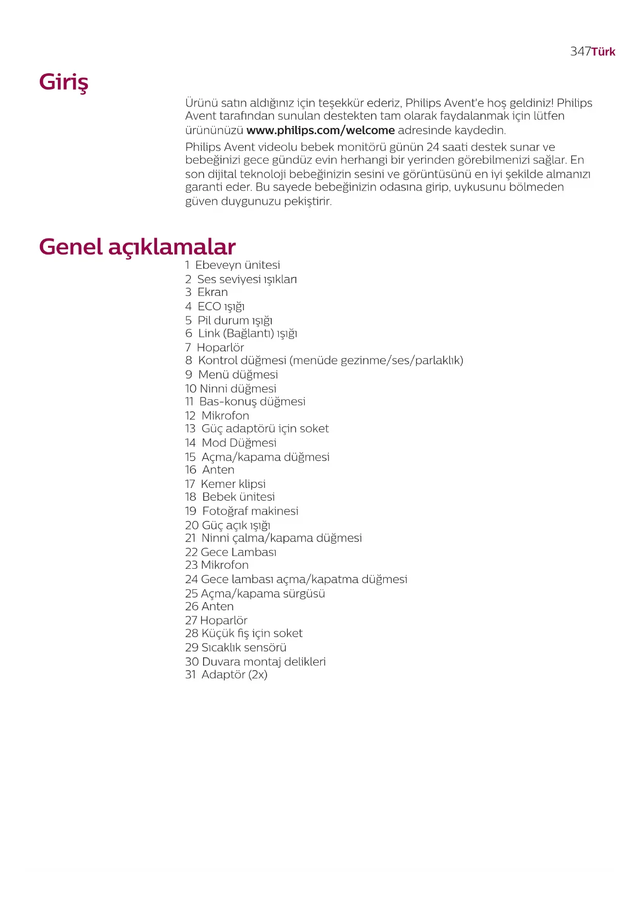 Urunu satin aldiginiz icin teşekkür ederiz, Philips Avent'e hos geldiniz! Philips Avent tarafindan sunulan destekten tam olarak faydalanmak icin luffen urununuzu www.philips.com/welcome adresinde kaydedin.