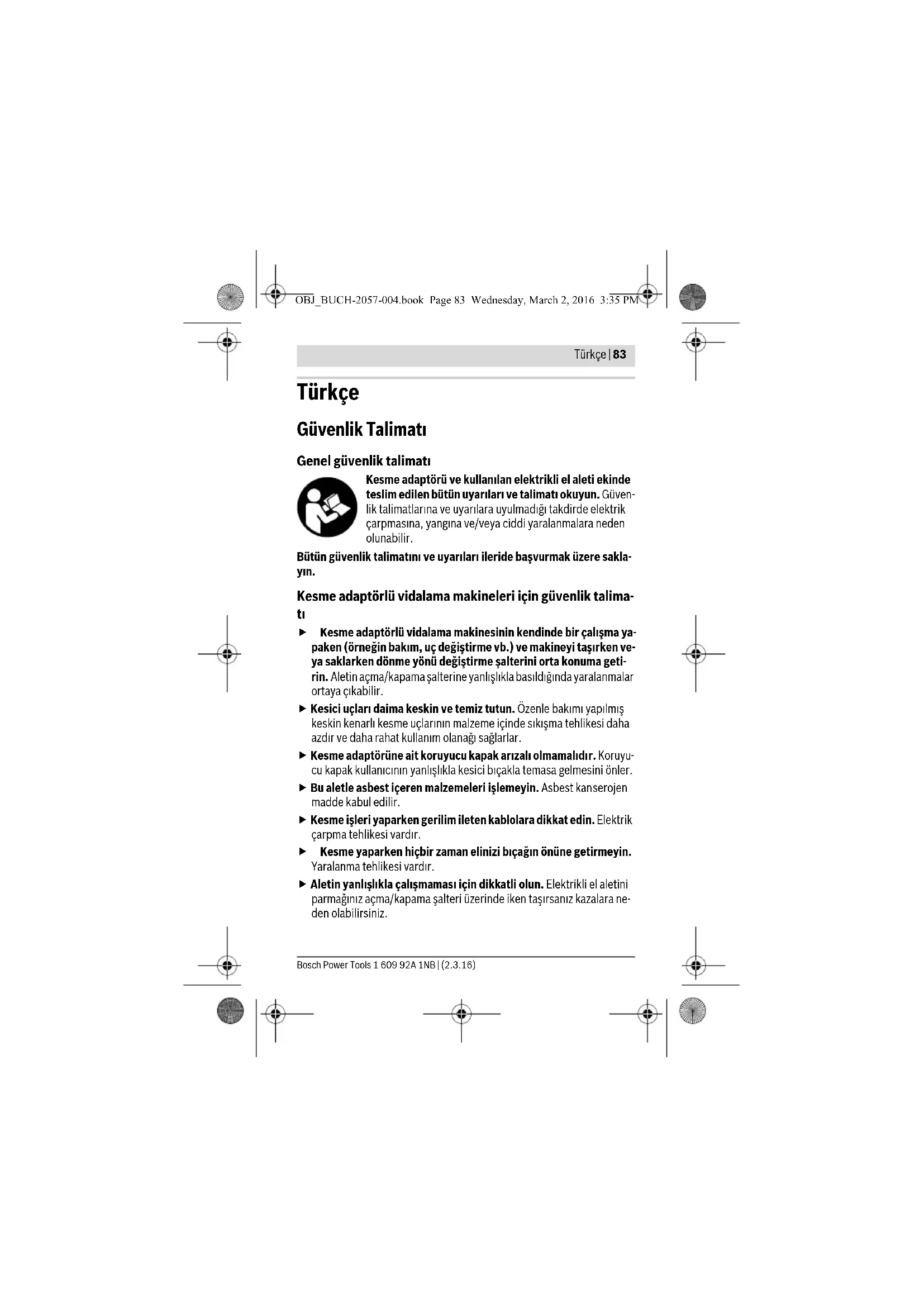 Lastik başlık Şekli gösterilen veya tanımlanan aksesuar standart teslimat kapsamında değil- dir. Aksesuarın tümünü aksesuar programımızda bulabilirsiniz. OBJ_BUCH-2057-004.book Page 84 Wednesday, March 2, 2016 3:35 PMTürkçe | 85 Bosch Power Tools 1 609 92A 1NB | (2.3.16) Teknik veriler Uygunluk beyanı Tek sorumlu olarak “Teknik veriler” bölümünde tanımlanan ürünün, deği- şiklikleri de dahil olmak üzere 2006/42/EC yönergesi hükümlerine uygun olduğunu beyan ederiz. Teknik belgelerin bulunduğu merkez (2006/42/EC): Robert Bosch Power Tools GmbH, PT/ETM9, 70538 Stuttgart, GERMANY Robert Bosch Power Tools GmbH 70538 Stuttgart, GERMANY Stuttgart, 01.01.2017 Montaj Kesme adaptörlü vidalama makinesinin kendinde bir çalışma ya- paken (örneğin bakım, uç değiştirme vb.) ve makineyi taşırken ve- ya saklarken dönme yönü değiştirme şalterini orta konuma geti- rin. Aletin açma/kapama şalterine yanlışlıkla basıldığında yaralanmalar ortaya çıkabilir. Kesme adaptörünün takılması (Bakınız: Şekiller A1 – A2) – Kesme adaptörünü 1 takmadan önce vidalama makinesinin lastik kapa- ğını 9 öne doğru çekerek çıkarın. – Daha sonra kesme adaptörünü vidalama makinesine takın. Kesme adaptörü işitilir biçimde kavrama yapmalıdır. Kesme adaptörü Cutter Ürün kodu 1 600 A00 1YN Ağırlığı EPTA-Procedure 01:2014’e göre kg 0,15 Henk Becker Executive Vice President Engineering Helmut Heinzelmann Head of Product Certification PT/ETM9 OBJ_BUCH-2057-004.book Page 85 Wednesday, March 2, 2016 3:35 PM86 | Türkçe 1 609 92A 1NB | (2.3.16) Bosch Power Tools Not: Kesme adaptörünü 8 değişik konumda takabilirsiniz. Bu yolla örne- ğin bir zemin kaplamasını duvar boyunca kesme gibi optimum çalışma po- zisyonuna sahip olursunuz. Demontaj (Bakınız: Şekiller B1–B2) – Boşa alma halkasını 4 dönme yönünde çevirin ve kesme ataptörünü öne doğru çekerek () çıkarın. – Daha sonra lastik kapağı 9 tekrar vidalama makinesine takın. Kesici bıçağın değiştirilmesi (Bakınız: Şekiller C1–C2) Not: Kesici bıçağı sadece kesme adaptörü vidalama makinesinde takılı du- rumda değiştirin. Bu durumda alet mili blokajlıdır ve bıçak tespit vidası gevşetilebilir. – Dönme yönü değiştirme şalterini 5 orta konuma getirin. – Bıçak tespit vidasını 7 in dönme yönünde gevşetin. – Kesici bıçağı 8 hafifçe kaldırın ve öne doğru çekerek çıkarın. – Yeni kesici bıçağı perdahlı kenarı dışarı gelecek biçimde uç kovanına yerleştirin. Bu esnada kesici bıçağın uç kovanında kilitleme yapmasına dikkat edin. – Bıçak tespit vidasını 7 dönme yönünde tekrar sıkın. İşletme Çalıştırma Enerjiden tasarruf etmek için elektikli el aletini sadece kullanacağınız za- man açın. Dönme yönünün ayarlanması IXO (3 603 JA8 0..) (Bakınız: Şekil D1) – Vidalama makinesinin sağa dönüşünü ayarlamak için dönme yönü de- ğiştirme şalterini 5 sonuna kadar öne itin. IXO (3 603 J81 0.., 3 603 J59 3..) (Bakınız: Şekil D2) – Vidalama makinesinde sağa dönüşü ayarlamak için dönme yönü değiş- tirme şalterini sağ taraftan sonuna kadar içeri bastırın. Açma/kapama –Kesme adaptörünü işletmeye almak için vidalama makinesinin aç- ma/kapama şalterine 6 basın ve şalteri basılı tutun. OBJ_BUCH-2057-004.book Page 86 Wednesday, March 2, 2016 3:35 PMTürkçe | 87 Bosch Power Tools 1 609 92A 1NB | (2.3.16) – Kesme adaptörünü kapatmak için vidalama makinesinin açma/kapa- ma şalterini 6 bırakın. Çalışırken dikkat edilecek hususlar Elektrikli el aletini duracak ölçüde zorlamayın. Bu elektrikli el aletinin kesme performansı kesilecek malzemenin türüne ve akünün şarj durumuna bağlıdır. Aşırı bastırma/itme kuvveti akünün şarj durumuna göre kesme performan- sını önemli ölçüde düşürür. Kesici bıçak üzerinde hiçbir zaman malzeme kalıntısının bulunmamasına dikkat etin. Kılavuz kızak 2 kesme işlemi esnasında köşelenme yapmamalıdır ve her zaman kesme yüzeyine paralel olarak duğrultulmalıdır. Usulüne aykırı kullanıldığında kesici bıçak körelir. Kumaş benzeri ince malzeme kesme işlemi sırasında elektrikli el aletinin içine girebilir ve sıkışmaya neden olabilir. Bu nedenle iyi kesme yapabil- mek için bu gibi malzemeyi işlerken fazla bastırma kuvveti uygulamayan. Kesme yaparken işe konsantre olun ve yavaş bir tempoyla çalışın. Optimum kesme verimini pratik deneyle tespit edebilirsiniz. Bakım ve servis Bakım ve temizlik İyi ve güvenli çalışabilmek için kesme adaptörünü temiz tutun. Temizlemek için kesme adaptörünü vidalama makinesinden sö- kün. Aletin açma/kapama şalterine yanlışlıkla basıldığında yaralanma- lar ortaya çıkabilir. Kesici bıçağı ve karşı bıçağı temizlerken dikkatli olun. Bıçakların dokunduğunuzda sizi yaralayabilecek keskin kenarları vardır. Kesme işlemi sırasında koruyucu kapak altında malzeme kalıntıları birike- bilir. – Koruyucu kapağı 3 düzenli aralıklarla bir fırça ile temizleyin. Müşteri hizmeti ve uygulama danışmanlığı Bütün başvuru ve yedek parça siparişlerinizde kesme adaptörünün tip eti- ketindeki 10 haneli ürün kodunu lütfen mutlaka belirtiniz. OBJ_BUCH-2057-004.book Page 87 Wednesday, March 2, 2016 3:35 PM88 | Türkçe 1 609 92A 1NB | (2.3.16) Bosch Power Tools Müşteri hizmeti ürününüzün onarım, bakım ve yedek parçalarına ilişkin so- rularınızı yanıtlandırır. Demonte görünüşler ve yedek parçalara ilişkin ay- rıntılı bilgiyi aşağıdaki Web sayfasında bulabilirsiniz: www.bosch-pt.com Bosch uygulama danışmanlığı ekibi ürünlerimize ve ilgili aksesuara ilişkin sorularınızda size memnuniyetle yardımcı olur. Türkçe Bosch San. ve Tic. A.S. Ahi Evran Cad. No:1 Kat:22 Polaris Plaza 80670 Maslak/Istanbul Bosch Uzman E