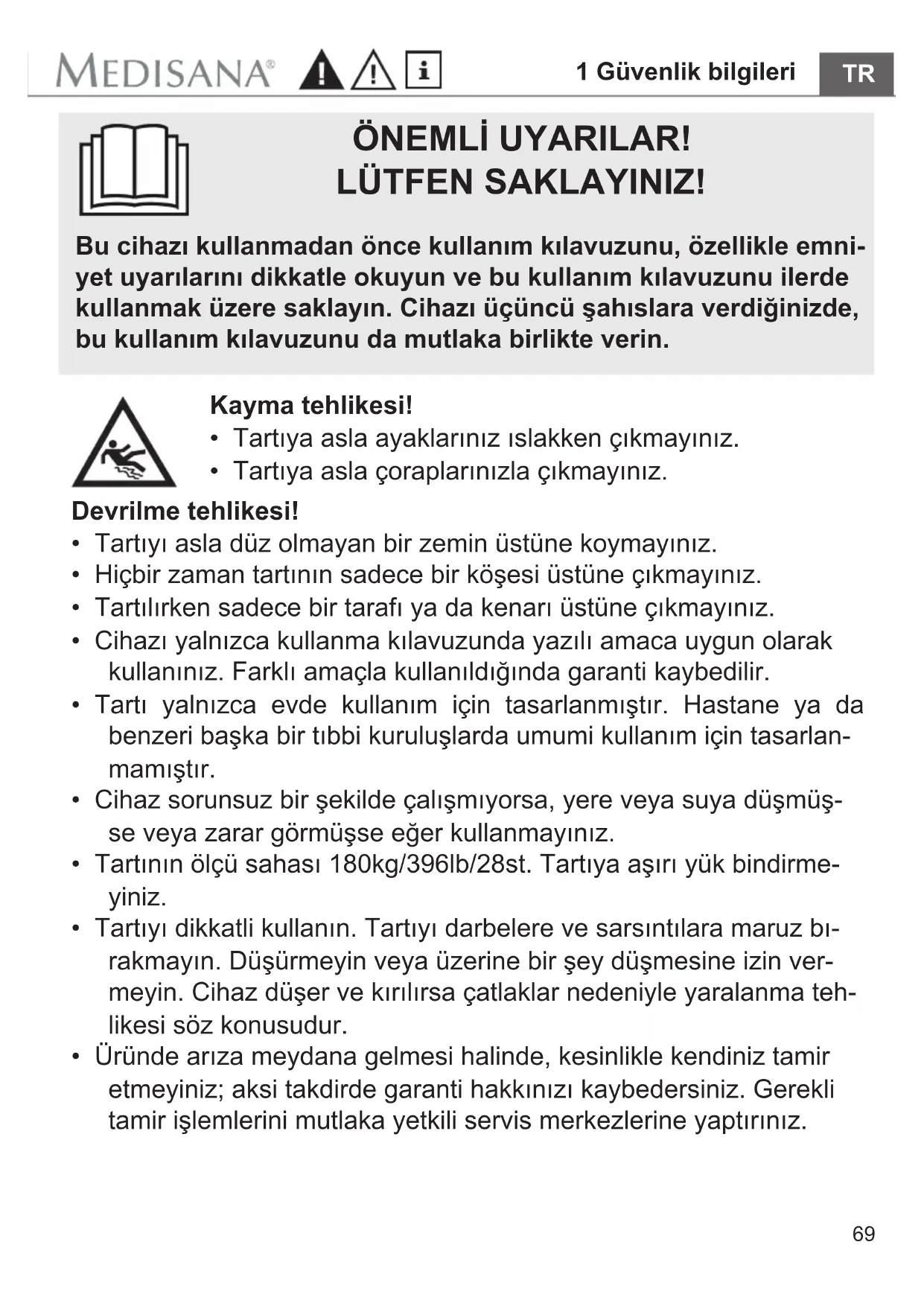 - Tartıya asla çoraplarınızla çıkmayınız. Devrilme tehlikesi!