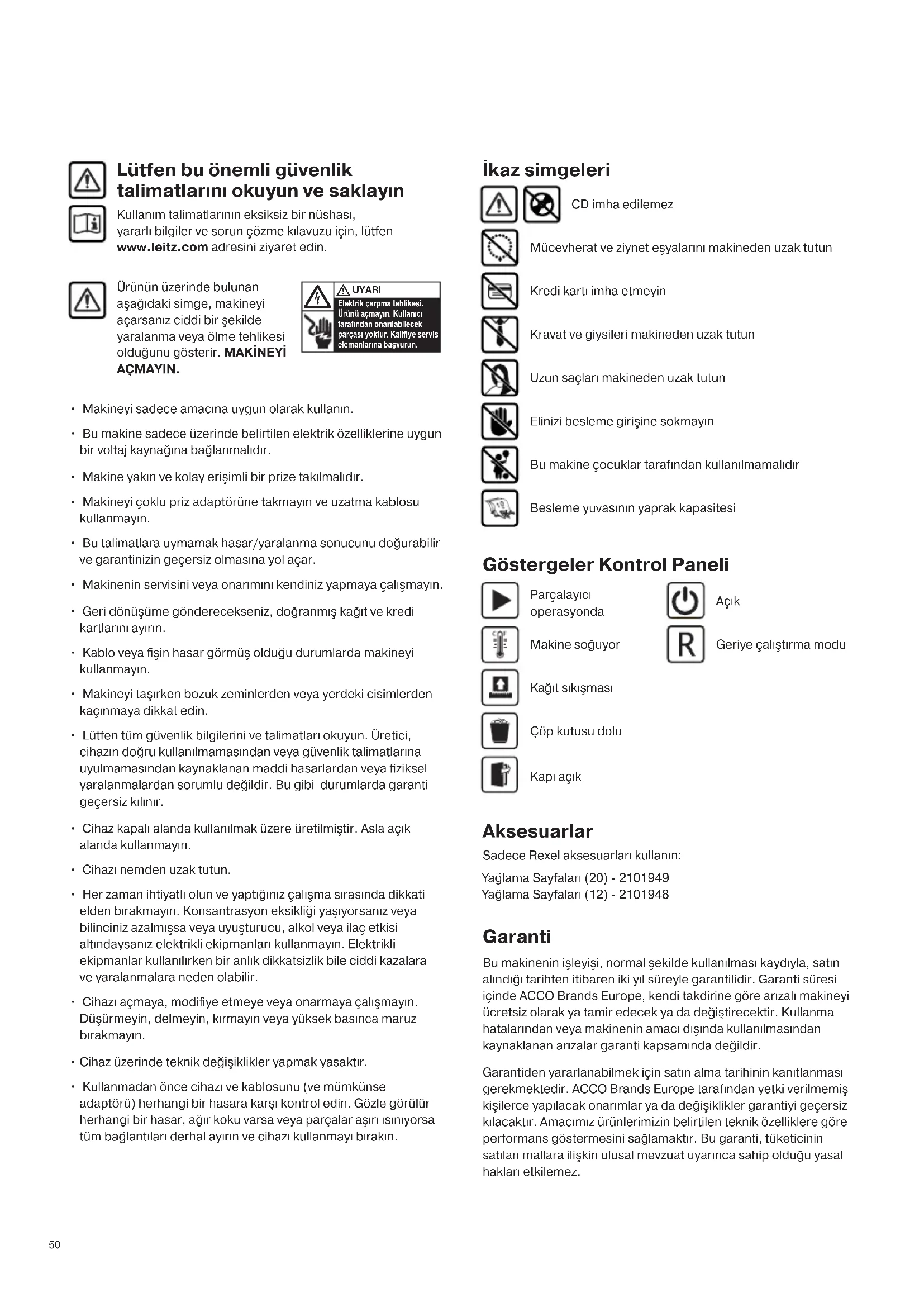 - Kullanmadan önce cihazı ve kablosunu (ve mümkünse adaptörü) herhangi bir hasara karşı kontrol edin. Gözle görülür herhangi bir hasar, ağır koku varsa veya parçalar aşırı ısınıyorsa tüm bağlantıları derhal ayırın ve cihazı kullanmayı bırakın. Lütfen bu önemli güvenlik talimatlarını okuyun ve saklayın Kullanım talimatlarının eksiksiz bir nüshası, yararlı bilgiler ve sorun çözme kılavuzu için, lütfen www.leitz.com adresini ziyaret edin. Uzun saçları makineden uzak tutun Mücevherat ve ziynet eşyalarını makineden uzak tutun Kravat ve giysileri makineden uzak tutun Kredi kartı imha etmeyin İkaz simgeleri Garanti Bu makinenin işleyişi, normal şekilde kullanılması kaydıyla, satın alındığı tarihten itibaren iki yıl süreyle garantilidir. Garanti süresi içinde ACCO Brands Europe, kendi takdirine göre arızalı makineyi ücretsiz olarak ya tamir edecek ya da değiştirecektir. Kullanma hatalarından veya makinenin amacı dışında kullanılmasından kaynaklanan arızalar garanti kapsamında değildir. Garantiden yararlanabilmek için satın alma tarihinin kanıtlanması gerekmektedir. ACCO Brands Europe tarafından yetki verilmemiş kişilerce yapılacak onarımlar ya da değişiklikler garantiyi geçersiz kılacaktır. Amacımız ürünlerimizin belirtilen teknik özelliklere göre performans göstermesini sağlamaktır. Bu garanti, tüketicinin satılan mallara ilişkin ulusal mevzuat uyarınca sahip olduğu yasal hakları etkilemez. Aksesuarlar Sadece Rexel aksesuarları kullanın: Yağlama Sayfaları (20) - 2101949 Yağlama Sayfaları (12) - 2101948 Göstergeler Kontrol Paneli Makine soğuyor Parçalayıcı operasyonda Geriye çalıştırma modu Bu makine çocuklar tarafından kullanılmamalıdır Elinizi besleme girişine sokmayın Besleme yuvasının yaprak kapasitesi CD imha edilemez Ürünün üzerinde bulunan aşağıdaki simge, makineyi açarsanız ciddi bir şekilde yaralanma veya ölme tehlikesi olduğunu gösterir. MAKİNEYİ AÇMAYIN. Elektrik çarpma tehlikesi. Ürünü açmayın. Kullanıcı tarafından onarılabilecek parçası yoktur. Kaliye servis elemanlarına başvurun. UYARI Kağıt sıkışması Açık Çöp kutusu dolu Kapı açık