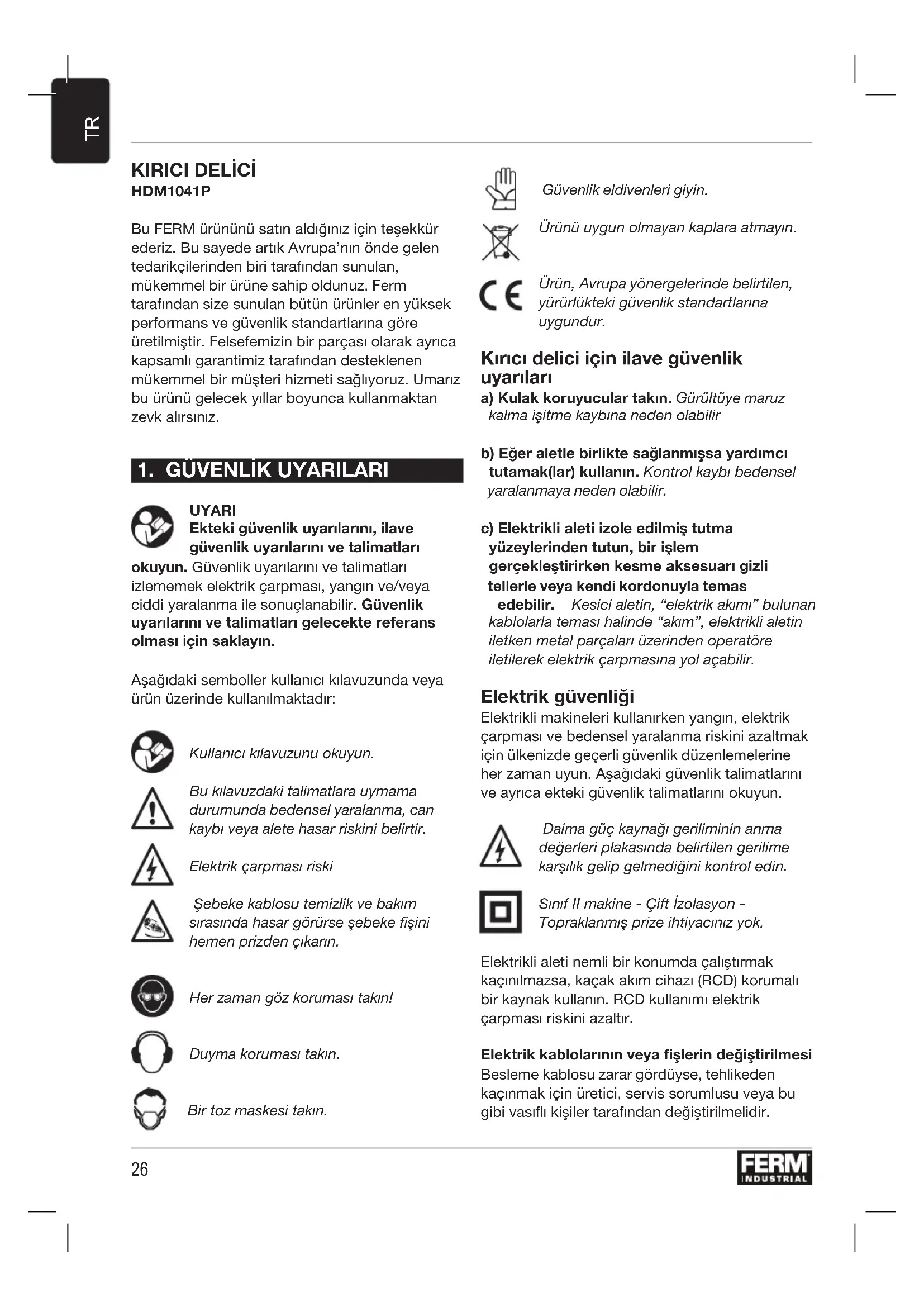 HDM1041P Bu FERM ürününü satın aldığınız için teşekkür ederiz. Bu sayede artık Avrupa’nın önde gelen tedarikçilerinden biri tarafından sunulan, mükemmel bir ürüne sahip oldunuz. Ferm tarafından size sunulan bütün ürünler en yüksek performans ve güvenlik standartlarına göre üretilmiştir. Felsefemizin bir parçası olarak ayrıca kapsamlı garantimiz tarafından desteklenen mükemmel bir müşteri hizmeti sağlıyoruz. Umarız bu ürünü gelecek yıllar boyunca kullanmaktan zevk alırsınız.
