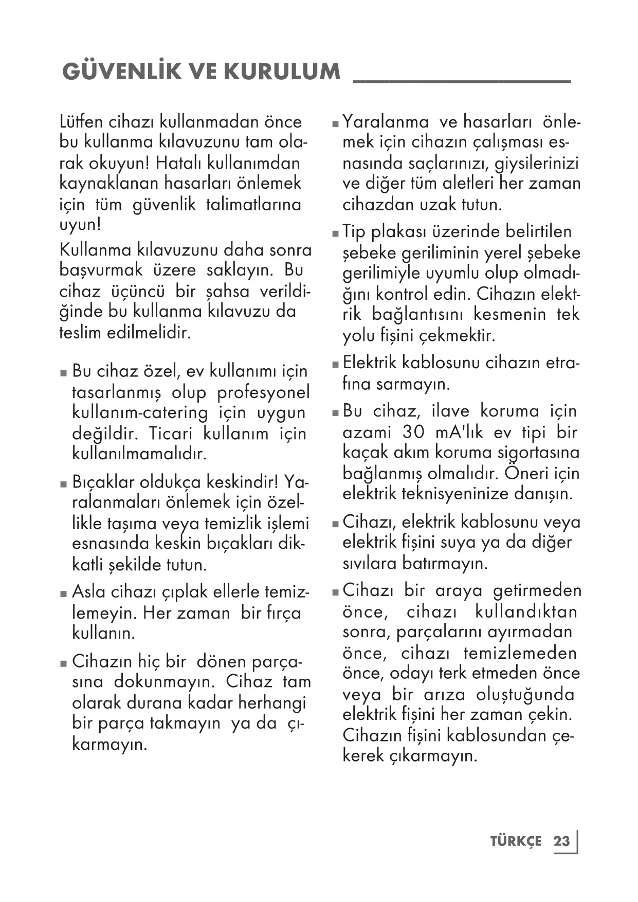 Cihazı ilk kez kullanmadan önce gıdalarla temas eden tüm parçaları dikkatli şekilde temiz- leyin.TÜRKÇE