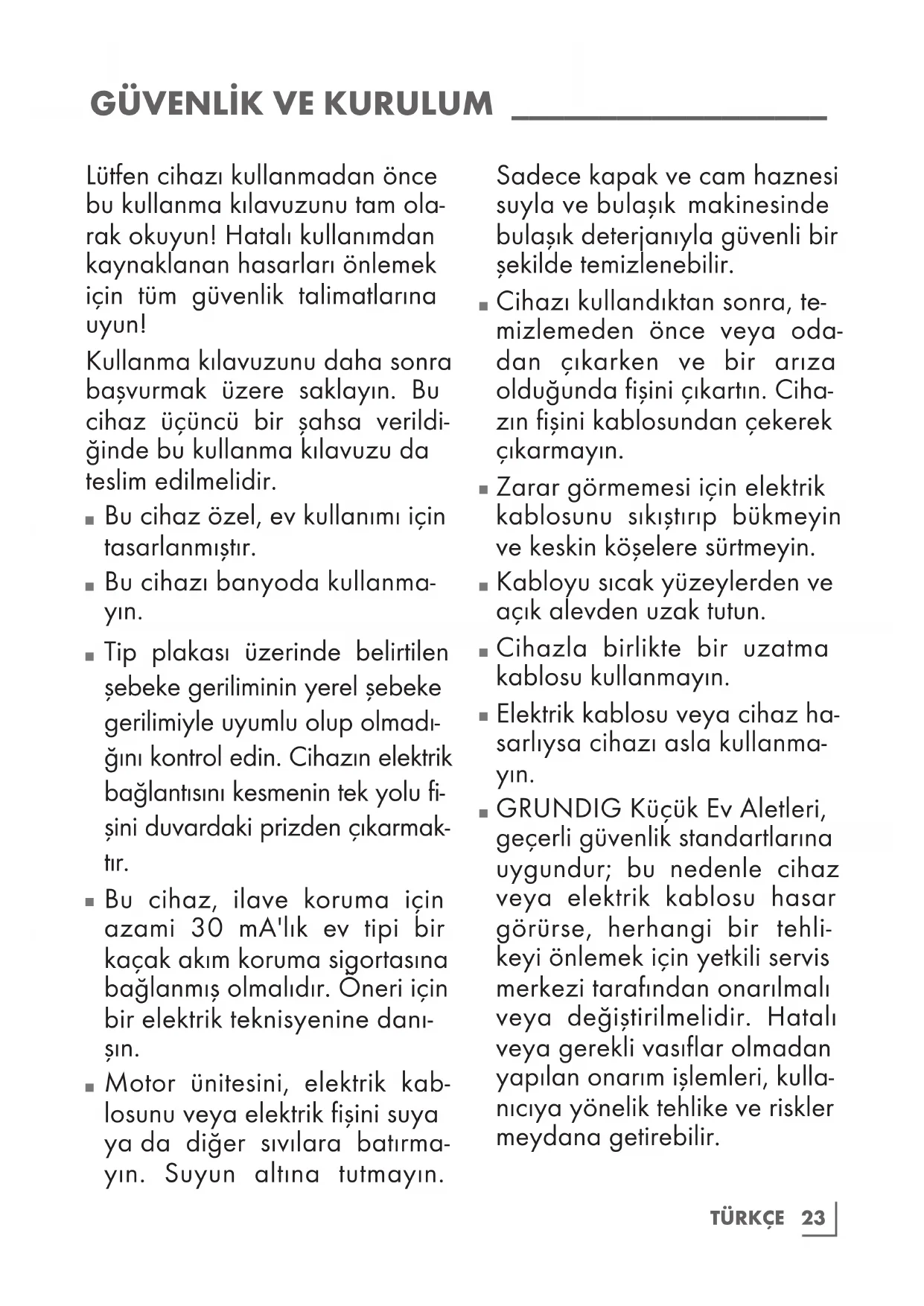 GRUNDIG Küçük Ev Aletleri, geçerli güvenlik standartlarına uygundur; bu nedenle cihaz veya elektrik kablosu hasar görürse, herhangi bir tehli- keyi önlemek için yetkili servis merkezi tarafından onarılmalı veya değiştirilmelidir. Hatalı veya gerekli vasıflar olmadan yapılan onarım işlemleri, kulla- nıcıya yönelik tehlike ve riskler meydana getirebilir.24
