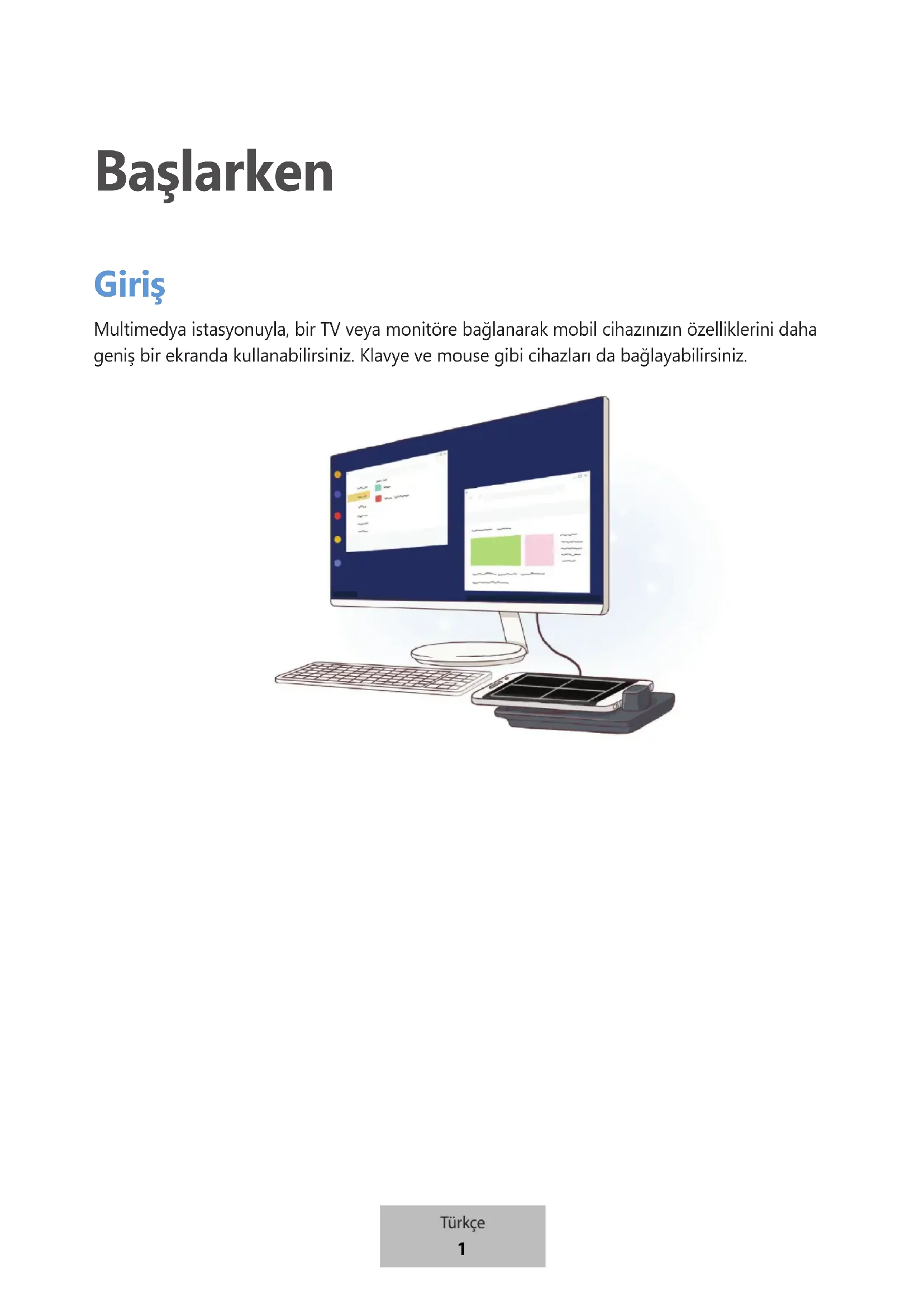 Başlarken Giriş Multimedya istasyonuyla, bir TV veya monitöre bağlanarak mobil cihazınızın özelliklerini daha geniş bir ekranda kullanabilirsiniz. Klavye ve mouse gibi cihazları da bağlayabilirsiniz. Türkçe 1Başlarken