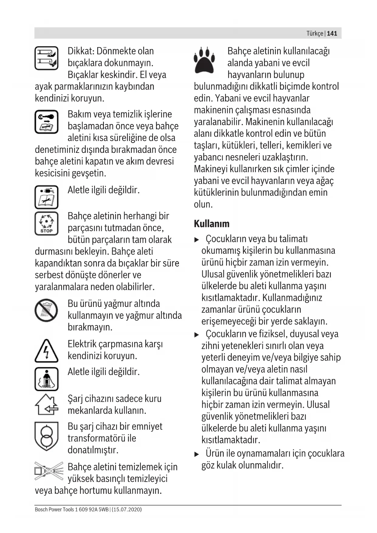 Τα μηχανήματα κήπου, οι μπαταρίες, τα εξαρτήματα και οι συσκευασίες πρέπει να ανακυκλώνονται με τρόπο φιλικό προς το περιβάλλον. Μην ρίξετε τα μηχανήματα κήπου και τις μπαταρίες στα απορρίμματα του σπιτιού σας! Μόνο για χώρες τηςΕΕ: Σύμφωνα με την Κοινοτική Οδηγία 2012/19/EE οι άχρηστες ηλεκτρικές και ηλεκτρονικές συσκευές και σύμφωνα με την Κοινοτική Οδηγία 2006/66/EΚ οι χαλασμένες ή αναλωμένες μπαταρίες πρέπει να συλλέγονται ξεχωριστά για να ανακυκλωθούν με τρόπο φιλικό προς το περιβάλλον. Μπαταρίες/Επαναφορτιζόμενες μπαταρίες: Μπαταρίες ιόντων λιθίου: Παρακαλούμε δώστε προσοχή στο κεφάλαιο Μεταφορά. Türkçe Güvenlik Talimatı Dikkat! Aşağıdaki talimatı dikkatlice okuyun. Kumanda elemanlarının işlevini ve ürünün usulüne uygun olarak kullanılmasını öğrenin. Bu kullanım kılavuzunu ileride başvurmak üzere güvenli bir yerde saklayın. Bahçe aleti üzerindeki sembollerin açıklaması Genel tehlike uyarısı. Kullanım kılavuzunu tam olarak okuyun. Çalışırken yakınınızda duran kişilerin etrafa savrulan yabancı cisimlerle yaralanmamasına dikkat edin. Uyarı: Ürün çalışır durumda iken aletle aranızda güvenli bir mesafe bırakın. 1 609 92A 5WB | (15.07.2020) Bosch Power ToolsTürkçe | 141 Dikkat: Dönmekte olan bıçaklara dokunmayın. Bıçaklar keskindir. El veya ayak parmaklarınızın kaybından kendinizi koruyun. Bakım veya temizlik işlerine başlamadan önce veya bahçe aletini kısa süreliğine de olsa denetiminiz dışında bırakmadan önce bahçe aletini kapatın ve akım devresi kesicisini gevşetin. Aletle ilgili değildir. Bahçe aletinin herhangi bir parçasını tutmadan önce, bütün parçaların tam olarak durmasını bekleyin. Bahçe aleti kapandıktan sonra da bıçaklar bir süre serbest dönüşte dönerler ve yaralanmalara neden olabilirler. Bu ürünü yağmur altında kullanmayın ve yağmur altında bırakmayın. Elektrik çarpmasına karşı kendinizi koruyun. Aletle ilgili değildir. Şarj cihazını sadece kuru mekanlarda kullanın. Bu şarj cihazı bir emniyet transformatörü ile donatılmıştır. Bahçe aletini temizlemek için yüksek basınçlı temizleyici veya bahçe hortumu kullanmayın. Bahçe aletinin kullanılacağı alanda yabani ve evcil hayvanların bulunup bulunmadığını dikkatli biçimde kontrol edin. Yabani ve evcil hayvanlar makinenin çalışması esnasında yaralanabilir. Makinenin kullanılacağı alanı dikkatle kontrol edin ve bütün taşları, kütükleri, telleri, kemikleri ve yabancı nesneleri uzaklaştırın. Makineyi kullanırken sık çimler içinde yabani ve evcil hayvanların veya ağaç kütüklerinin bulunmadığından emin olun. Kullanım u Çocukların veya bu talimatı okumamış kişilerin bu kullanmasına ürünü hiçbir zaman izin vermeyin. Ulusal güvenlik yönetmelikleri bazı ülkelerde bu aleti kullanma yaşını kısıtlamaktadır. Kullanmadığınız zamanlar ürünü çocukların erişemeyeceği bir yerde saklayın. u Çocukların ve fiziksel, duyusal veya zihni yetenekleri sınırlı olan veya yeterli deneyim ve/veya bilgiye sahip olmayan ve/veya aletin nasıl kullanılacağına dair talimat almayan kişilerin bu ürünü kullanmasına hiçbir zaman izin vermeyin. Ulusal güvenlik yönetmelikleri bazı ülkelerde bu aleti kullanma yaşını kısıtlamaktadır. u Ürün ile oynamamaları için çocuklara göz kulak olunmalıdır. Bosch Power Tools 1 609 92A 5WB | (15.07.2020)142 | Türkçe u Bahçe aletini özellikle çocukların ve evcil hayvanların çok yakınında kullanmayın. u Bu aleti kullananlar başkalarının başına gelebilecek kazalardan veya bunların özel mülkiyetinde bulunan mallarda meydana gelebilecek hasarlardan sorumludur. u Bu ürünü kullanırken açık lastik ayakkabılar veya sandaletler kullanmayın. Sağlam iş ayakkabıları ve uzun pantolon kullanın. Bu ürünü hiçbir zaman çıplak ayakla kullanmayın. u İşleyeceğiniz yüzeyi dikkatli biçimde inceleyin ve taş, dal, tel, kemik ve benzeri yabancı nesneleri temizleyin. u Aleti kullanmaya başlamadan önce daima bıçakların, bıçak cıvatalarının veya kesme modülünün aşınmış veya hasarlı olup olmadığını kontrol edin. Balanssız çalışmayı önlemek için aşınmış veya hasar görmüş bıçakları ve bıçak cıvatalarını her zaman takım halinde değiştirin. u Sadece gün ışığında veya iyi aydınlatma koşullarında biçme yapın. u Elverişsiz hava koşullarında, özellikle fırtına ve sağanak yağış beklenirken çim biçme makinesi ile çalışmayın. u Bahçe aletini mümkün olduğu kadar ıslak çimlerde kullanmayın. u Her zaman sakin çalışın, acele etmeyin. u Bahçe aletini arızalı koruma donanımlarıyla, kapaklarla ve örneğin çarpma emniyeti ve/veya çim tutma selesi gibi emniyet donanımları olmadan kullanmayın. u Kendi sağlığınız açısından koruyucu kulaklık kullanmanızı tavsiye ederiz. u Yorgun veya hastaysanız veya alkol, hap veya aldığınız ilaçların etkisi altındaysanız ürünü kullanmayın. u Meyilli yüzeylerde çalışmak tehlikeli olabilir: –Çok meyilli yüzeylerde biçme yapmayın. –Meyilli yüzeylerde veya ıslak çimlerde yere sağlam basmaya dikkat edin. –Dik yüzeylerde her zaman enine biçme yapın, aşağı yukarı yapmayın. –Dik yerlerde yön değiştirirken özellikle dikkatli olun. u Geriye doğru giderken veya bahçe aletini çekerken çok dikkatli olun. u Biçme yaparken bahçe aletini d