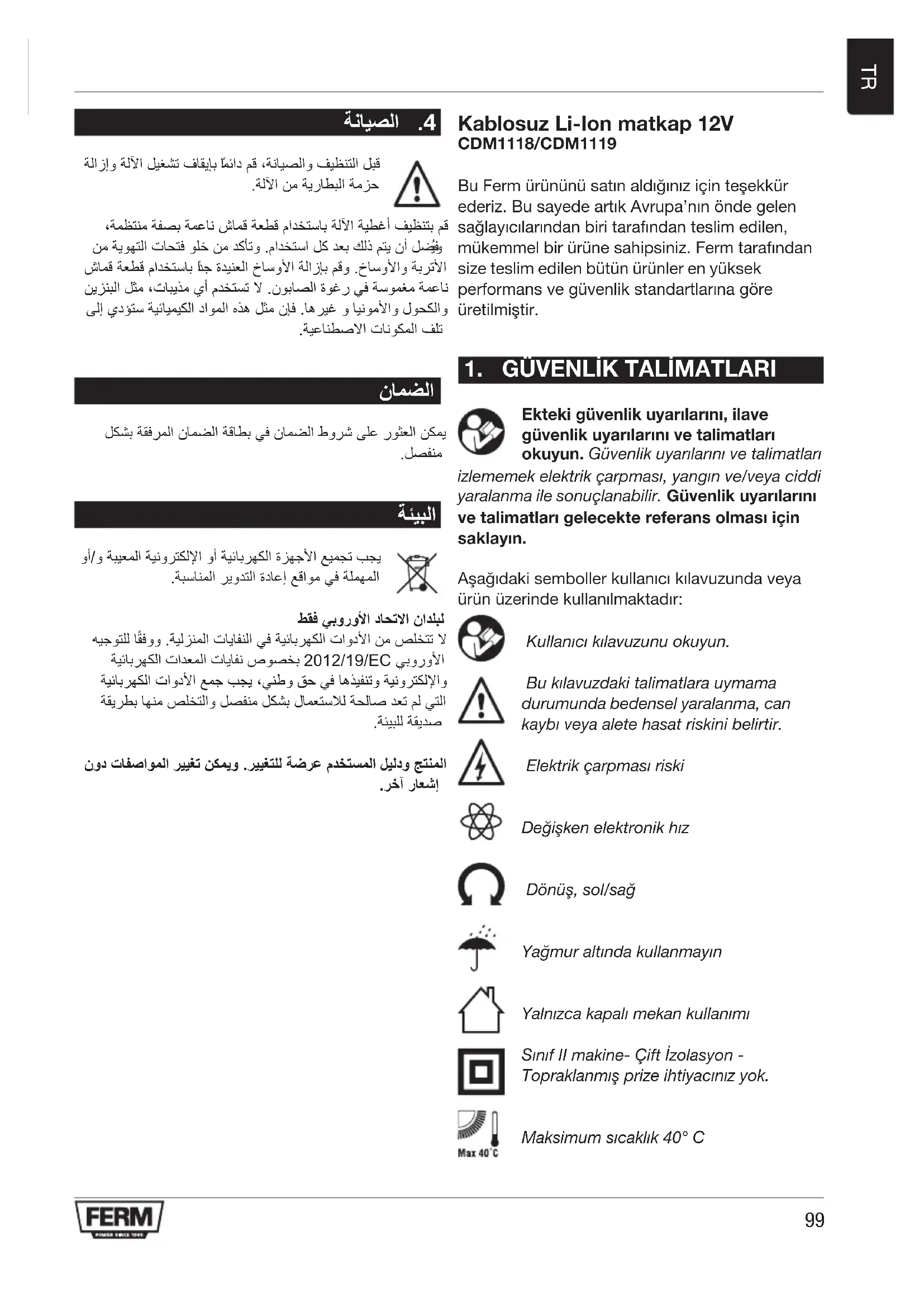 Kablosuz Li-Ion matkap 12V CDM1118/CDM1119 BuFermürününüsatınaldığınıziçinteşekkür ederiz.BusayedeartıkAvrupa’nınöndegelen sağlayıcılarındanbiritarafındanteslimedilen, mükemmelbirürünesahipsiniz.Fermtarafından size teslim edilen bütün ürünler en yüksek performansvegüvenlikstandartlarınagöre üretilmiştir.