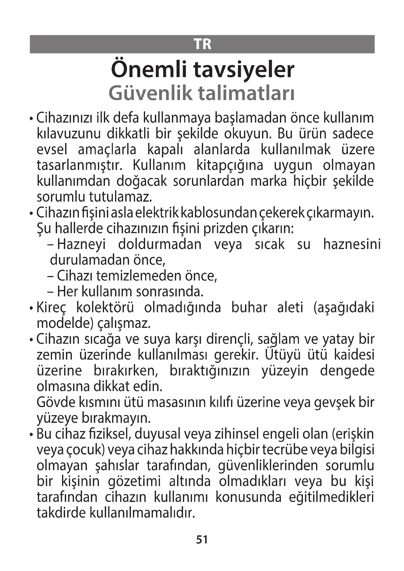 - Bu cihaz 8 yaş ve üzeri çocuklar ve cihaz hakkında hiçbir tecrübe veya bilgisi olmayan şahıslar tarafından, güvenliklerinden sorumlu bir kişinin gözetimi altında bulunmaları veya bu kişi tarafından cihazın kullanımı konusunda eğitilmeleri koşuluyla kullanılabilir. Çocuklar cihaz ile oynamamalıdır. Çocukların bir yetişkinin gözetimi olmadan cihazı temizlemelerine veya bakımını gerçekleştirmelerine izin verilmemelidir. Ütüyü ve kablosunu, çalışırken veya soğuma sırasında 8 yaşından küçük çocukların ulaşamayacakları yerlerde muhafaza edin.