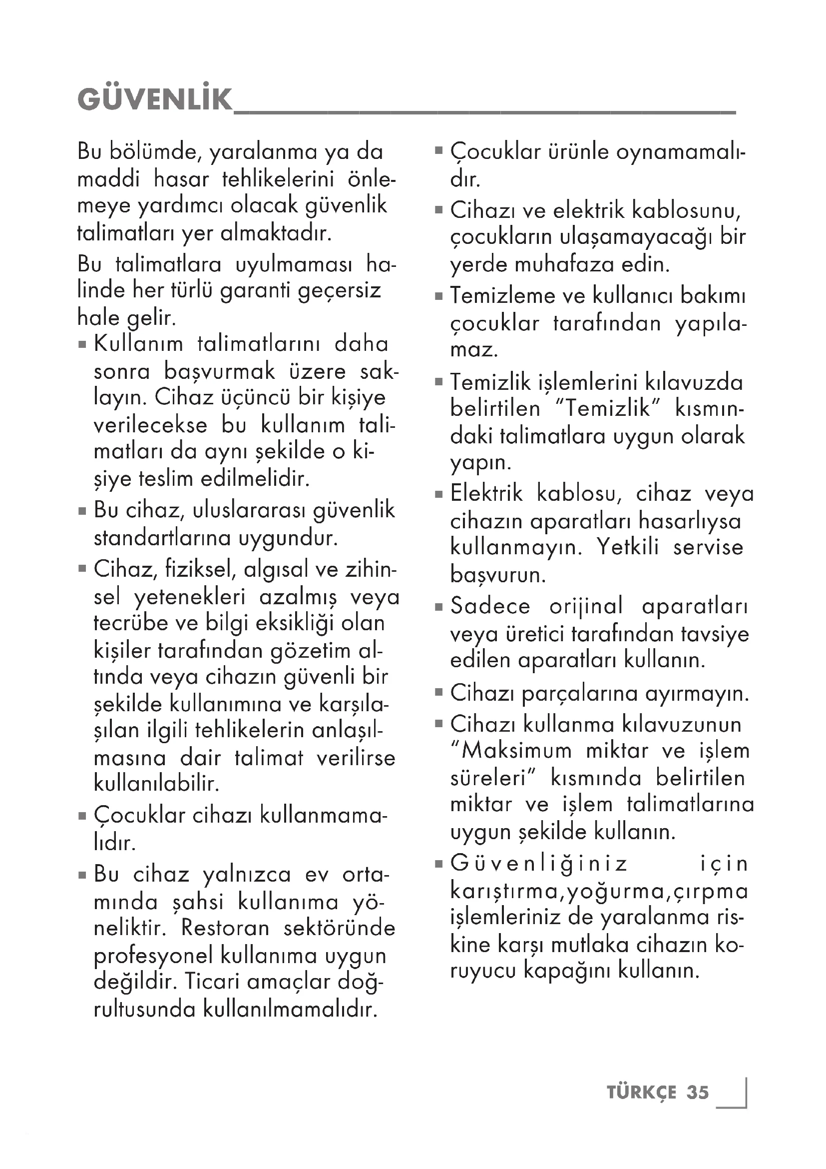 Puissance : 1 000 W Modifications relatives à la technique et à la conception réservées !TÜRKÇE 35 Bu bölümde, yaralanma ya da maddi hasar tehlikelerini önle- meye yardımcı olacak güvenlik talimatları yer almaktadır. Bu talimatlara uyulmaması ha- linde her türlü garanti geçersiz hale gelir.